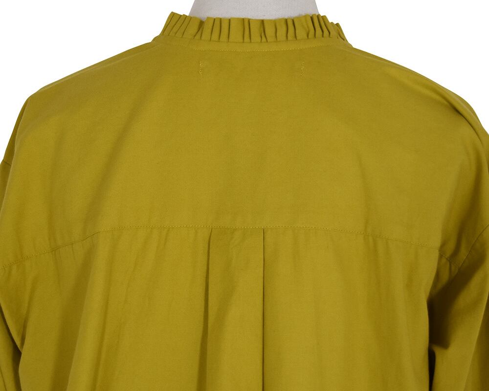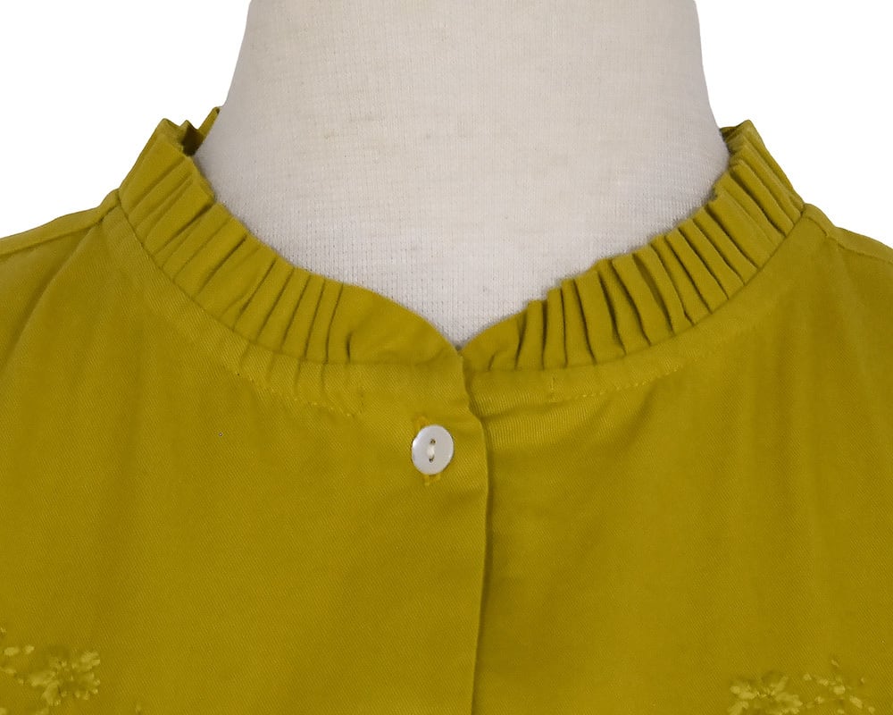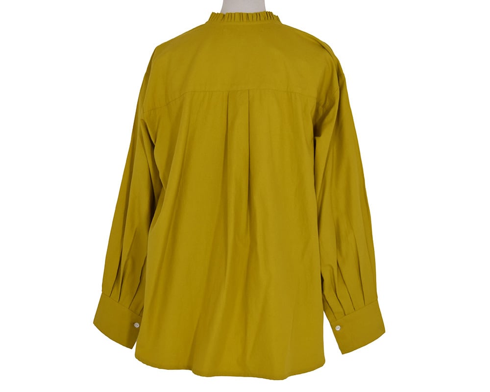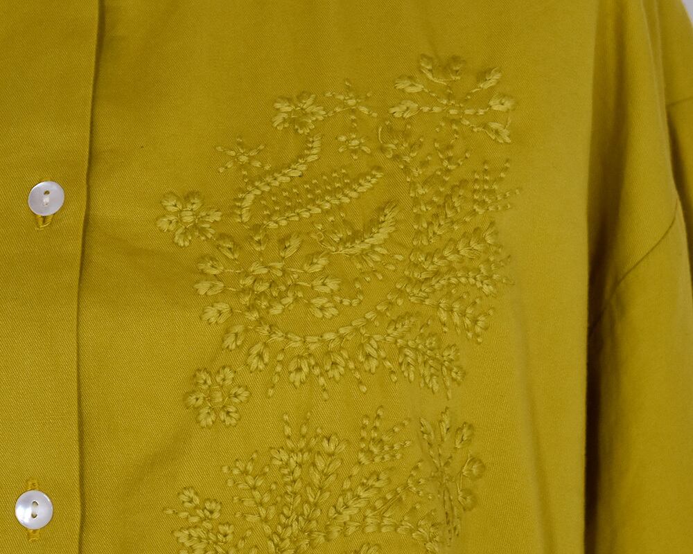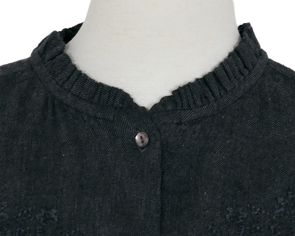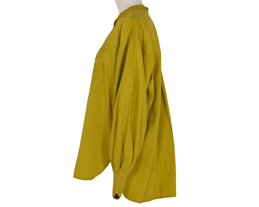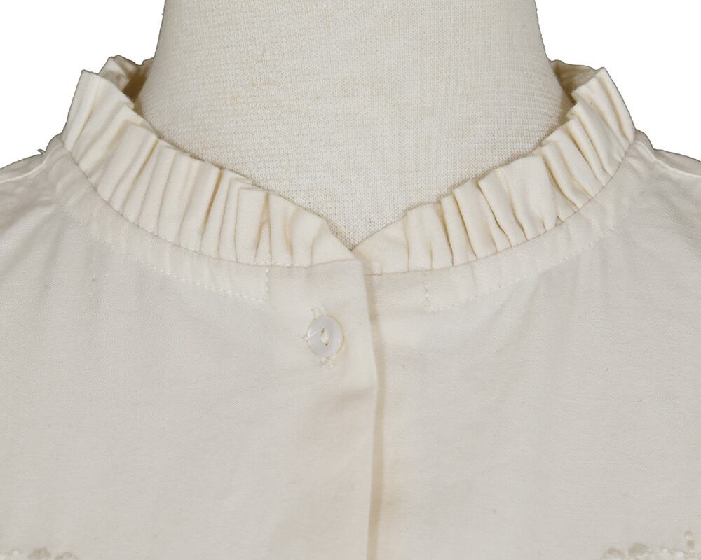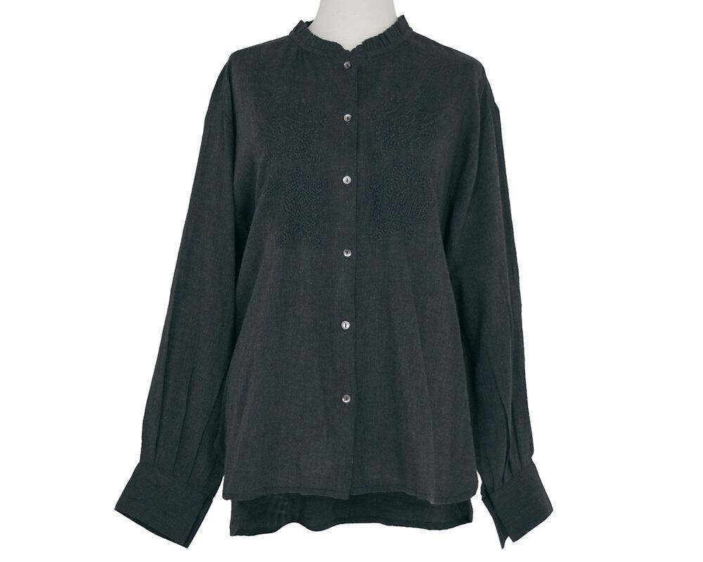胸元に曲線的な草花をモチーフにした刺繍を施したフリルカラーブラウスです。一枚で着用するのはもちろん、ニットのインに重ねて衿を覗かせたり、羽織りにしたりと汎用性が高く華やかで、コーディネートのアクセントになる一枚です。