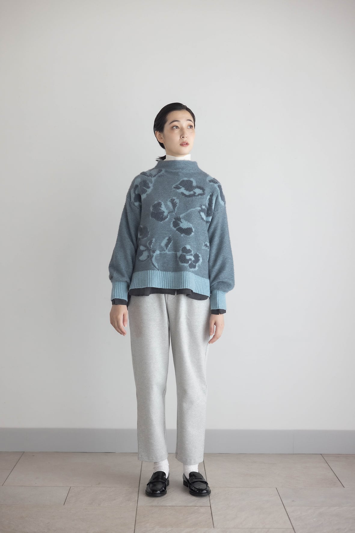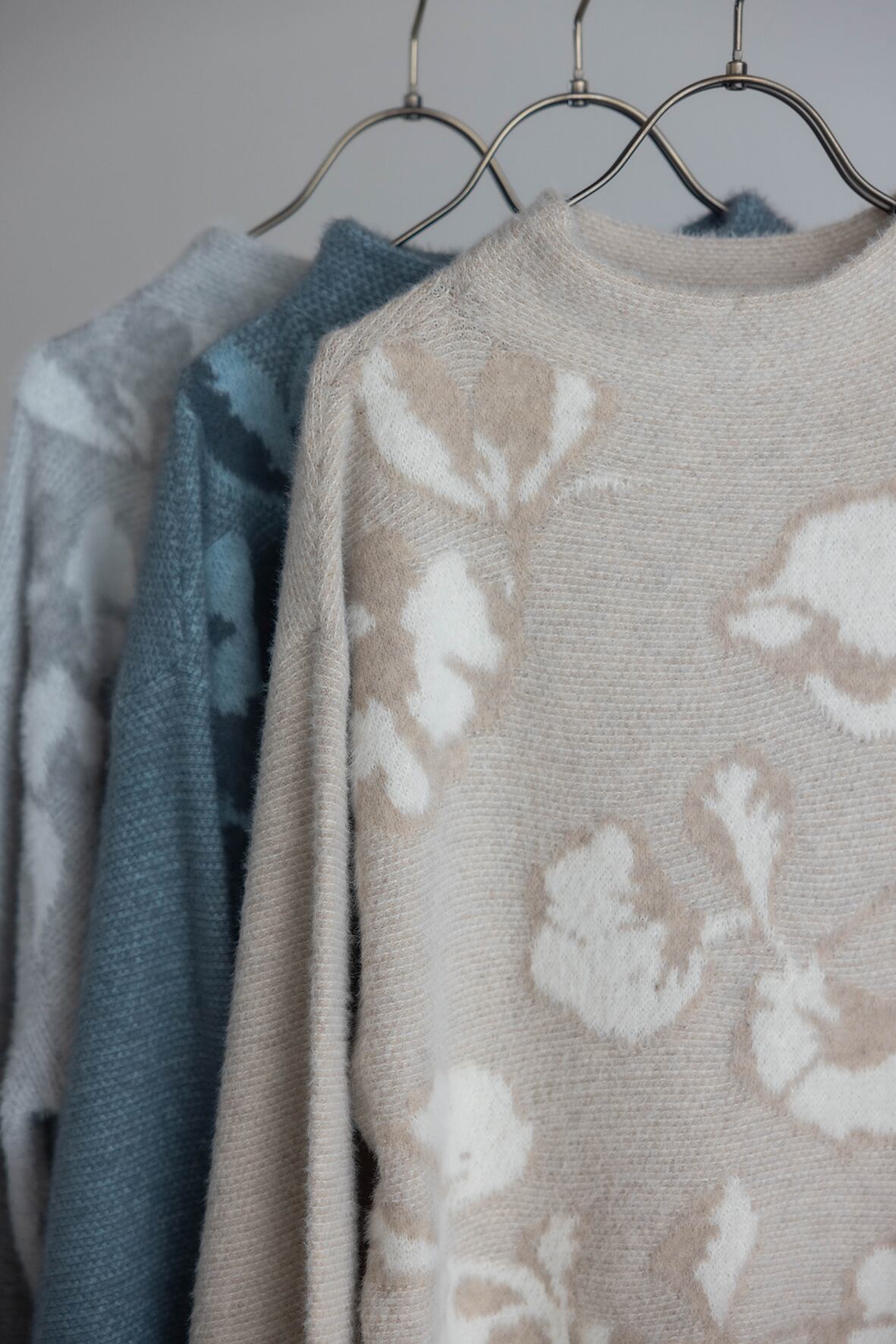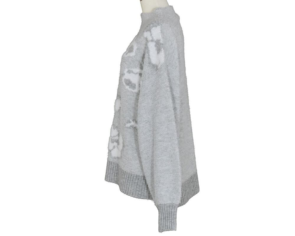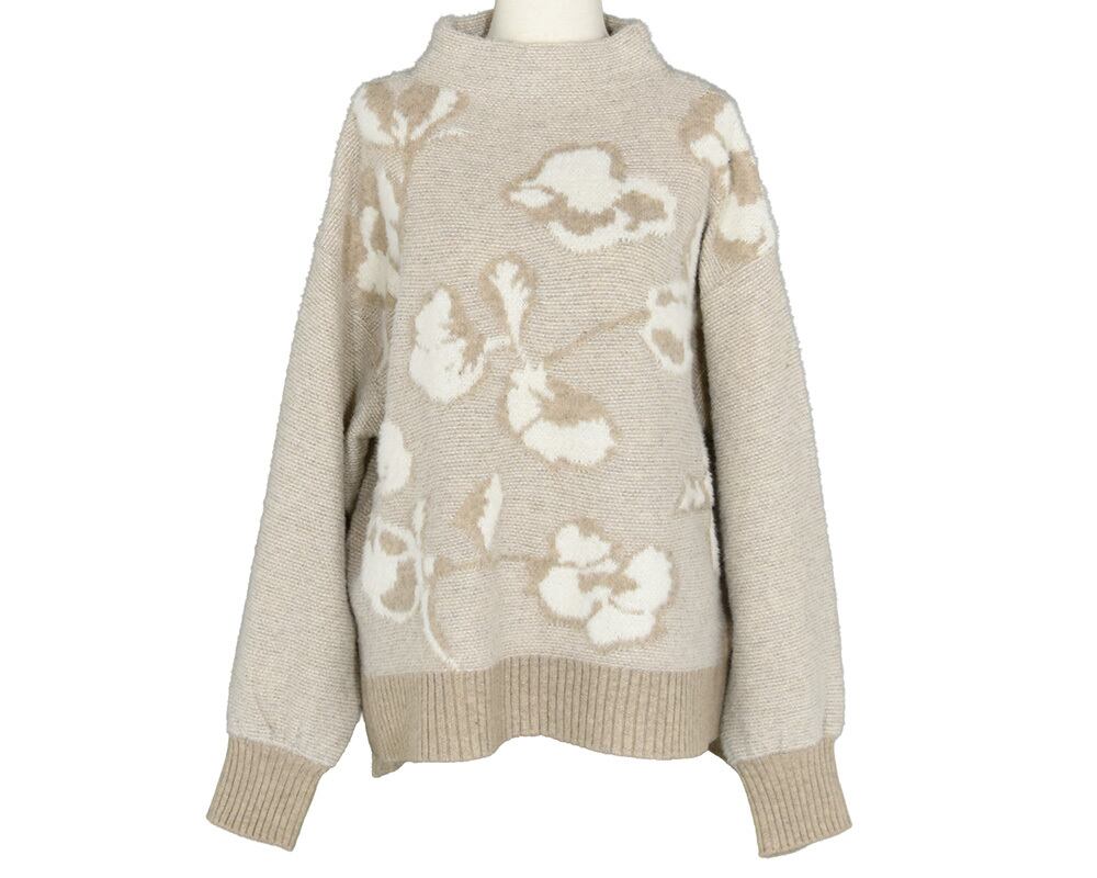 軽くふわふわと柔らかい素材で、前身頃が花柄ジャカード編みのプルオーバーです。立体感のあるボトルネックやボリュームのある袖が女性らしく、一枚で華やかに着ていただけます。花柄はこの季節に咲く、山茶花をイメージしています。