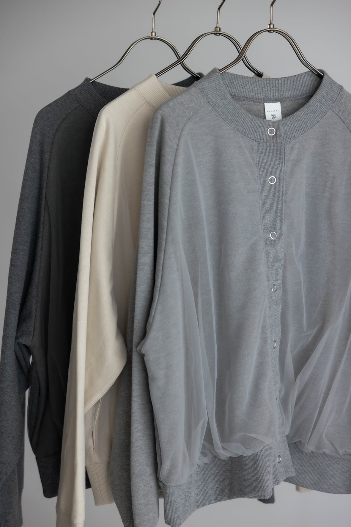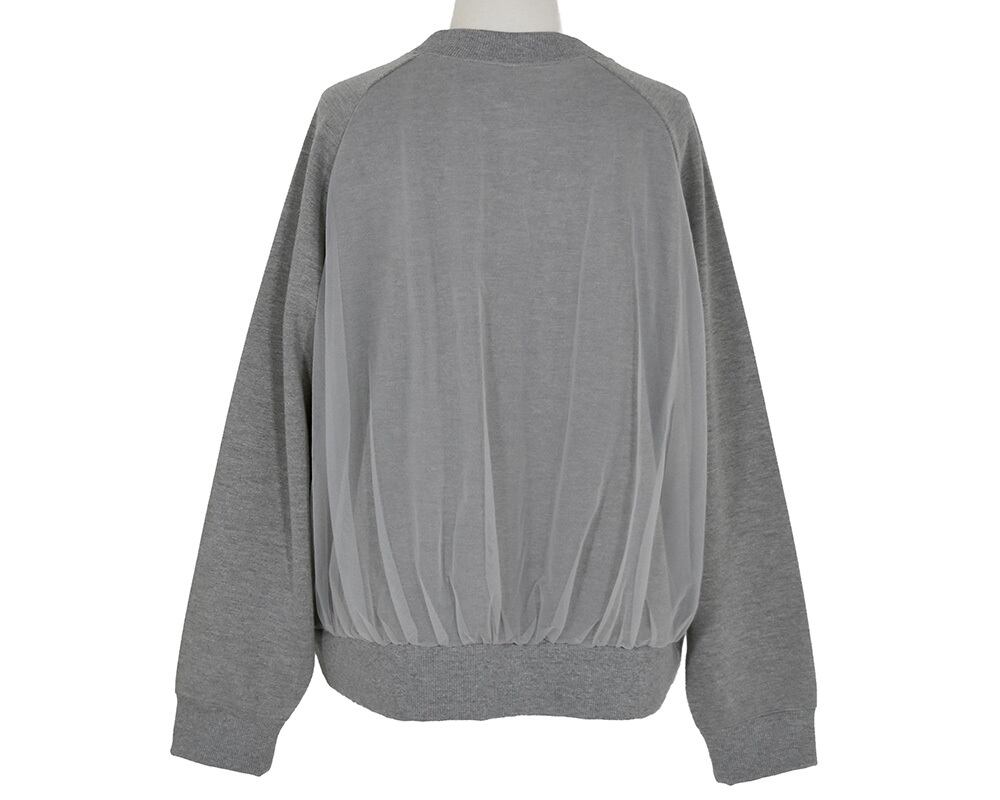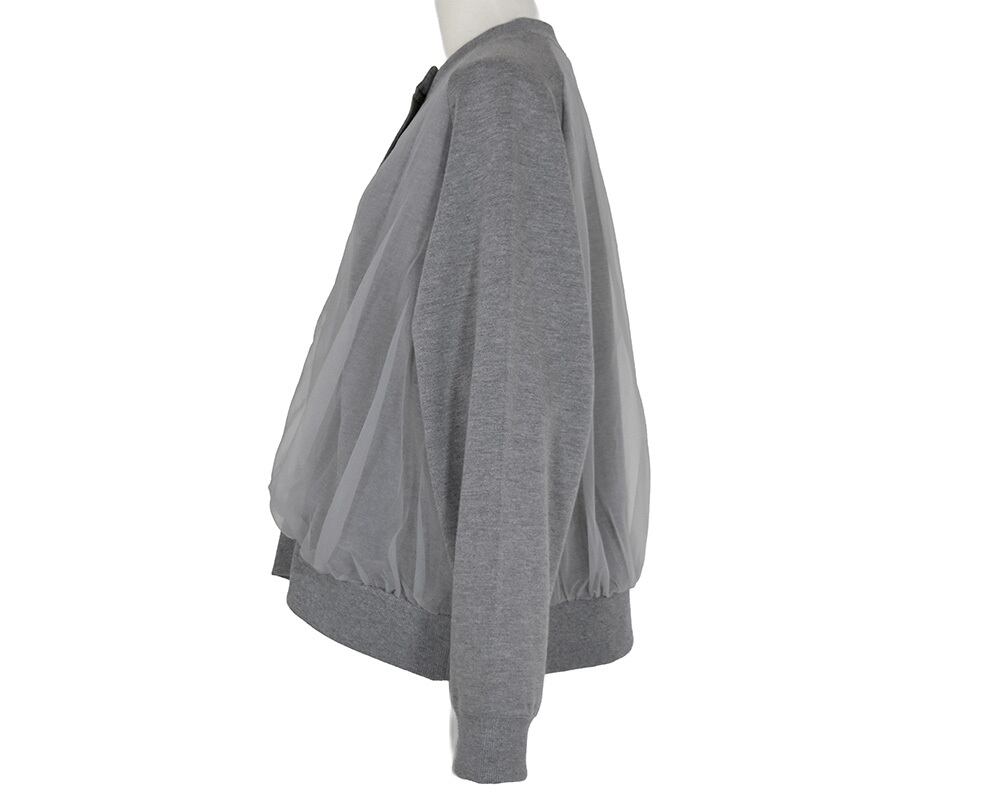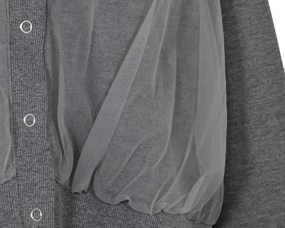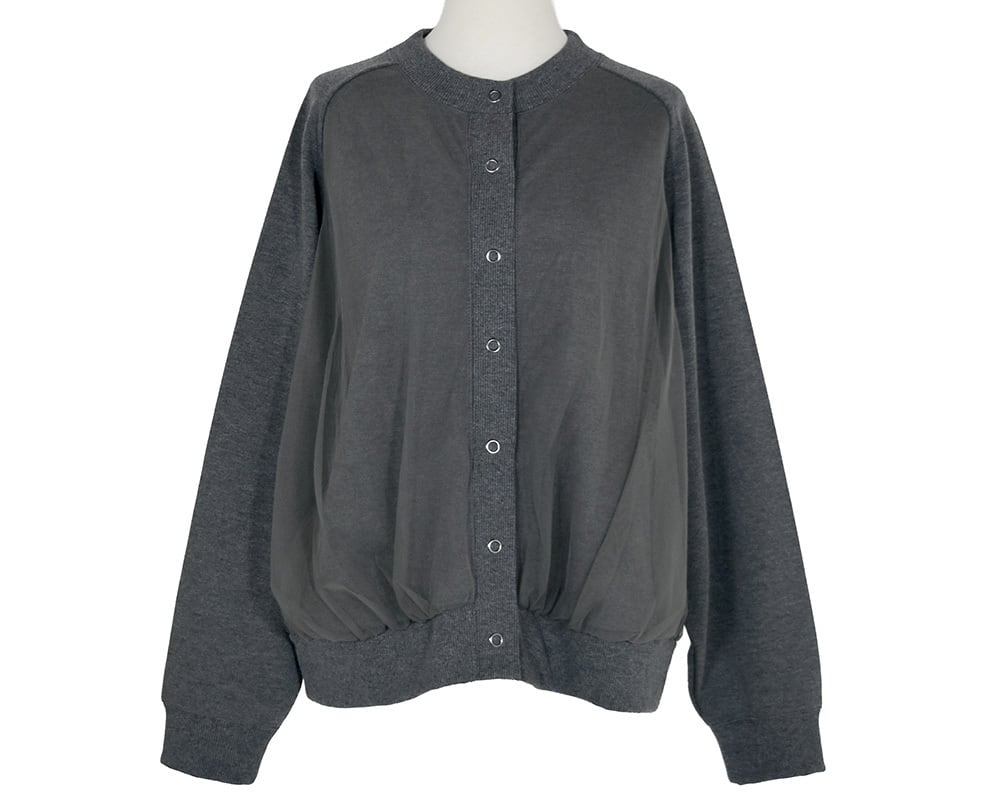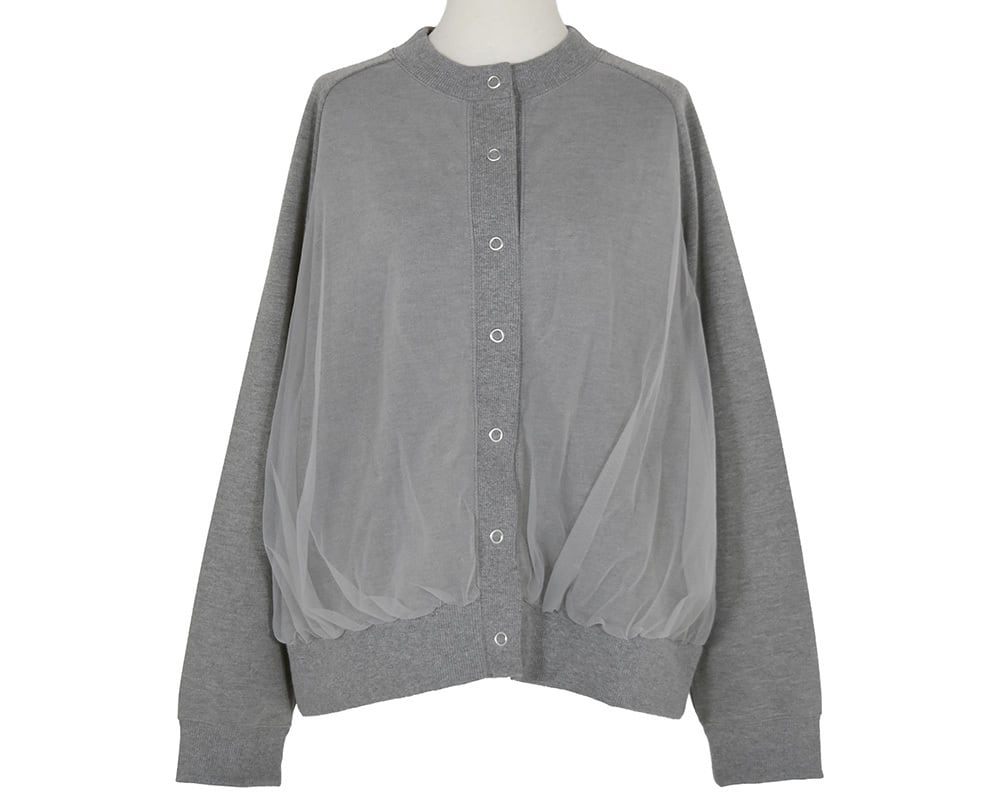 裏起毛カットソーの身頃にチュールを重ねたカーディガンです。同色系のチュールなので馴染みがよく、トレンド感がありつつ着こなしにニュアンスを加えてくれるアイテムです。両脇シームポケットあり。