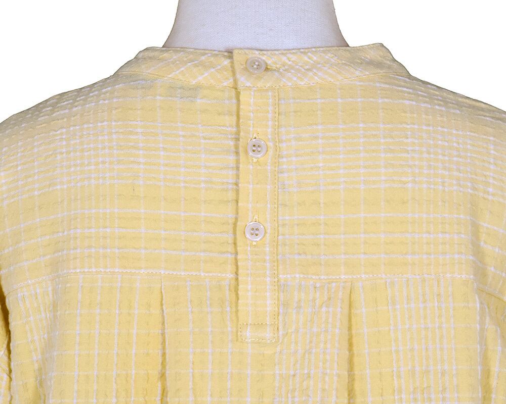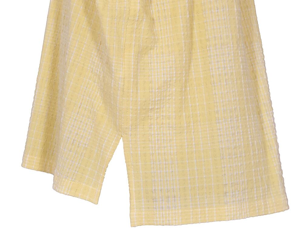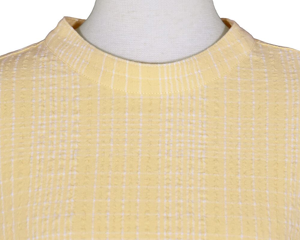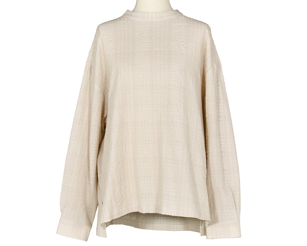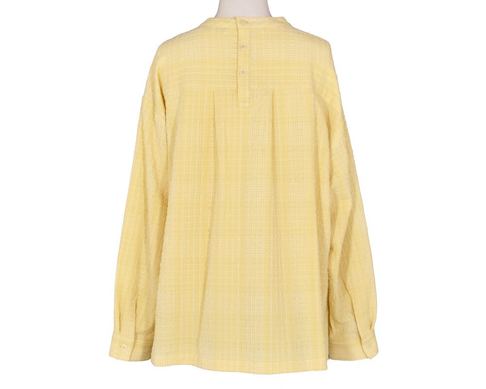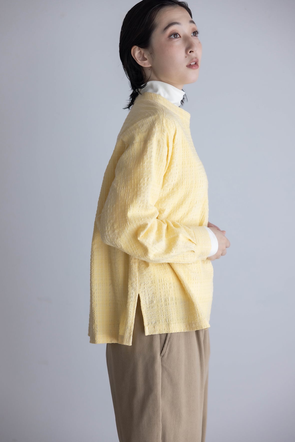 明るいカラーの先染めチェック柄が春らしさを感じる、プルオーバーブラウスです。衿元は詰まり過ぎないスタンドカラーなので、インにSJCW5621の接結天竺ハイネックプルオーナーを重ねる着こなしなどもおすすめです。