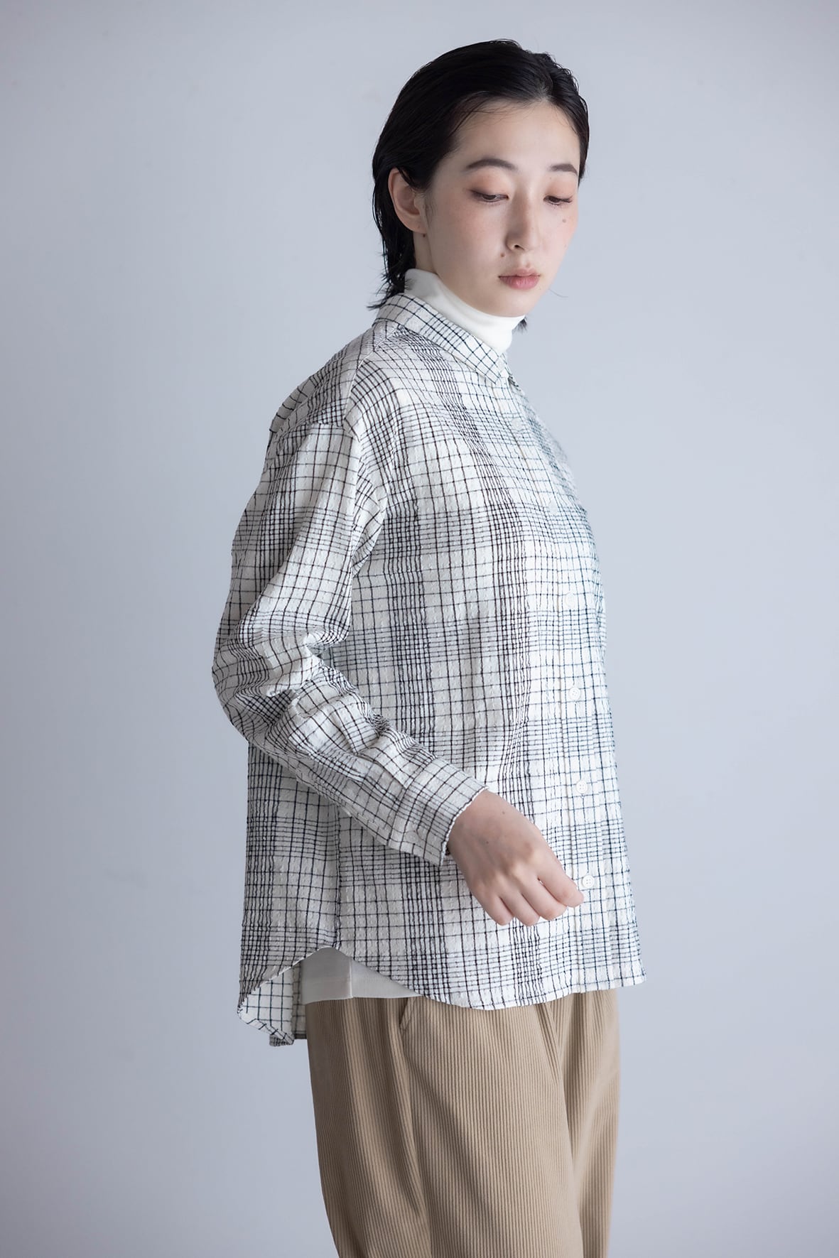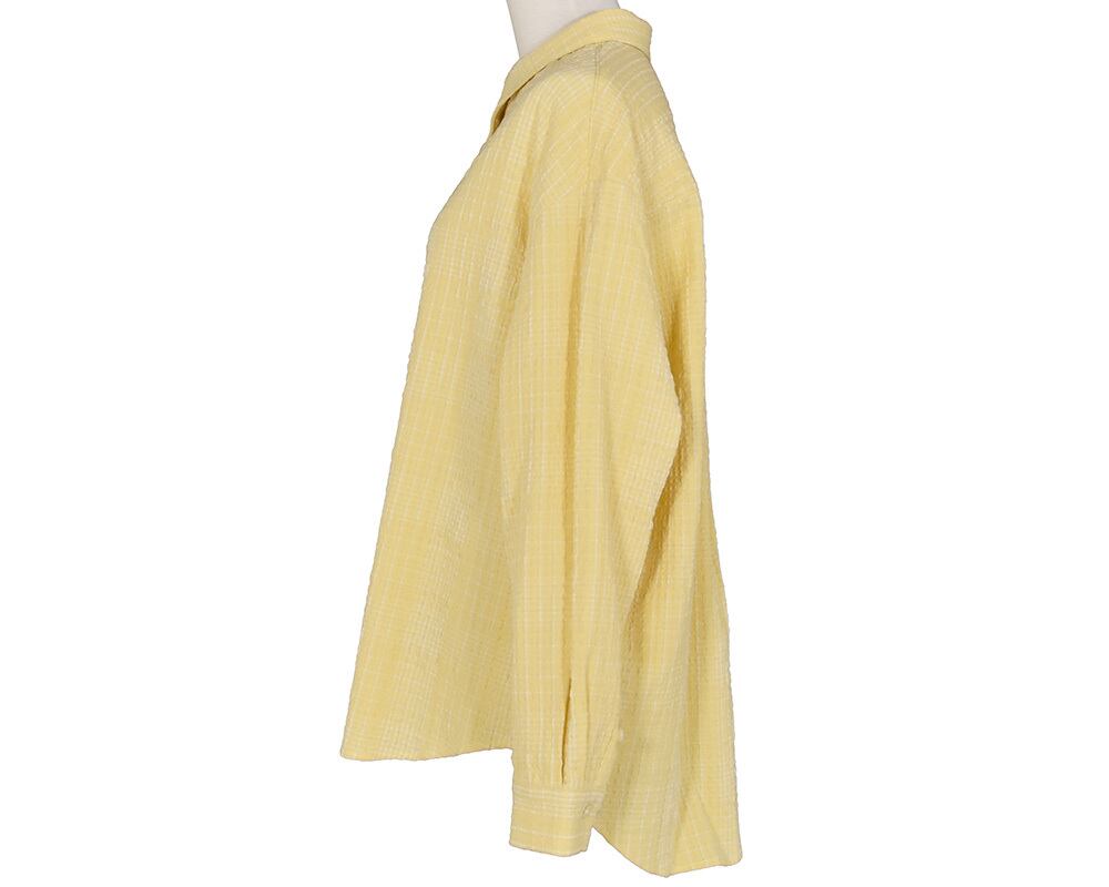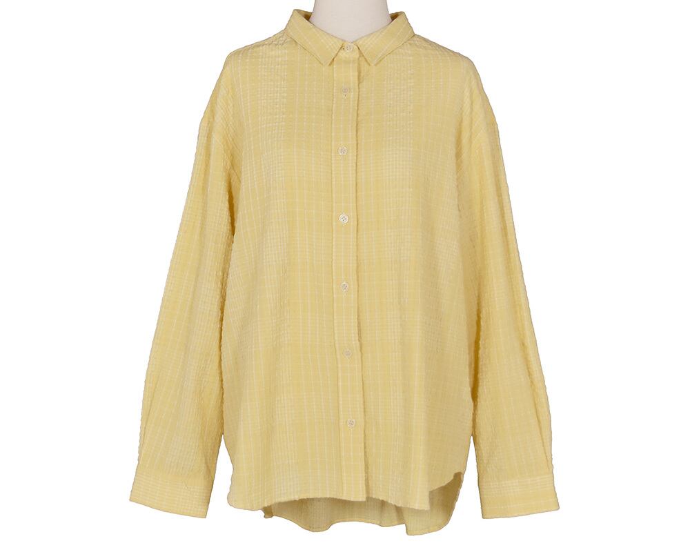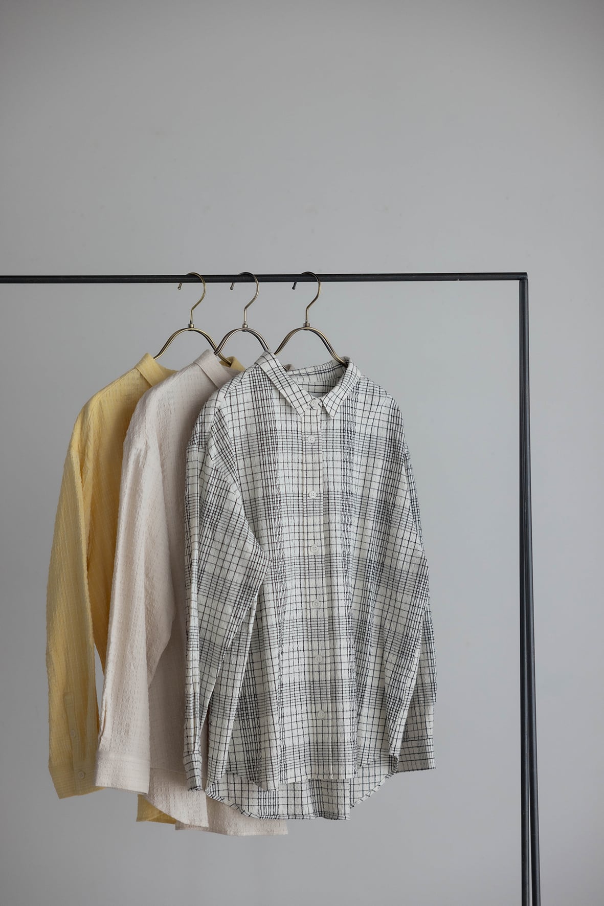 明るいカラーの先染めチェック柄が春らしさを感じる、シャツカラーのブラウスです。コンパクトなシャツ衿が、シャープになり過ぎずナチュラルな印象です。