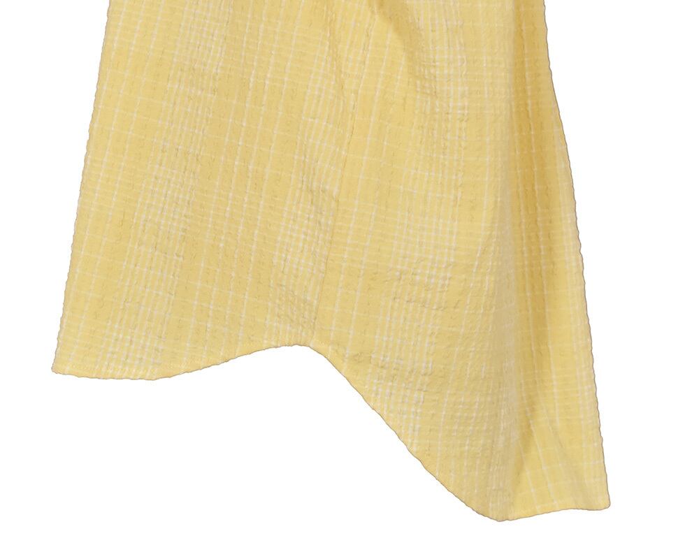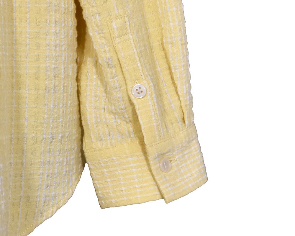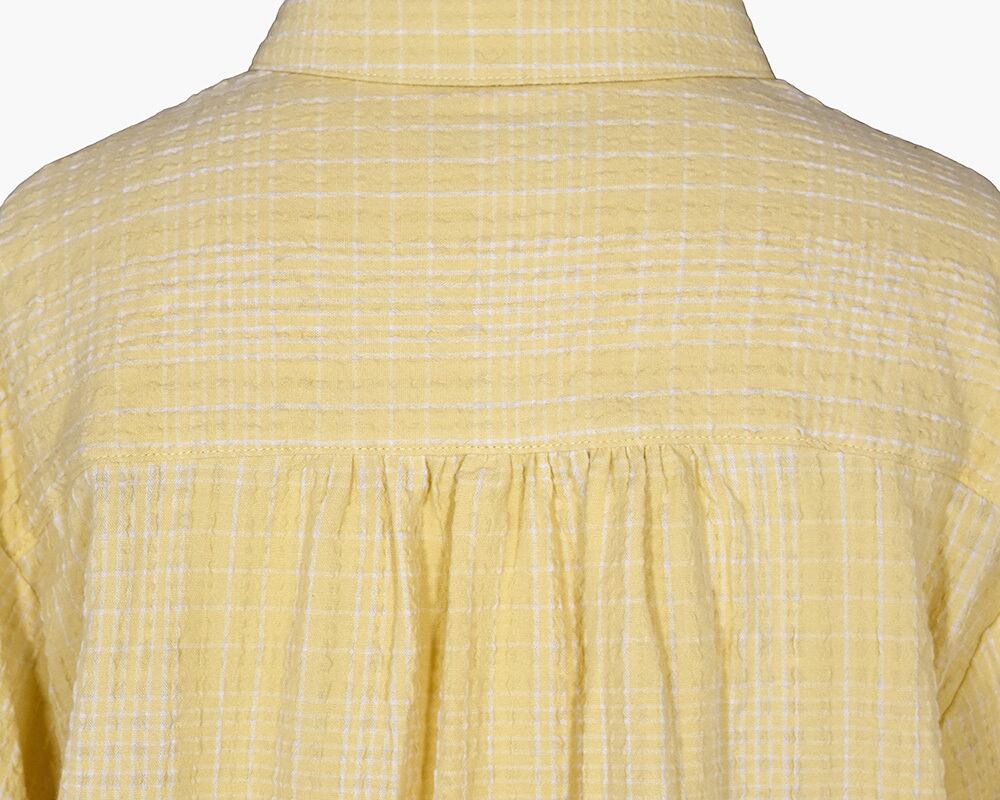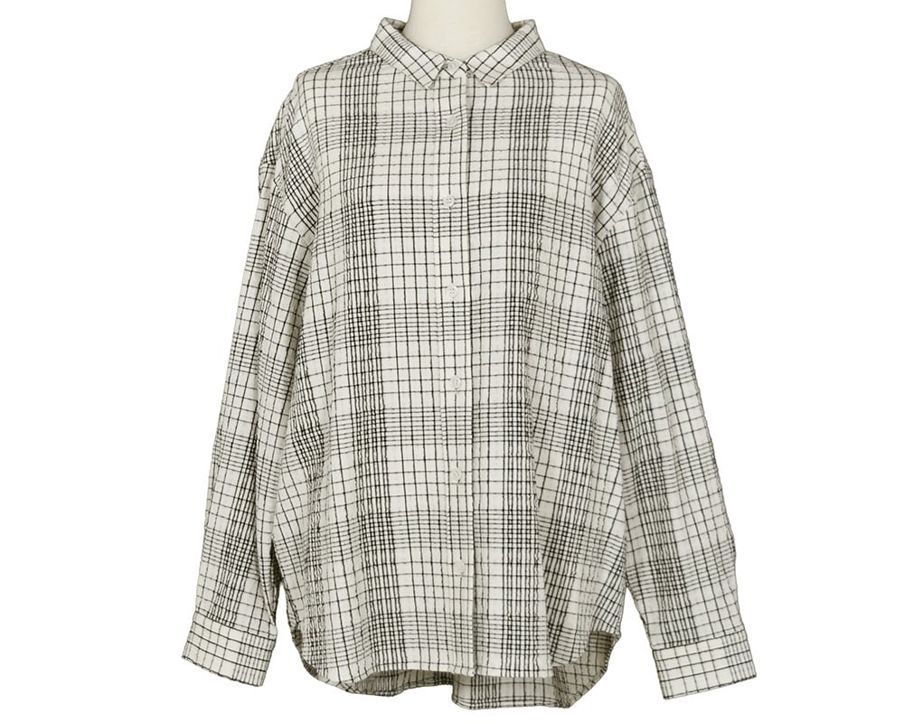 明るいカラーの先染めチェック柄が春らしさを感じる、シャツカラーのブラウスです。コンパクトなシャツ衿が、シャープになり過ぎずナチュラルな印象です。