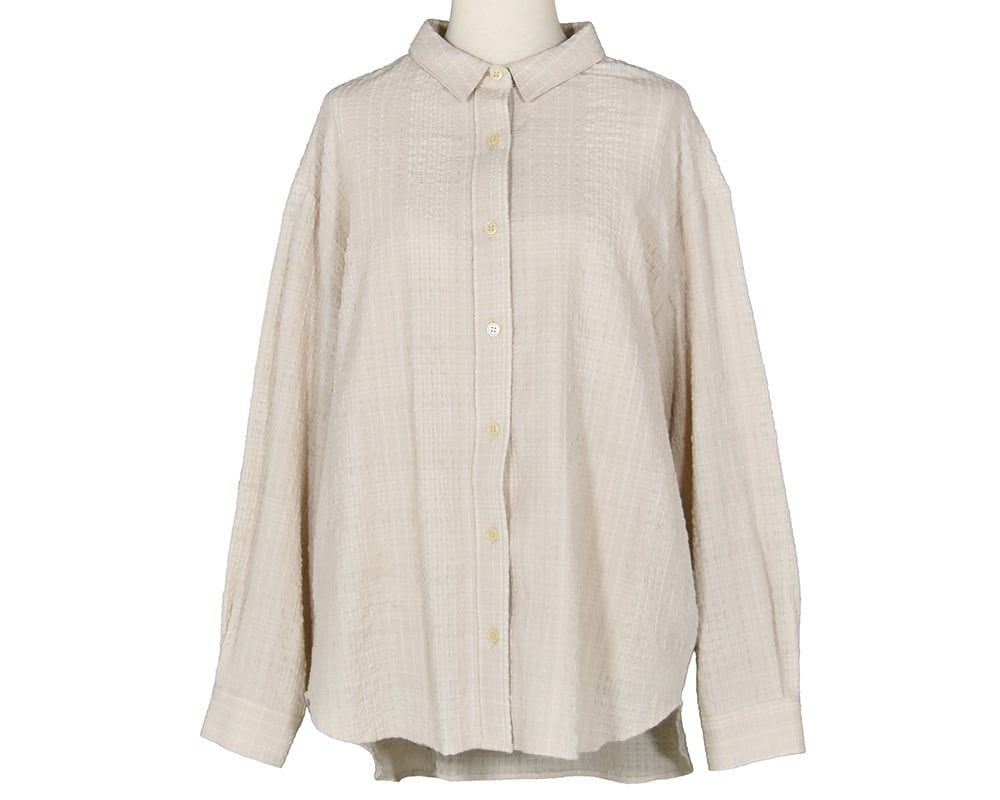 コットン素材にストレッチ糸を織り込むことで凹凸のある風合いに仕上げています。アイロンいらずの扱いやすい素材です。