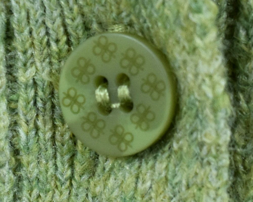 前あきボタンには、クローバーの柄をあしらいました。