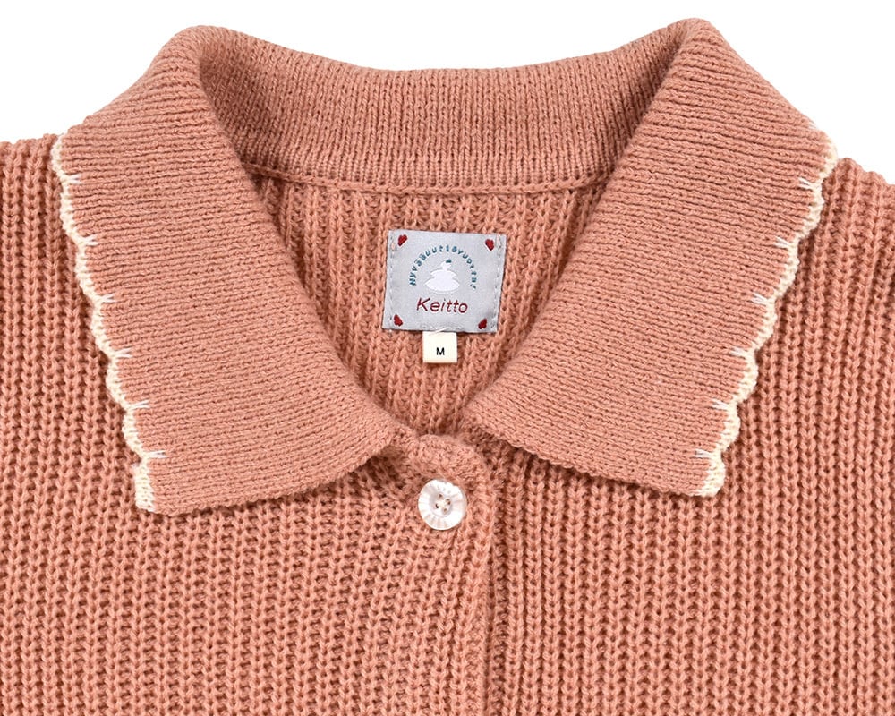 襟端と袖口の配色がアクセントになり、上品にもカジュアルにも合わせやすいスカラップ襟カーディガンです。