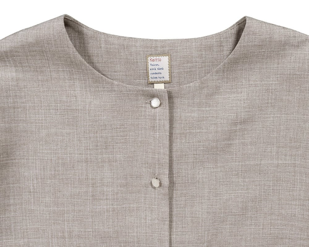 ブランドネームには、フィンランド語で「今年もいい年になりますように」という意味のロゴを入れ、前あきのボタンには、花の彫り柄をあしらいました。