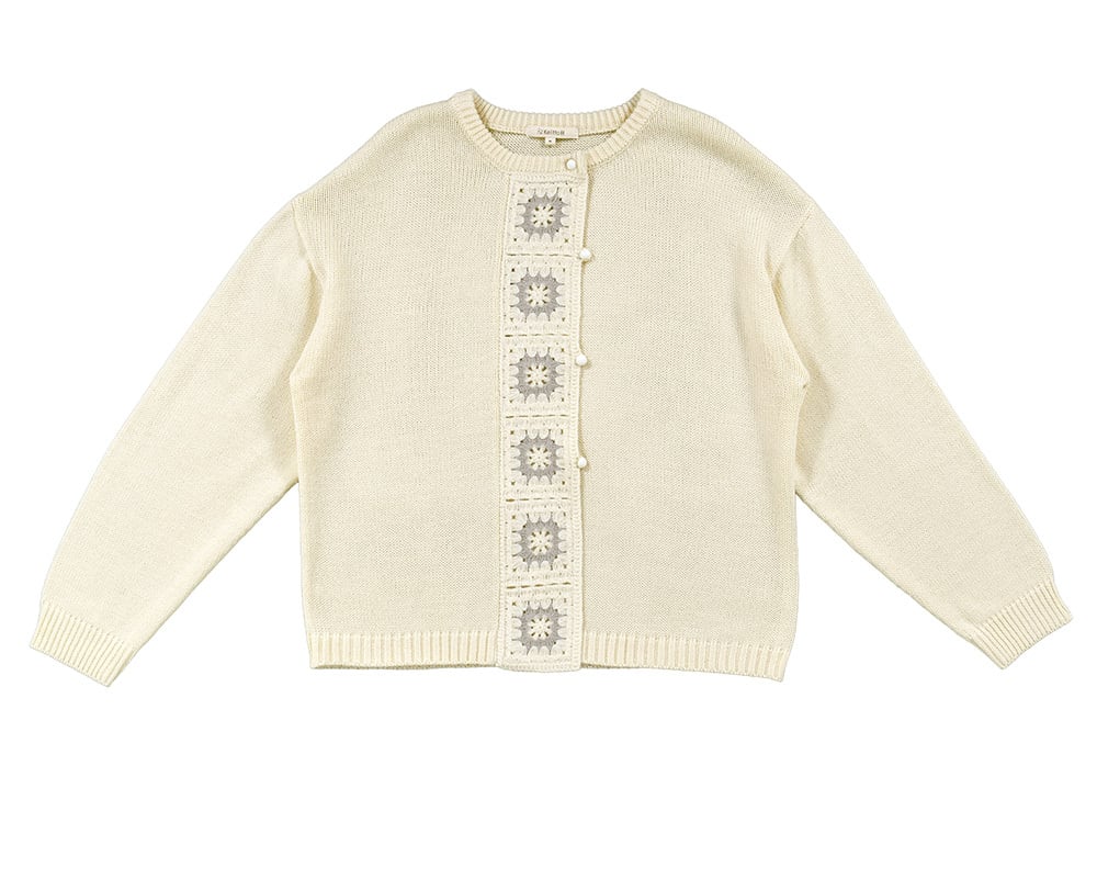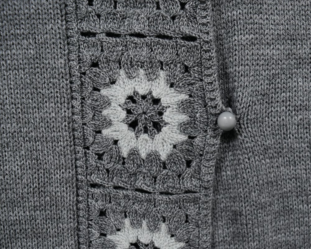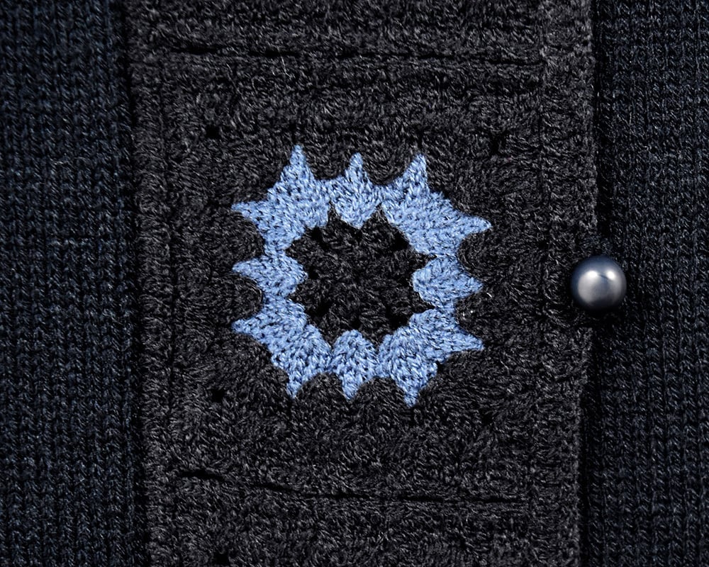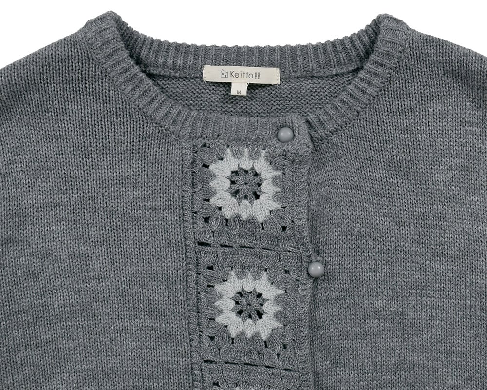 前立てにかぎ針モチーフをあしらった、手づくり感あふれるカーディガンです。手づくり感のあるモチーフに加え、くるみボタンのようなコロンとしたボタンも可愛らしいポイントです。