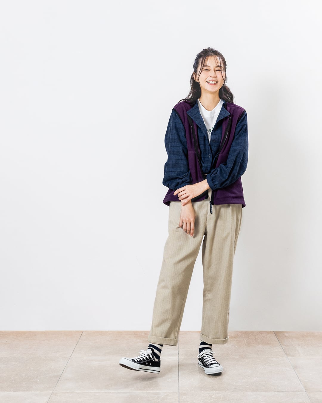 軽くて暖かいフリース素材を使用した、ジップ仕様のベスト。柔らかな肌ざわりが特徴です。ドロップショルダーとゆったりめのシルエットで、厚手のインナーの上からも重ねやすいデザイン。大きめのポケットがアクセントになり、実用性も◎。秋冬のアウトドアスタイルや、普段使いのレイヤードコーデに活躍する万能アイテムです。