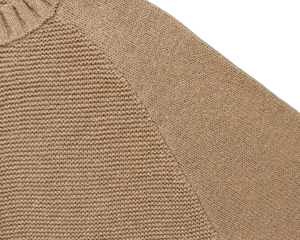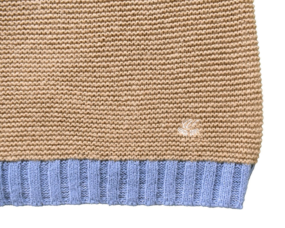 身頃と袖は天竺の表編みと裏編み、2種類の編地でパッチワーク風に仕上げた遊び心のあるデザイン。
