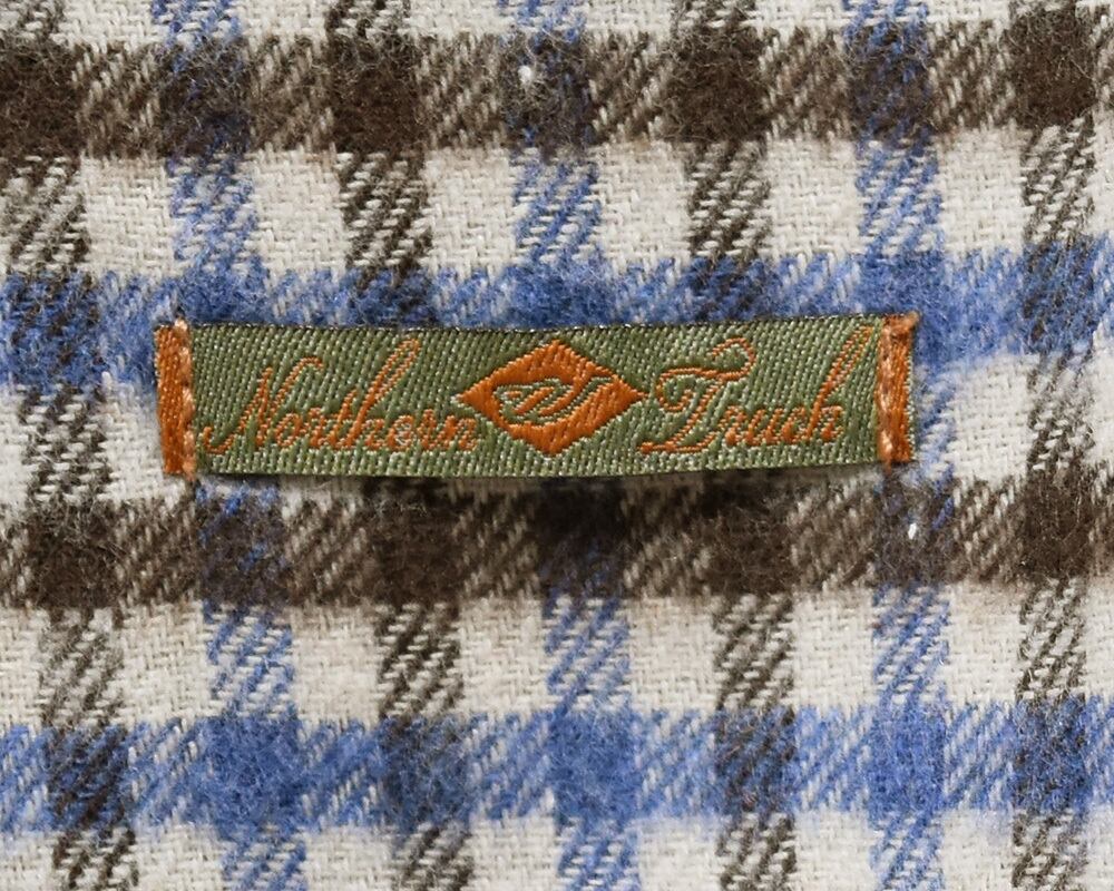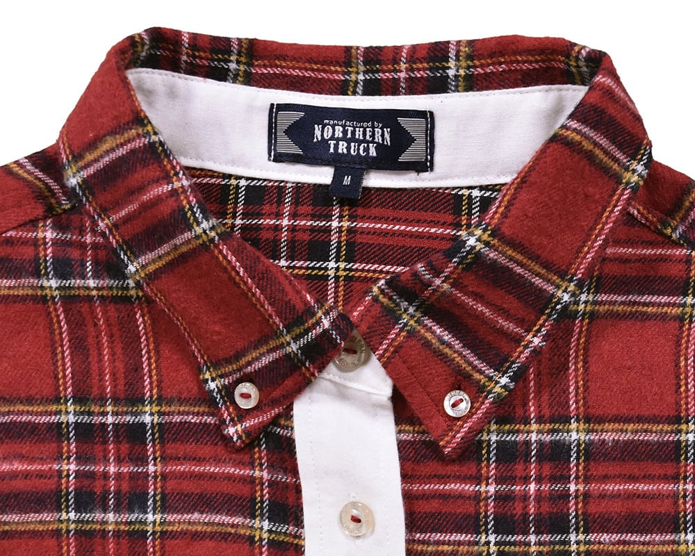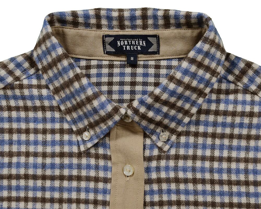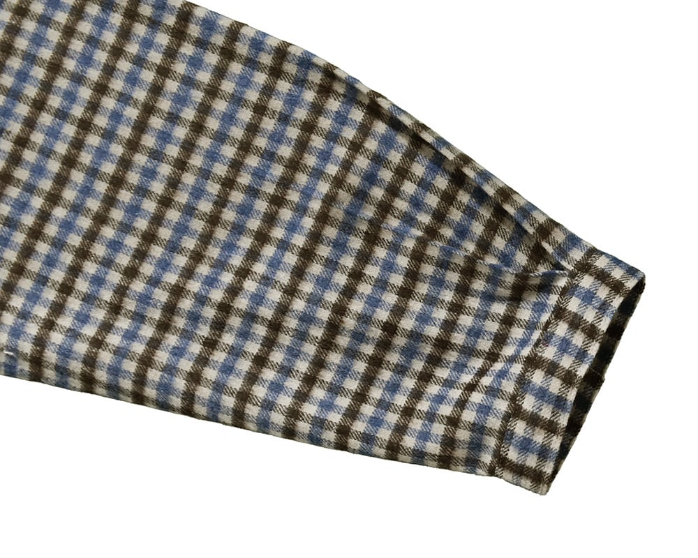 チェックのフランネル生地を使用したシャツです。 台衿と前立てには無地のフランネル生地で切り替え、さりげないアクセントを効かせました。 クラシックな雰囲気のチェック柄に、釦ダウンデザインでほどよくきちんと感を取り入れています。カジュアルやトラッドでも楽しめる一枚です。