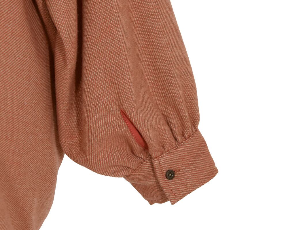 シャンブレー織りの表面に起毛加工を施し、ソフトであたたかみのある風合いに仕上げています。季節感を兼ね備えたウォーム感のある素材を使用しています。