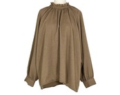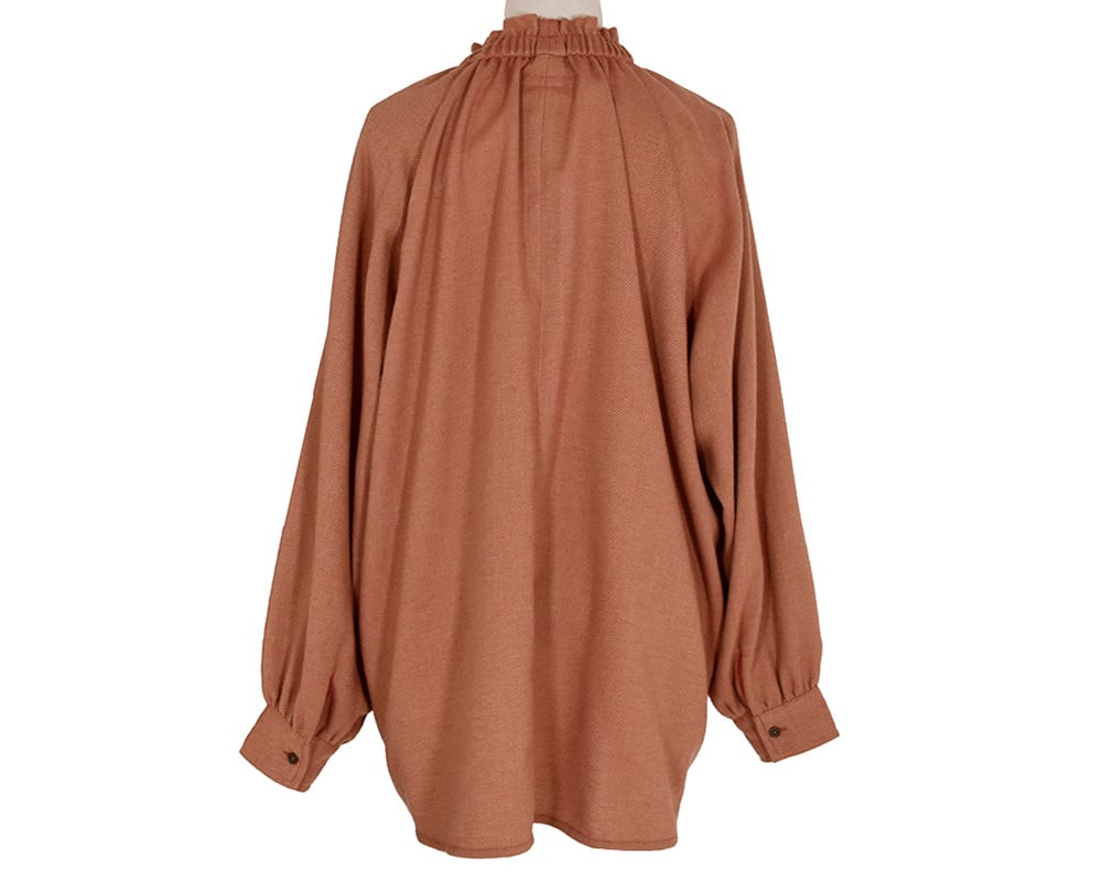 衿元に入ったギャザーフリルが、上品でクラシカルな印象を与えるブラウスです。フリル先の繊細なピコミシンがさり気ないアクセントになっています
