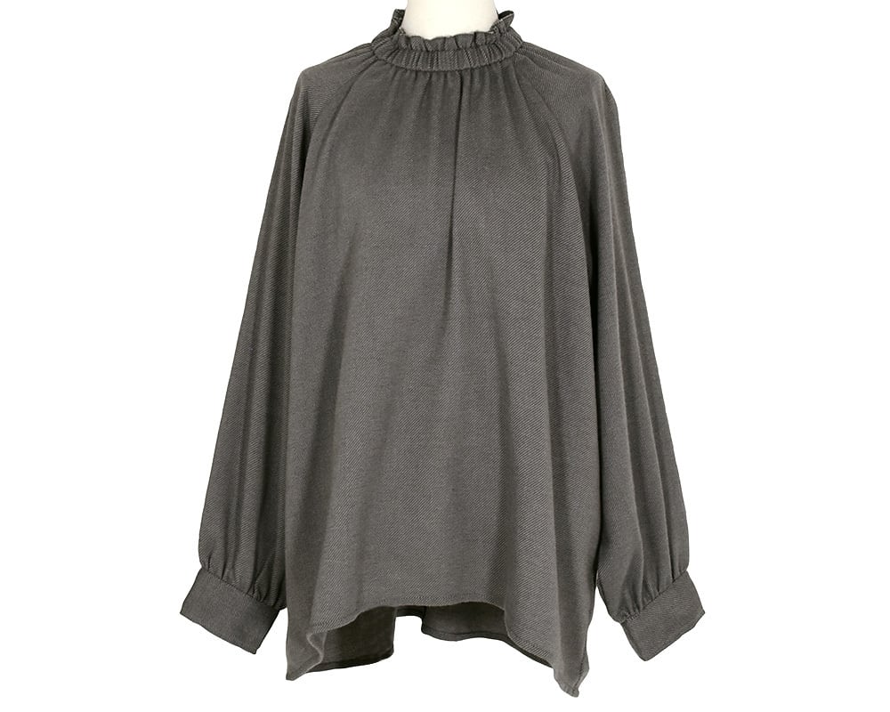 衿まわりはゴム仕様で、着脱のしやすさもポイントです。裾は前後差のあるカットで、軽やかな動きのあるシルエットに仕上げています。
