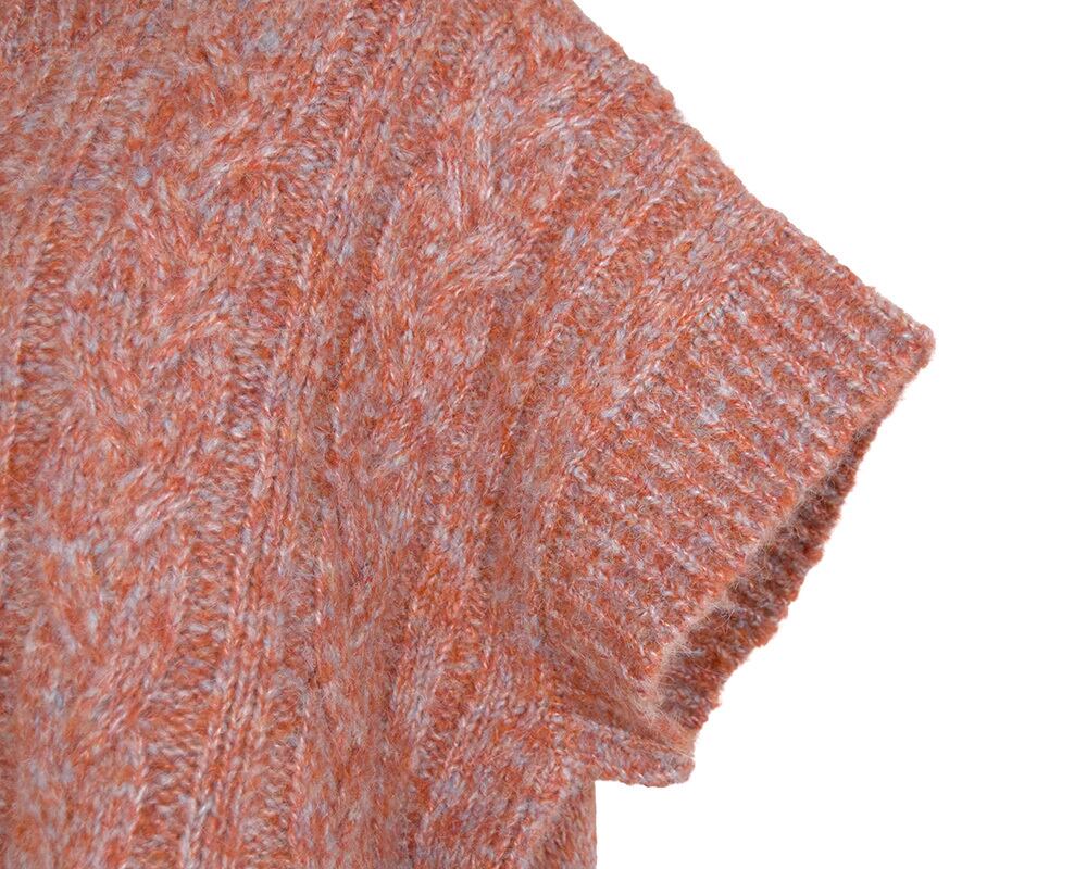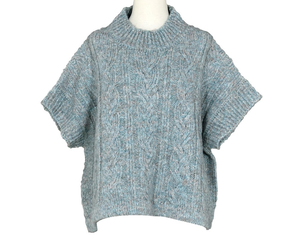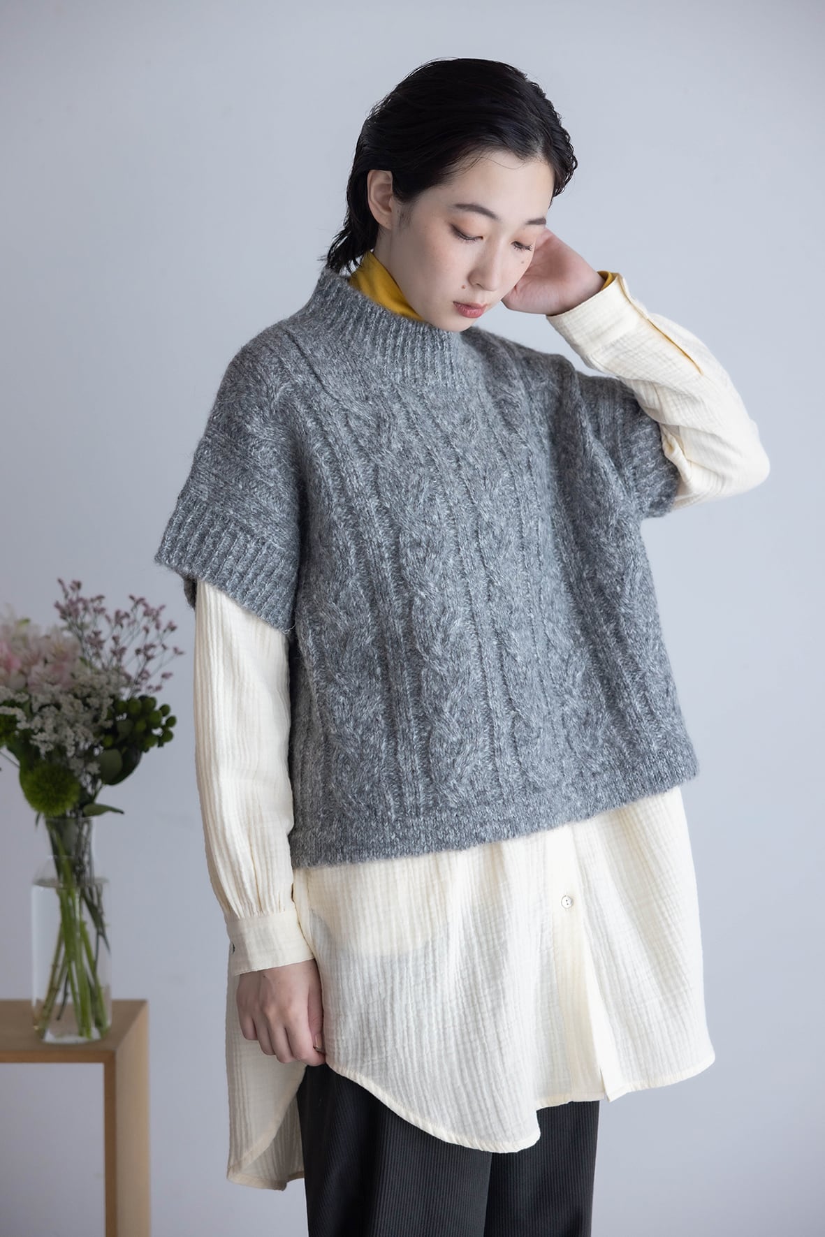 ハイネックで表情のあるケーブル編みが特徴のニットベストです。