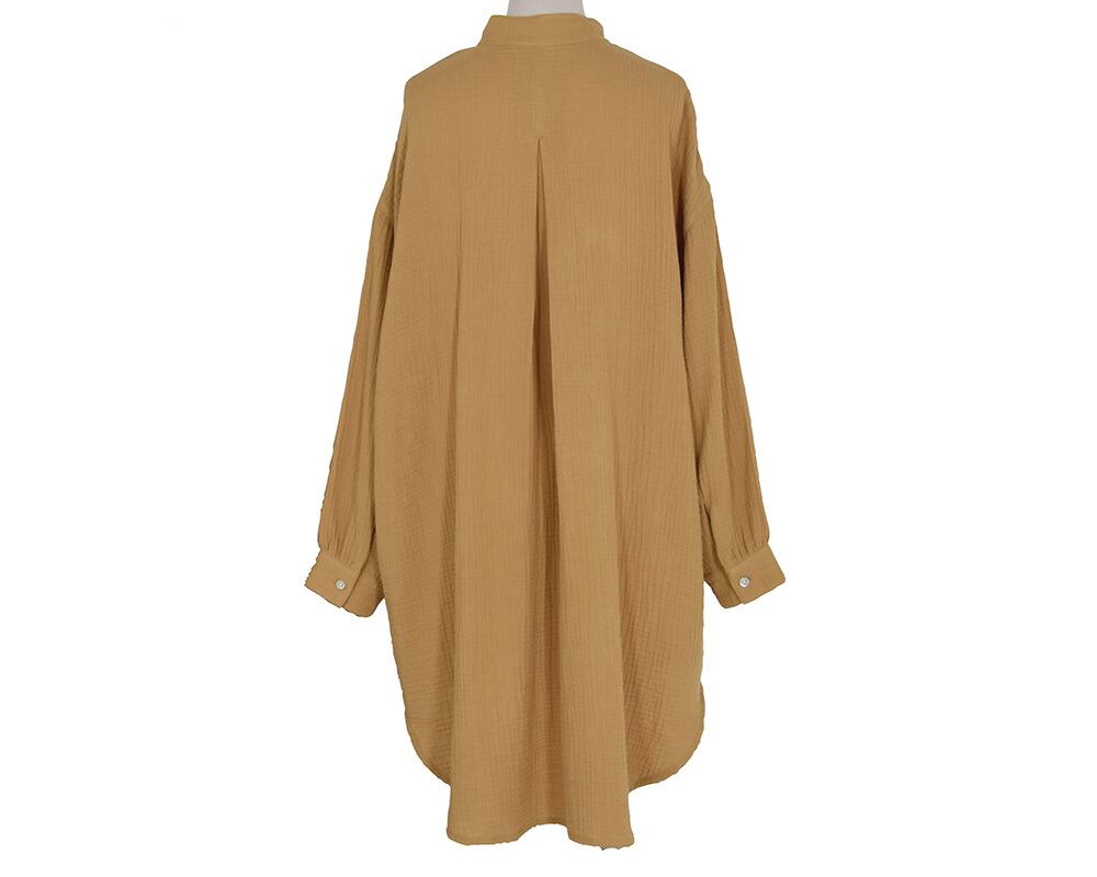 衿元と袖口のギャザーと大きくカーブしたヘムラインの曲線が女性らしさのあるデザインです。春先は軽いアウターとしても着用でき、長く活躍する1枚です。