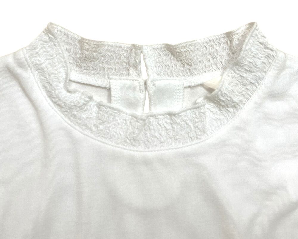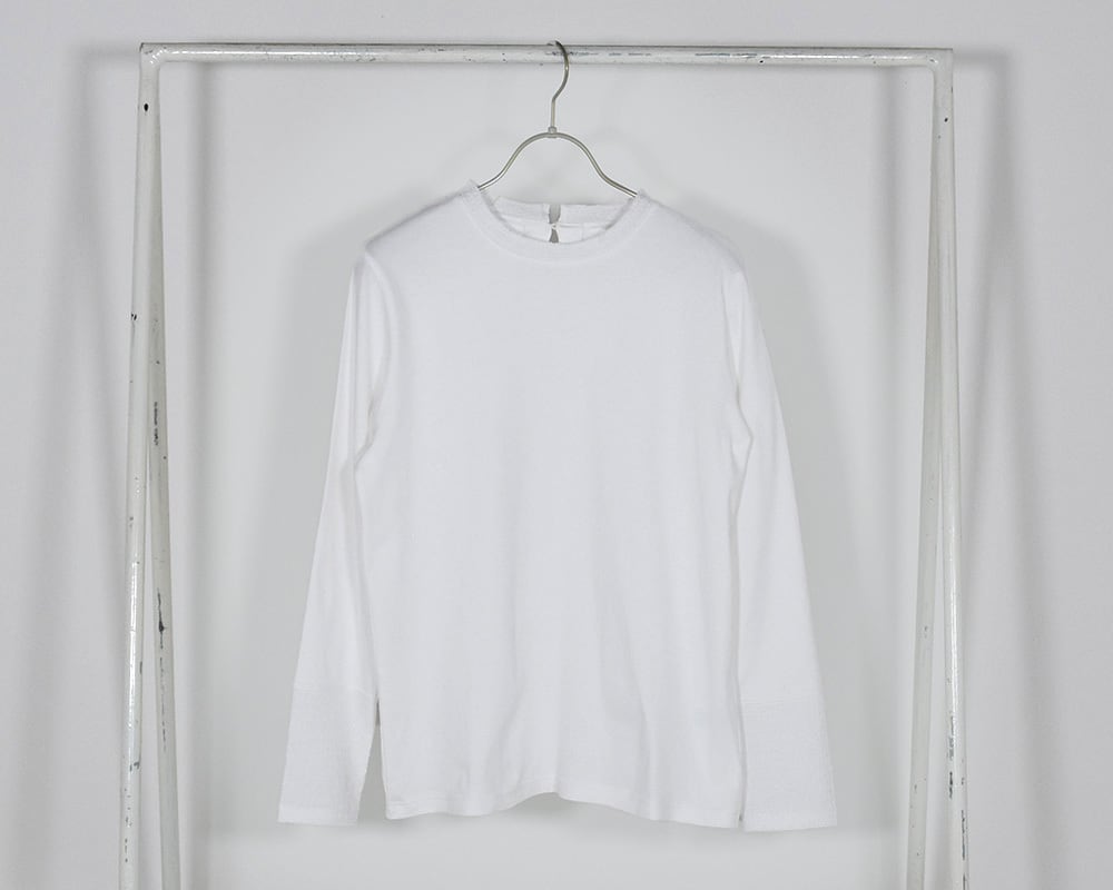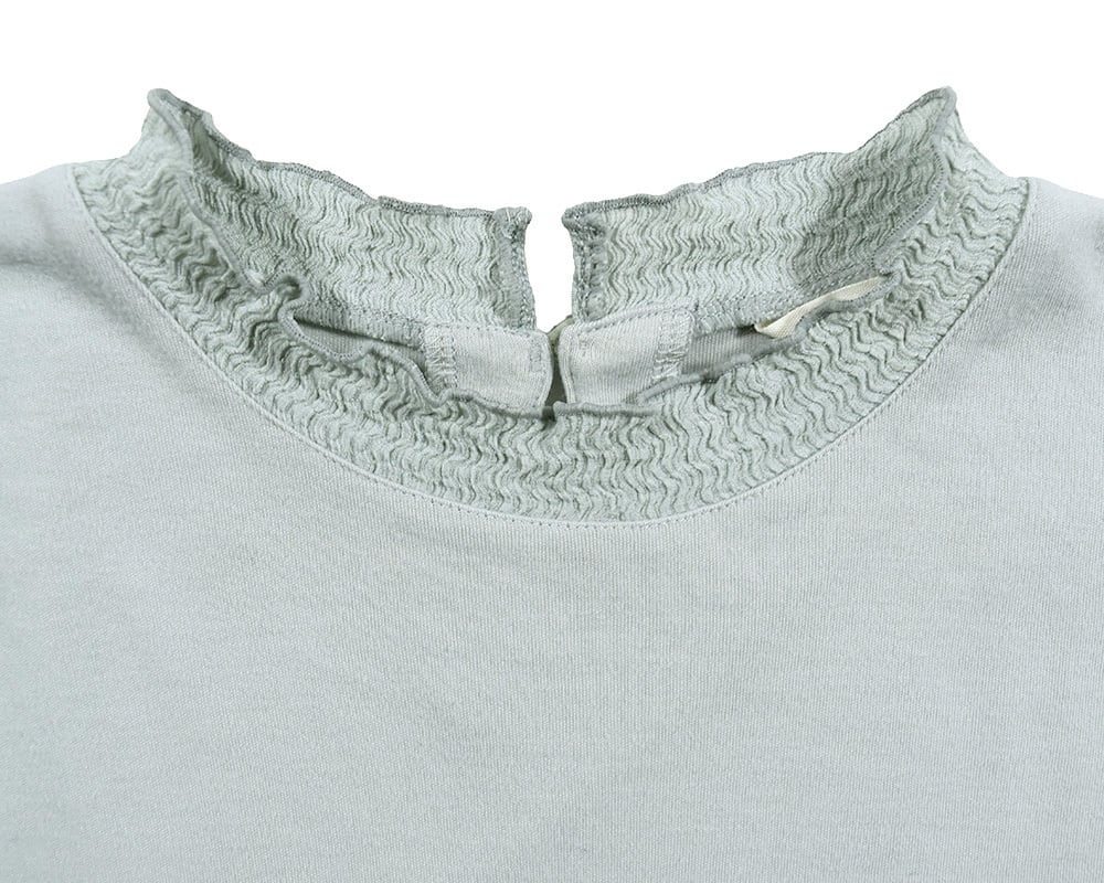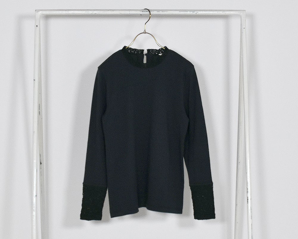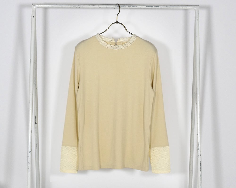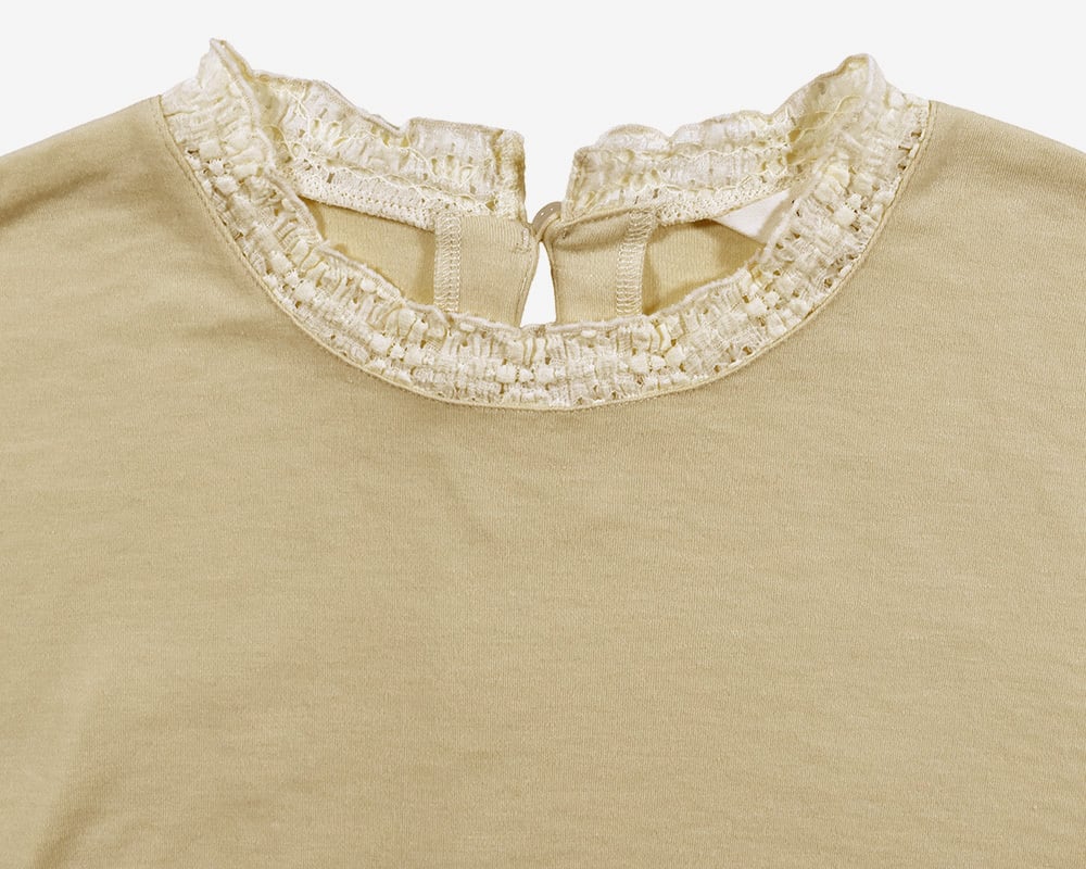 後開き部分には、音符マークをあしらった彫りボタンを添えました。オフ×レース、ブルーグレー×レース、ブラック×ふくれJQ、イエロー×ふくれJQの4色展開です。