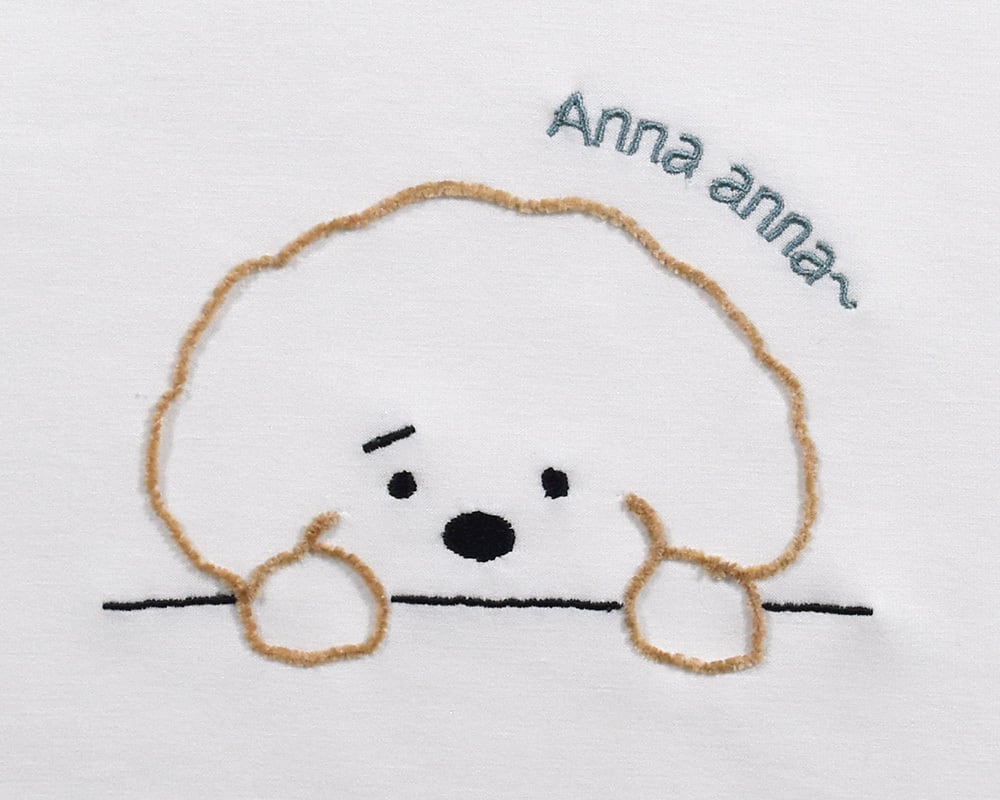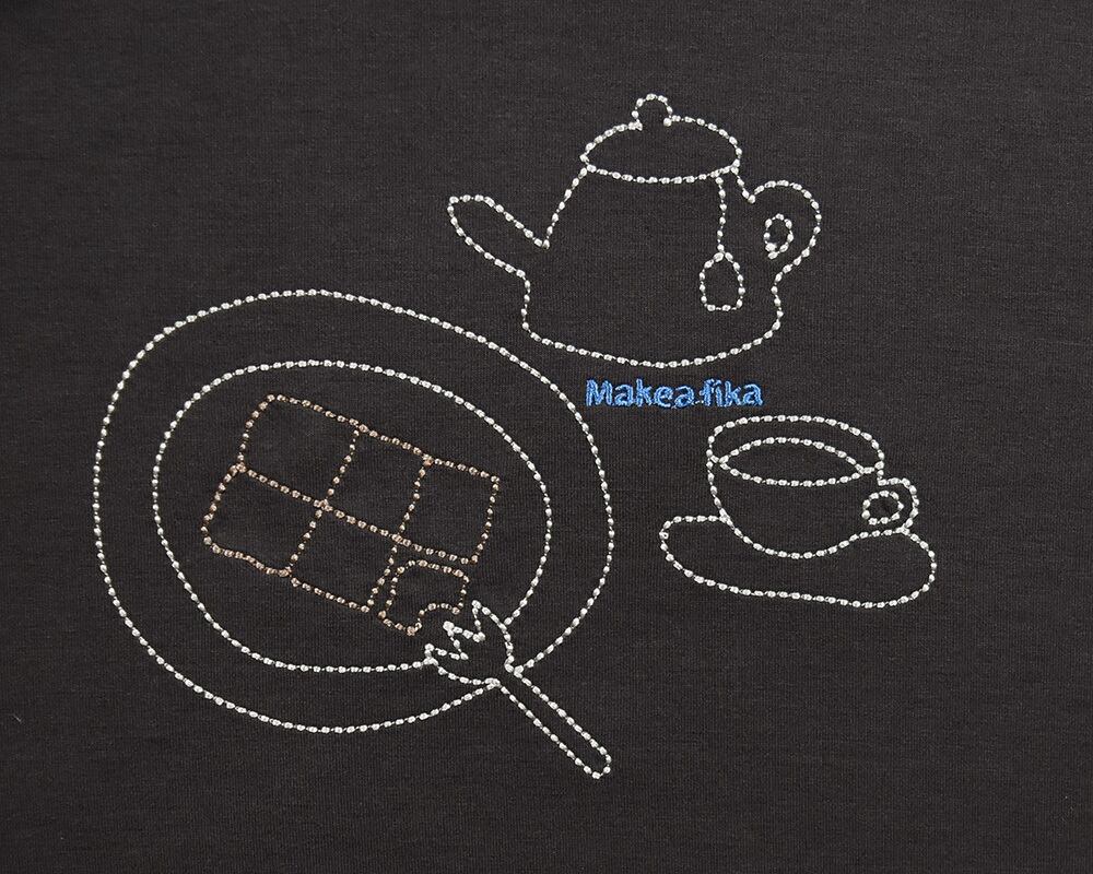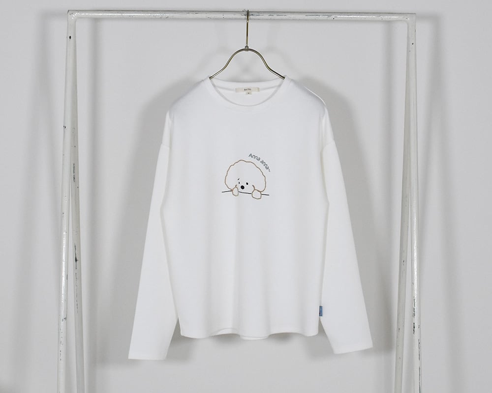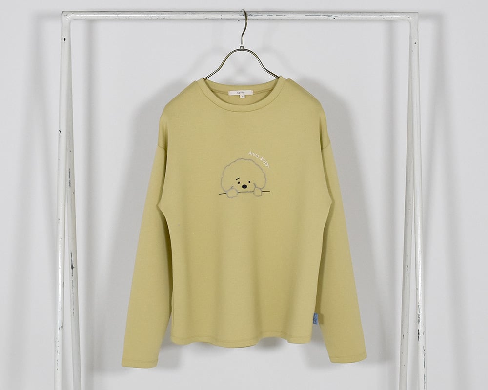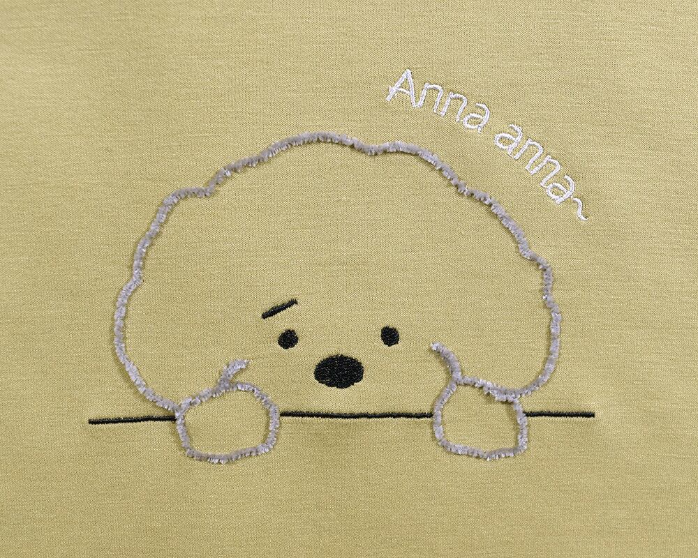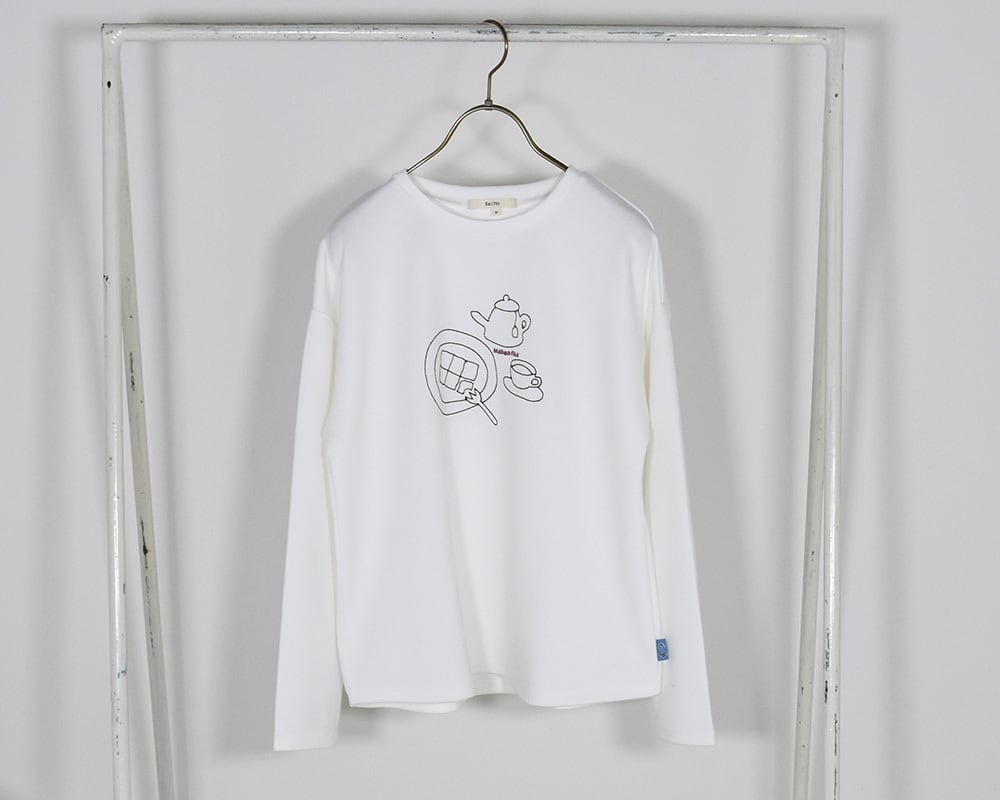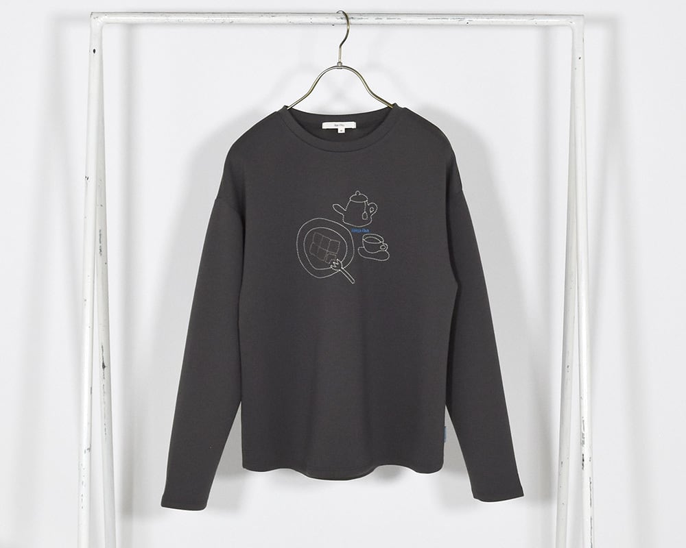 1枚でも、重ね着のインナーとしても着ていただけるほどよいボリューム感のプルオーバーです。できあがったシャーレクスムムス(スウェーデンのチョコレートケーキ)をいただくFIKAの柄と、それを見つめる犬の刺繍がポイント。チャコール(FIKA)、イエロー(犬)、オフA(FIKA)、オフB(犬)の4色展開です。