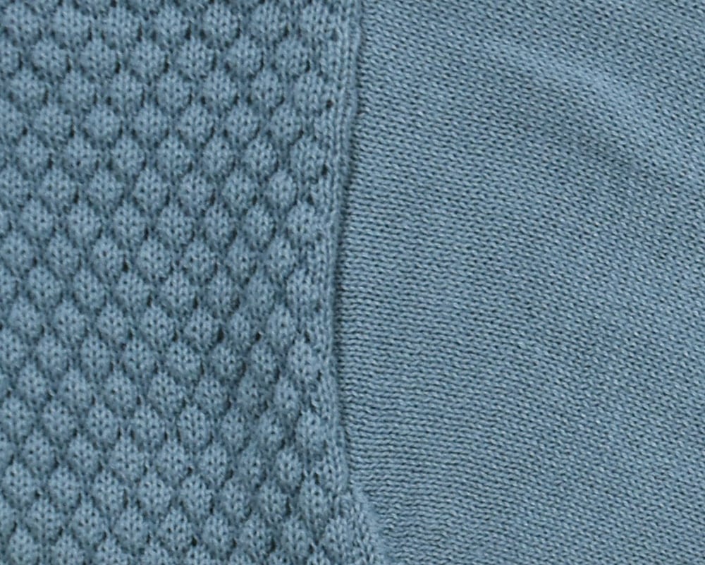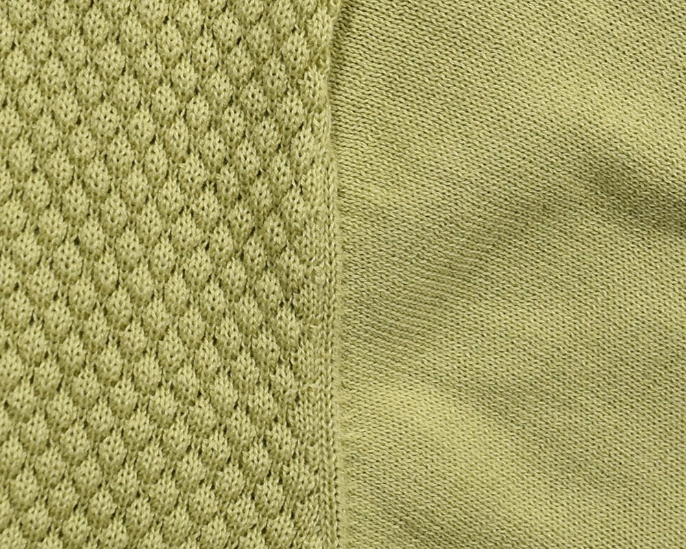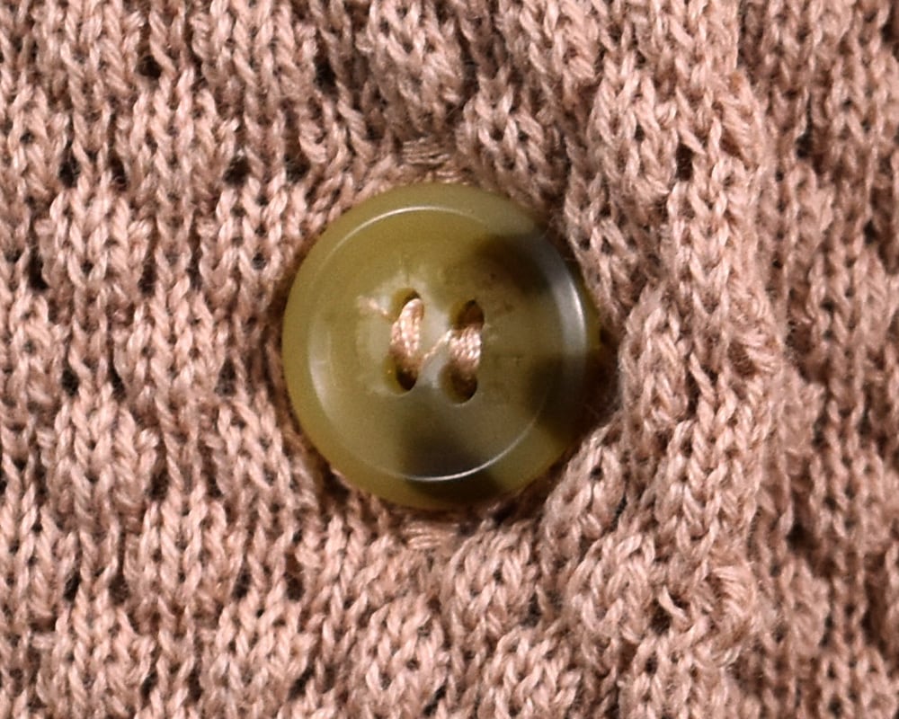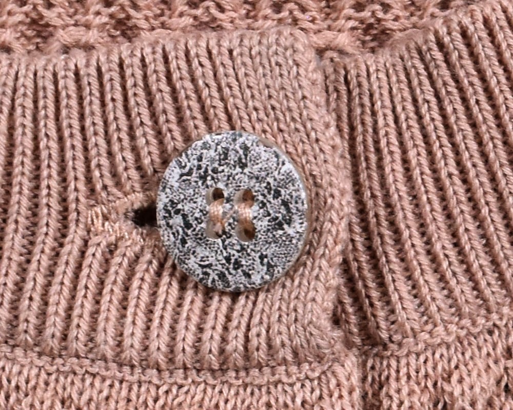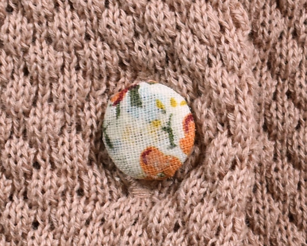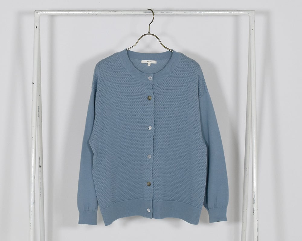 3種類のボタンがアクセントの、春色カーディガンです。身頃には表面感のある編地、袖には天竺編みを使用しています。レース調ボタン、スコッチボタン、くるみボタンをあしらい、スコッチボタンにはブランドロゴを添えました。ブルー、ネイビー、ピンク、ライムの4色展開です。