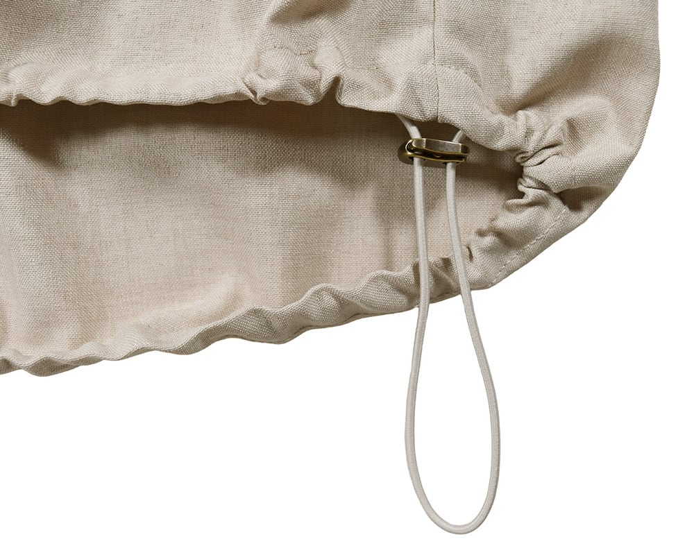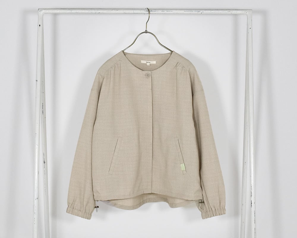 前後のヨークにギャザーを寄せた、ふんわりシルエットのブルゾンです。裾のドロストコードで絞って、シルエットの調整も可能です。麻調のポリエステル生地を使用。