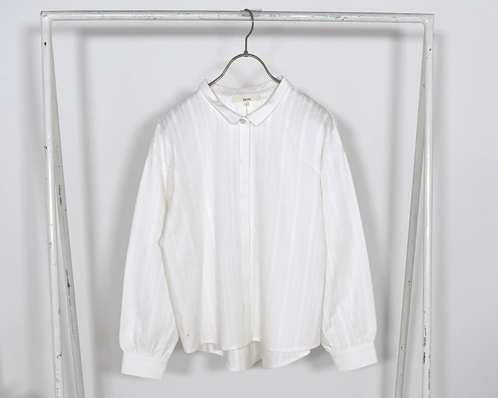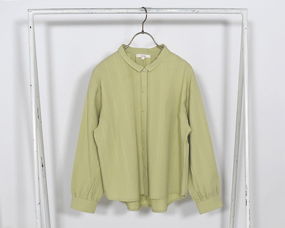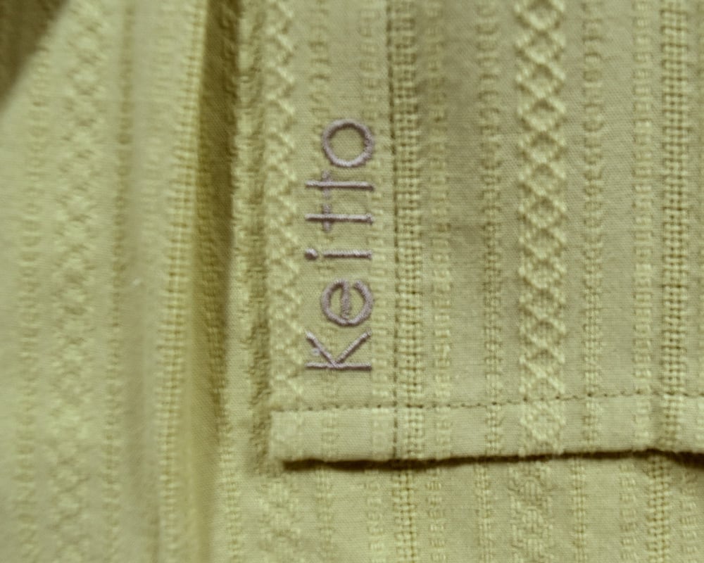 襟ぐりとカフスにパール調ボタンをあしらった、ちいさめ襟のきれいめシャツです。凹凸感のあるドビーストライプと、先染めストライプの2種類の生地を使用しています。下前立ての裾部分に、Keittoのロゴ刺繍をさりげなく入れました。オフドビー、グレー×オフストライプ、ライムイエロードビーの3色展開です。