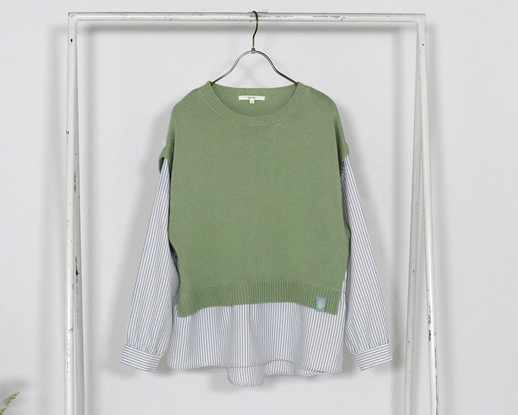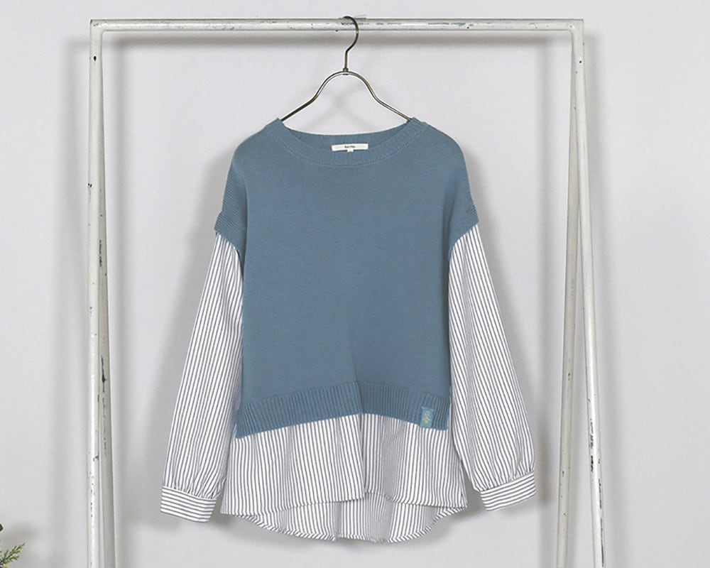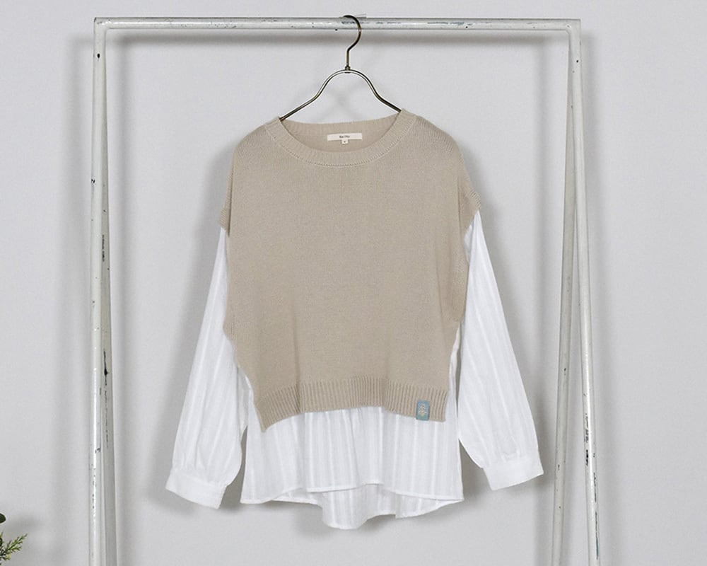 昨年も好評だった、シャツとニットのレイヤード見えプルオーバー。
