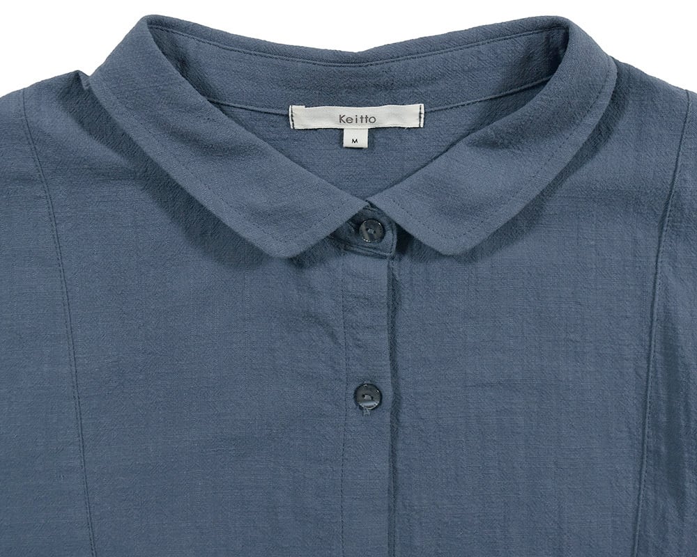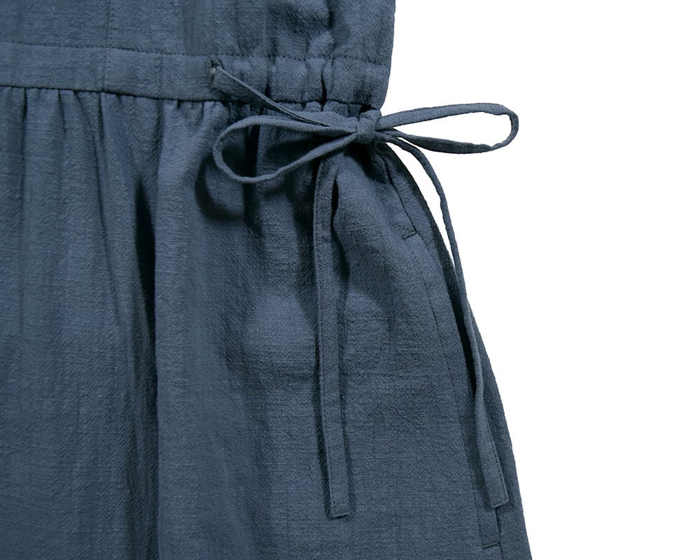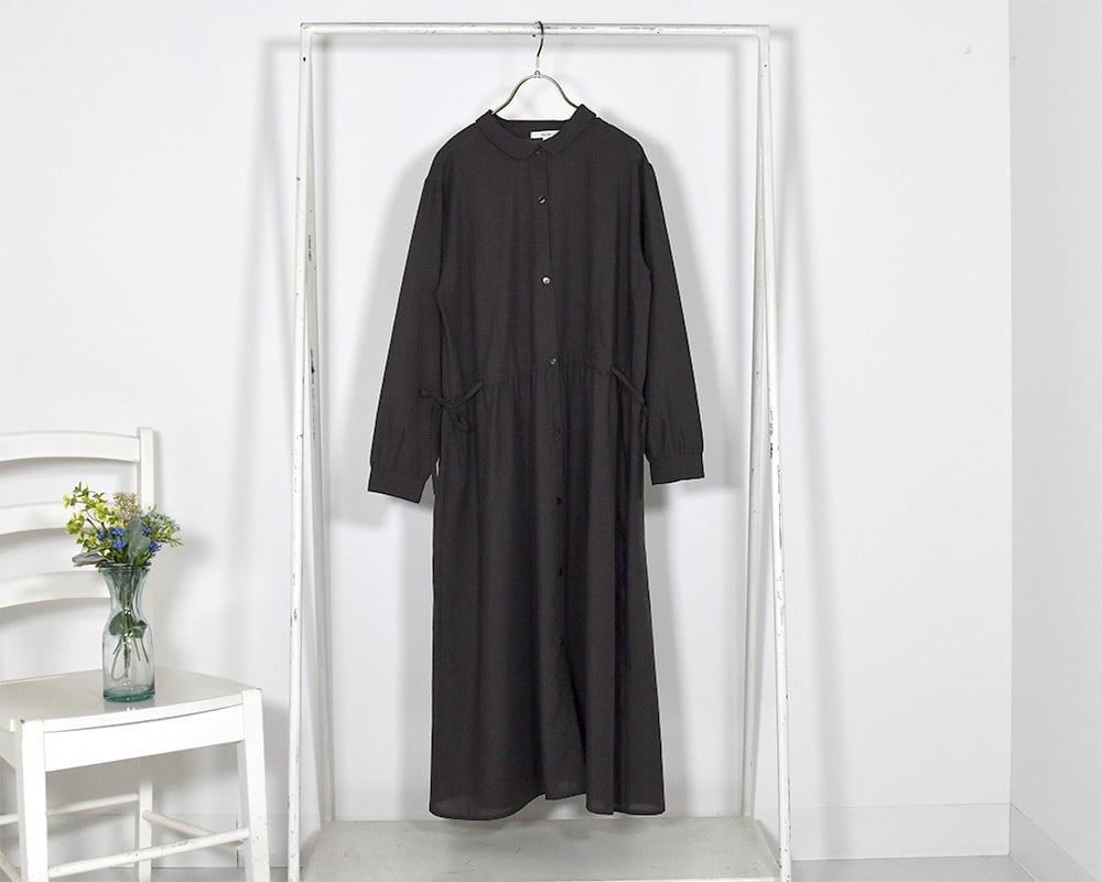 ウエスト切替の前あきワンピースは1枚でも羽織でも着ていただける万能アイテムです。色ごとに異なる素材を使用しています。チャコールブラックはきれいめに、ブルーはカジュアルに着こなせます。ウエストの紐でシルエットの調節が可能です。ボタンにはリボンの彫り柄がさりげないアクセントになっています。チャコールブラック、ブルーの2色展開です。