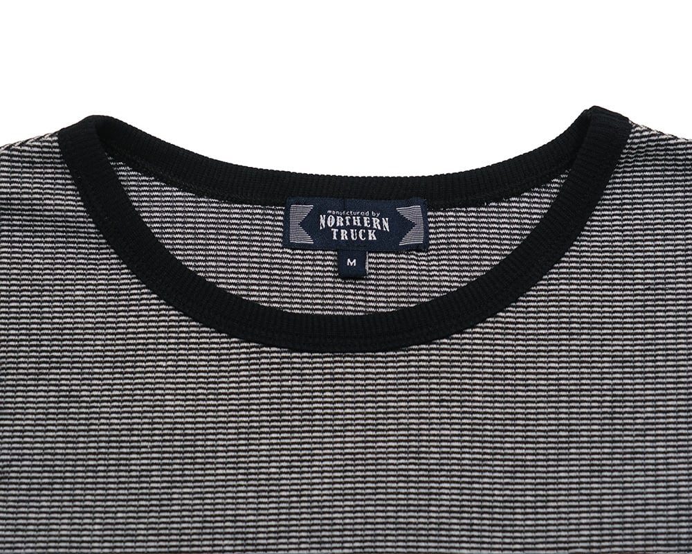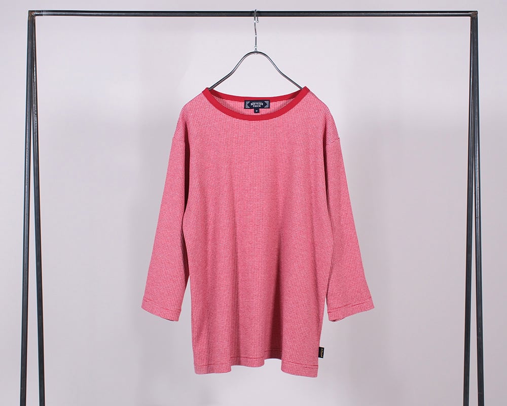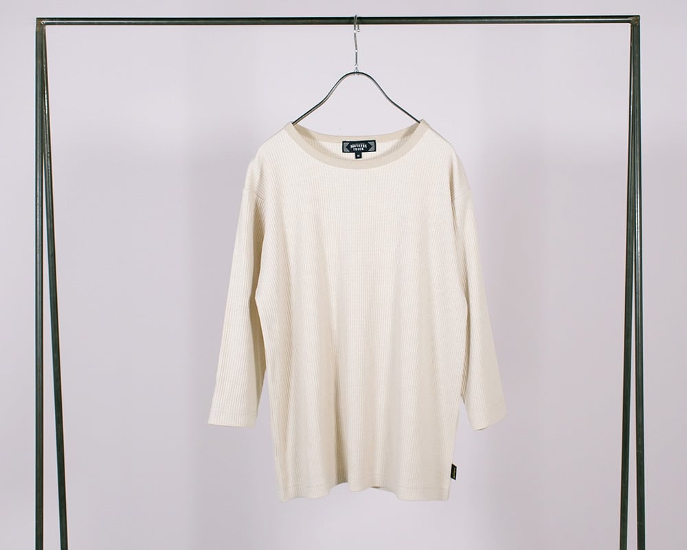 カーディガンと同じリブ編みのカットソー素材で仕上げたプルオーバー。カジュアルになりすぎない微塵ボーダーを使用。インナーとしても使いやすい7分袖です。
