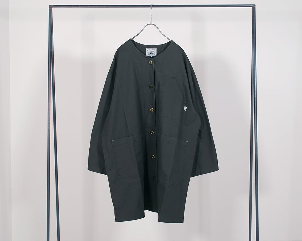 ワーク感のあるツイル素材のミドル丈コート。ヒップまで隠れる丈感とワイドなシルエットで、インナーを選ばずリラックスして着られる一枚です。見返しに沿った縦のステッチが全体をすっきりと見せ、大きめのポケットがアクセントに。