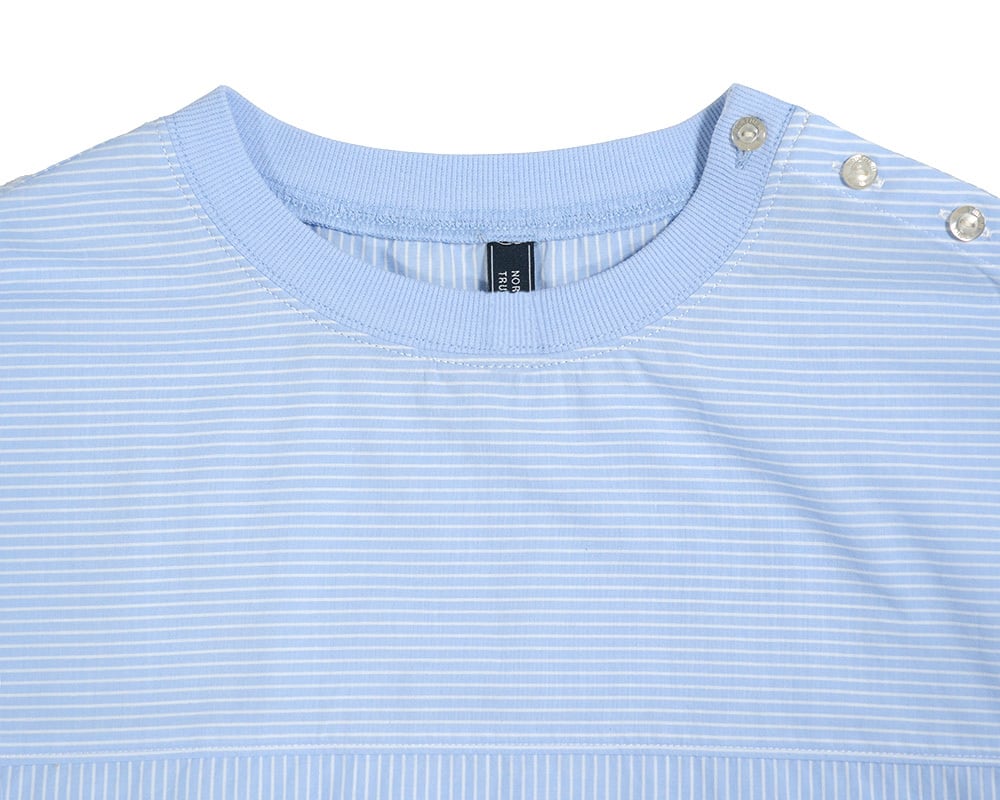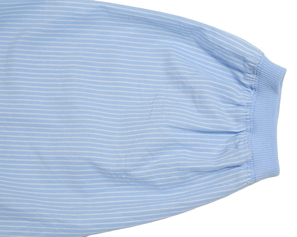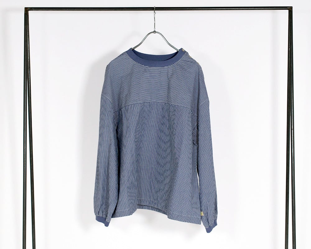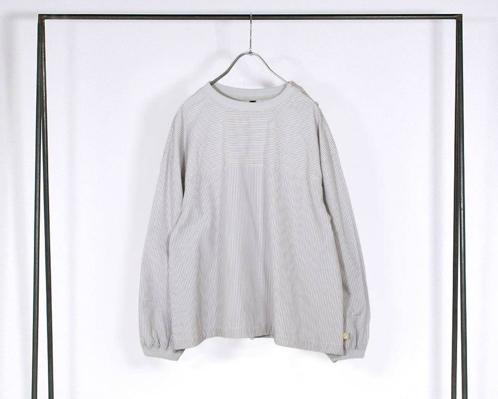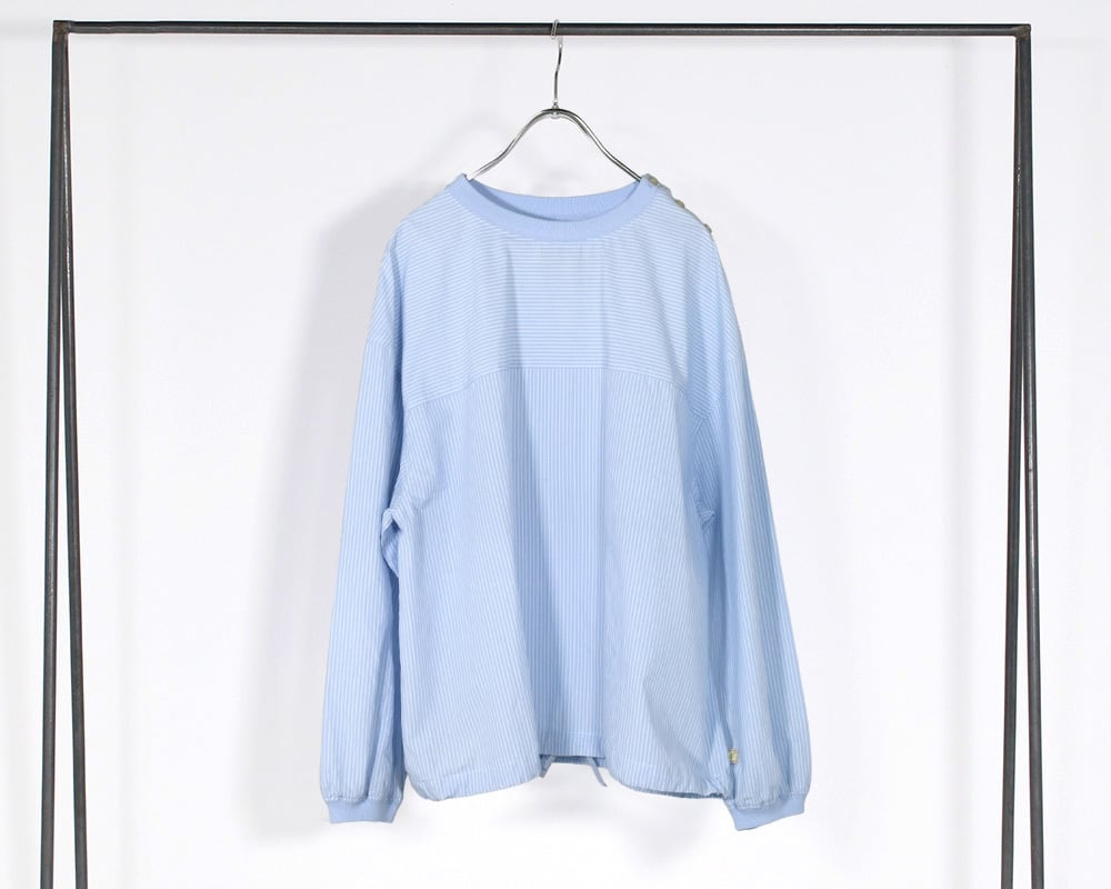 先染めストライプの平織生地を使用したプルオーバー。表情のあるストライプ柄が映え、コーディネートの主役になる1枚です。襟、袖口に伸縮性のあるカットリブを使用し、Tシャツのような着心地にしあげました。裾のドローストリングでシルエットの調節ができ、着こなしに変化を付けられるのもポイントです。肩のボタンディティールが程よいアクセントになっています。