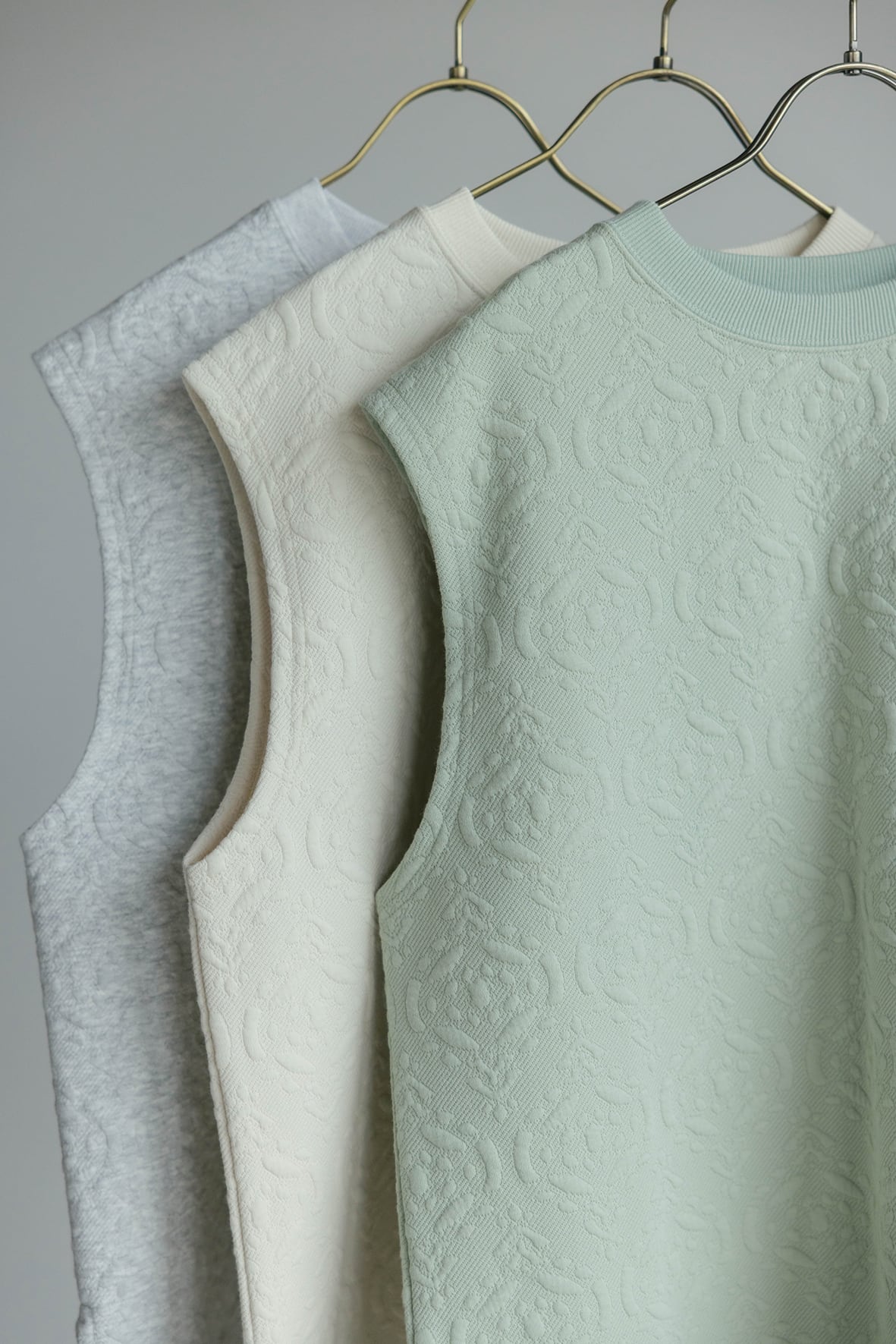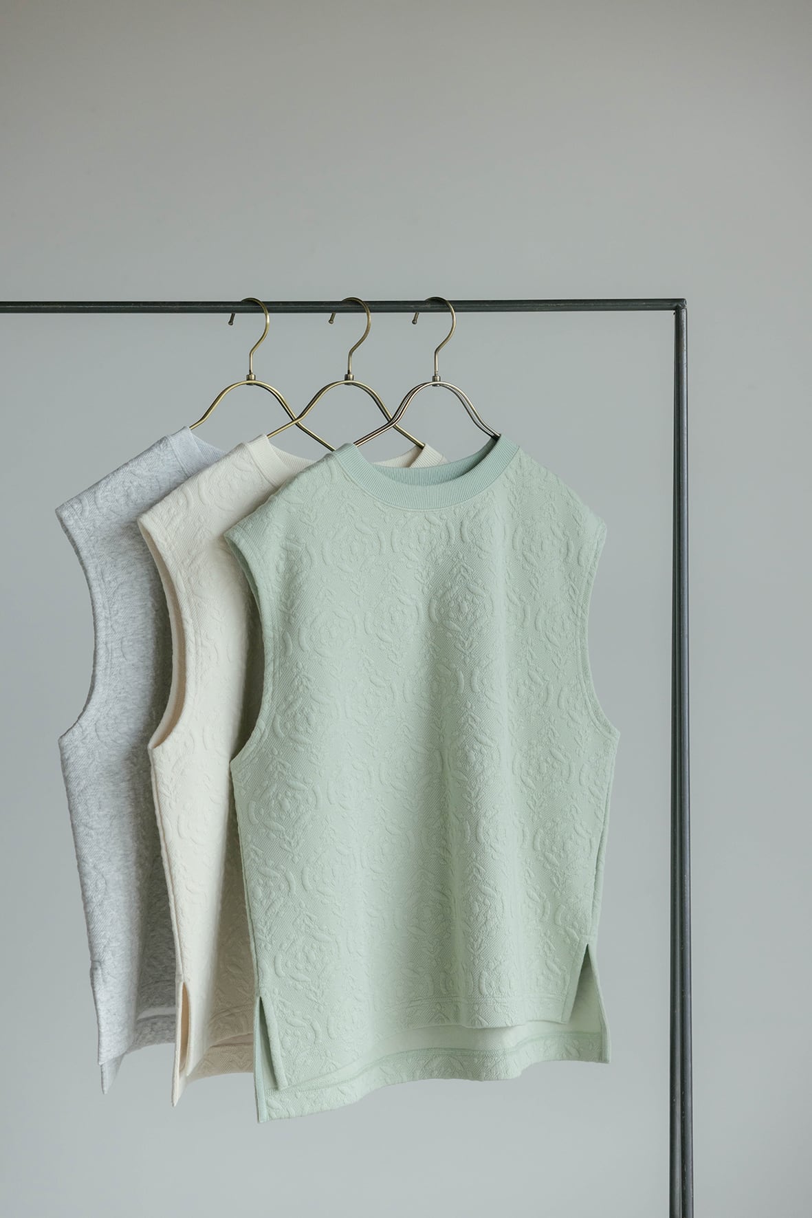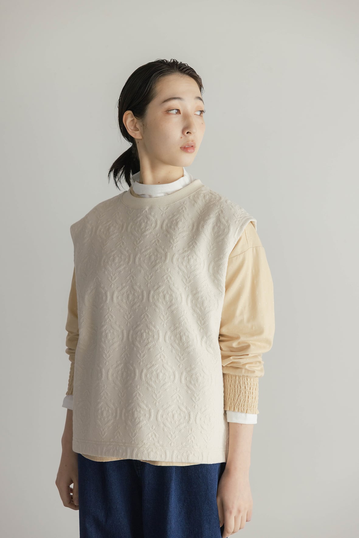 プラムをイメージしたジジャカード柄が華やかなカットソーベストです。ブラウスやロンTなどとの重ね着ができ、寒い時期には上にコートも重ねられるサイズ感です。