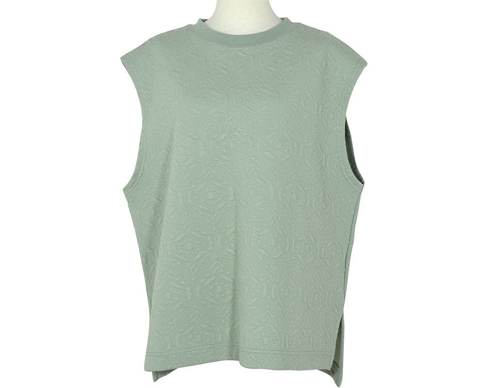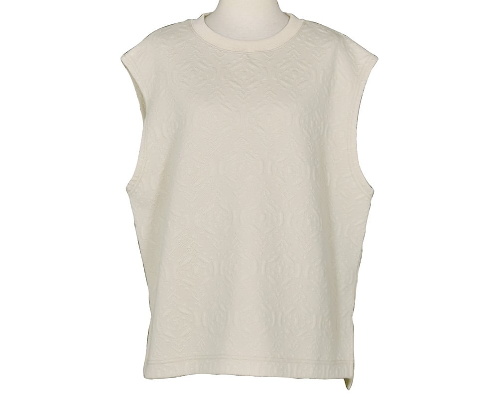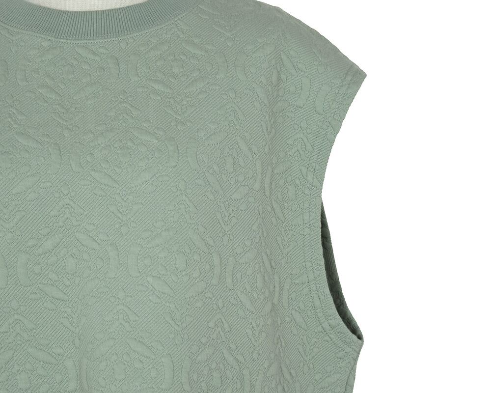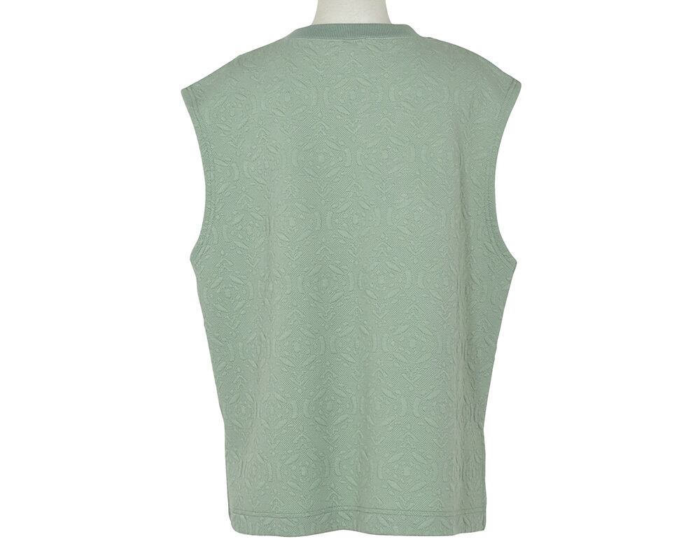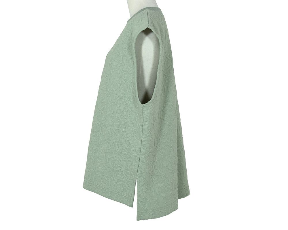 プラムをイメージしたジジャカード柄が華やかなカットソーベストです。ブラウスやロンTなどとの重ね着ができ、寒い時期には上にコートも重ねられるサイズ感です。
