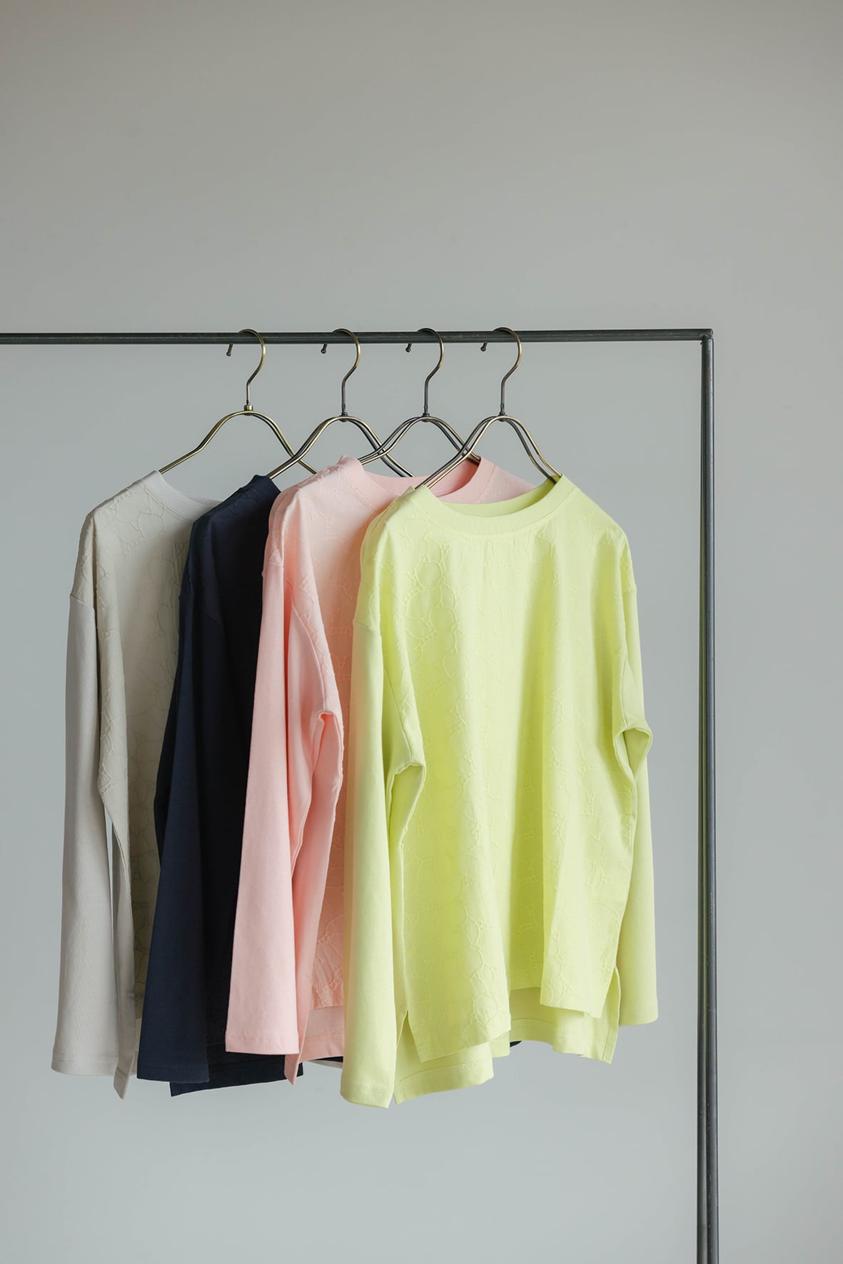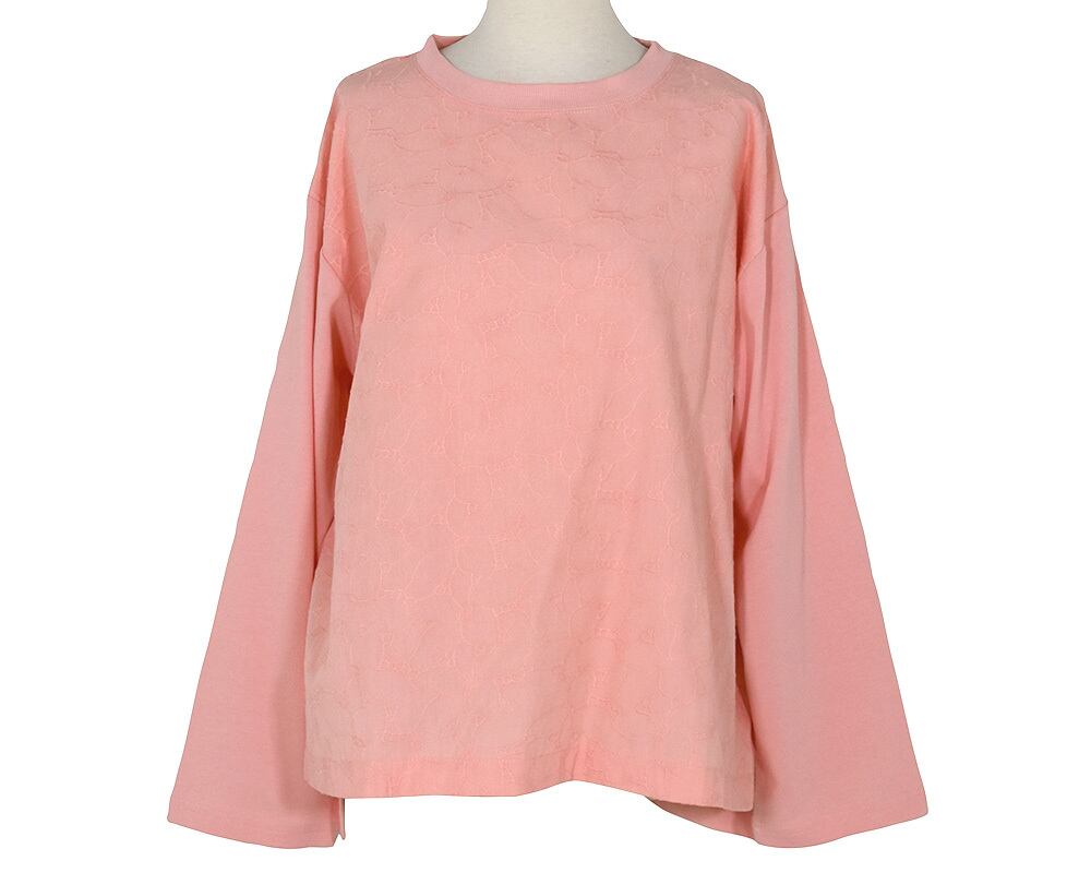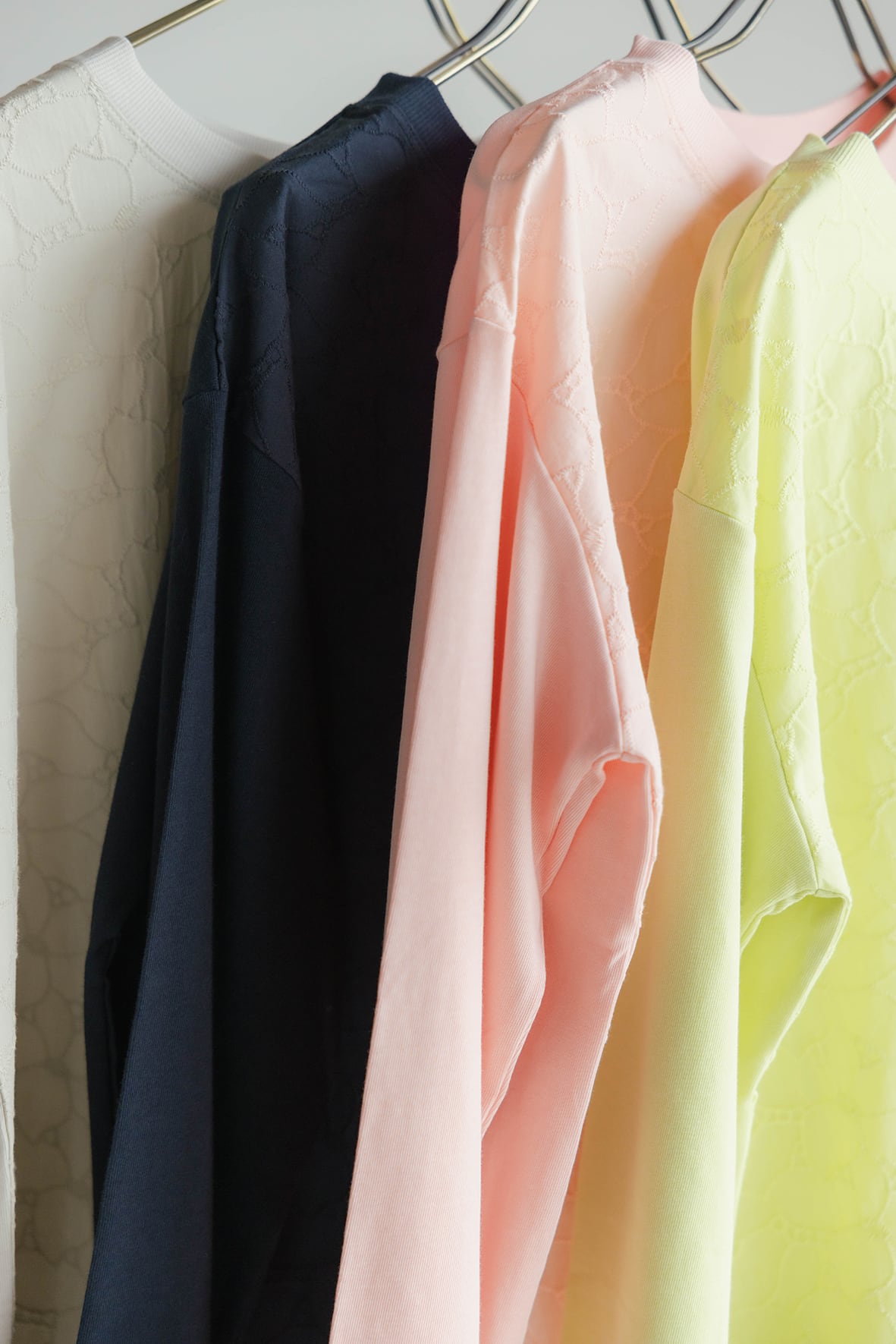 後ろ見頃と袖はカットソー、前見頃は花びら刺繍を施した布帛を使用したプルオーバーです。衿はリブ仕立てで、頭入れがしやすい仕様です。スイセンの花びらをイメージした刺繍柄です