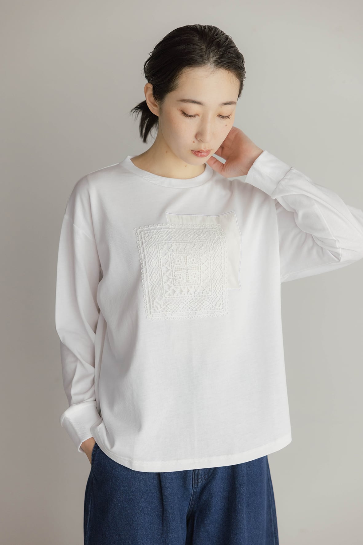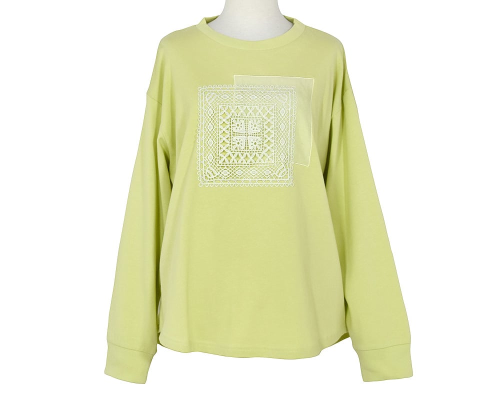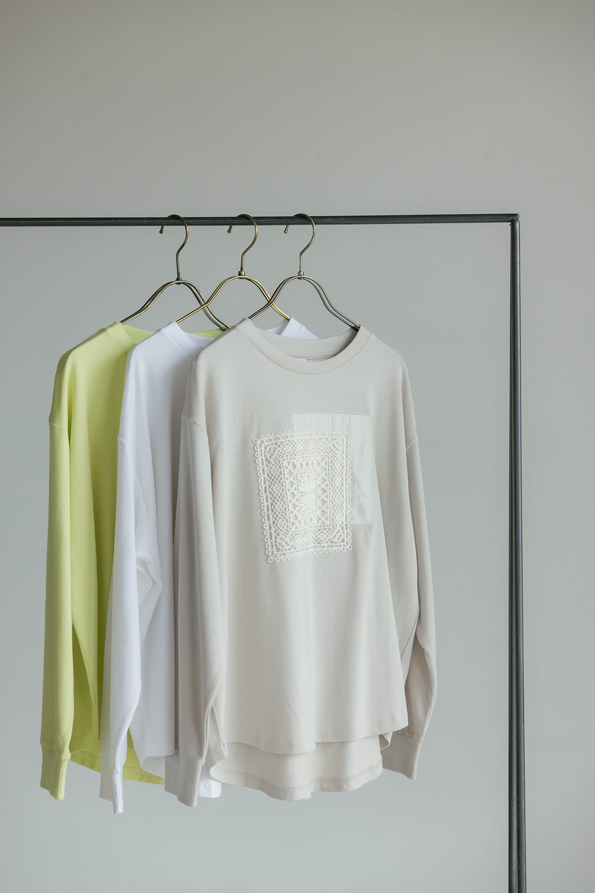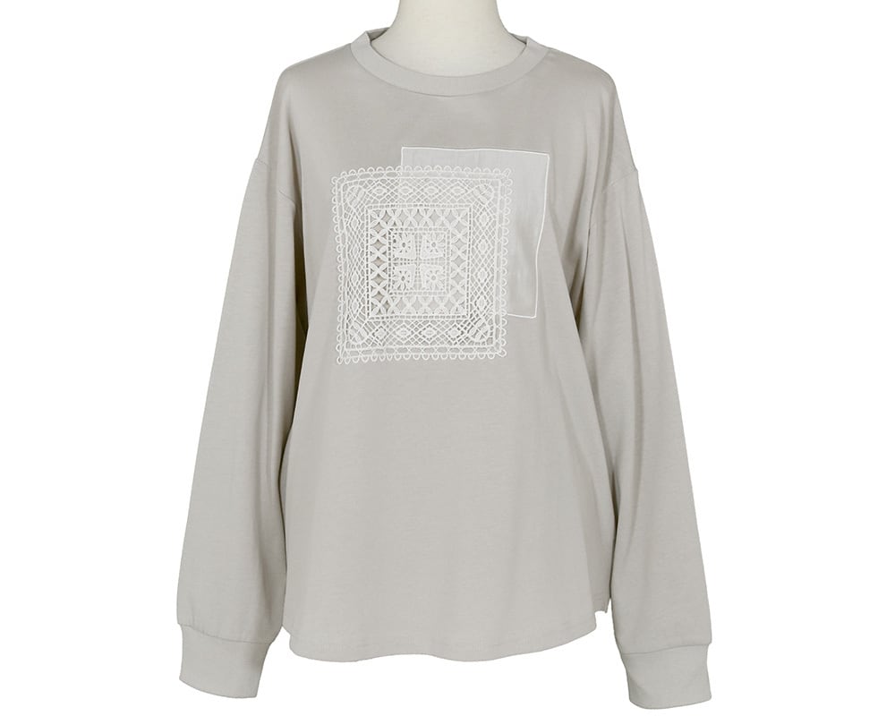 フロントにレースとオーガンジーを重ねたデザインのプルオーバーです。袖口はダブルに切り替え、伸縮性がある便利な仕様です。程よくゆとりのあるシルエットで、着まわしに便利な1枚です。