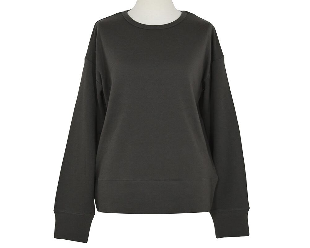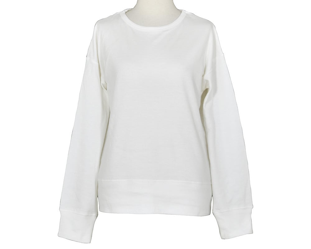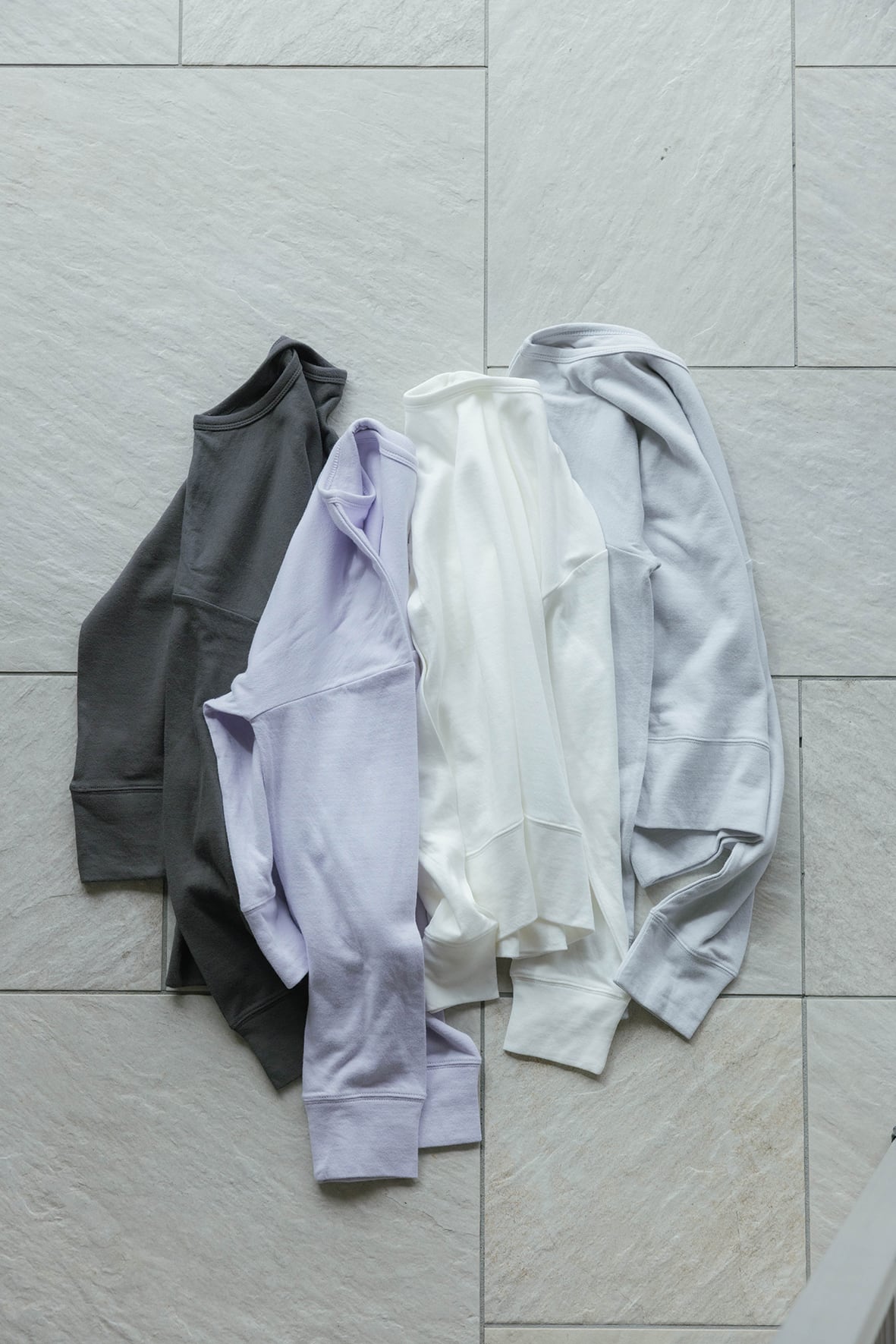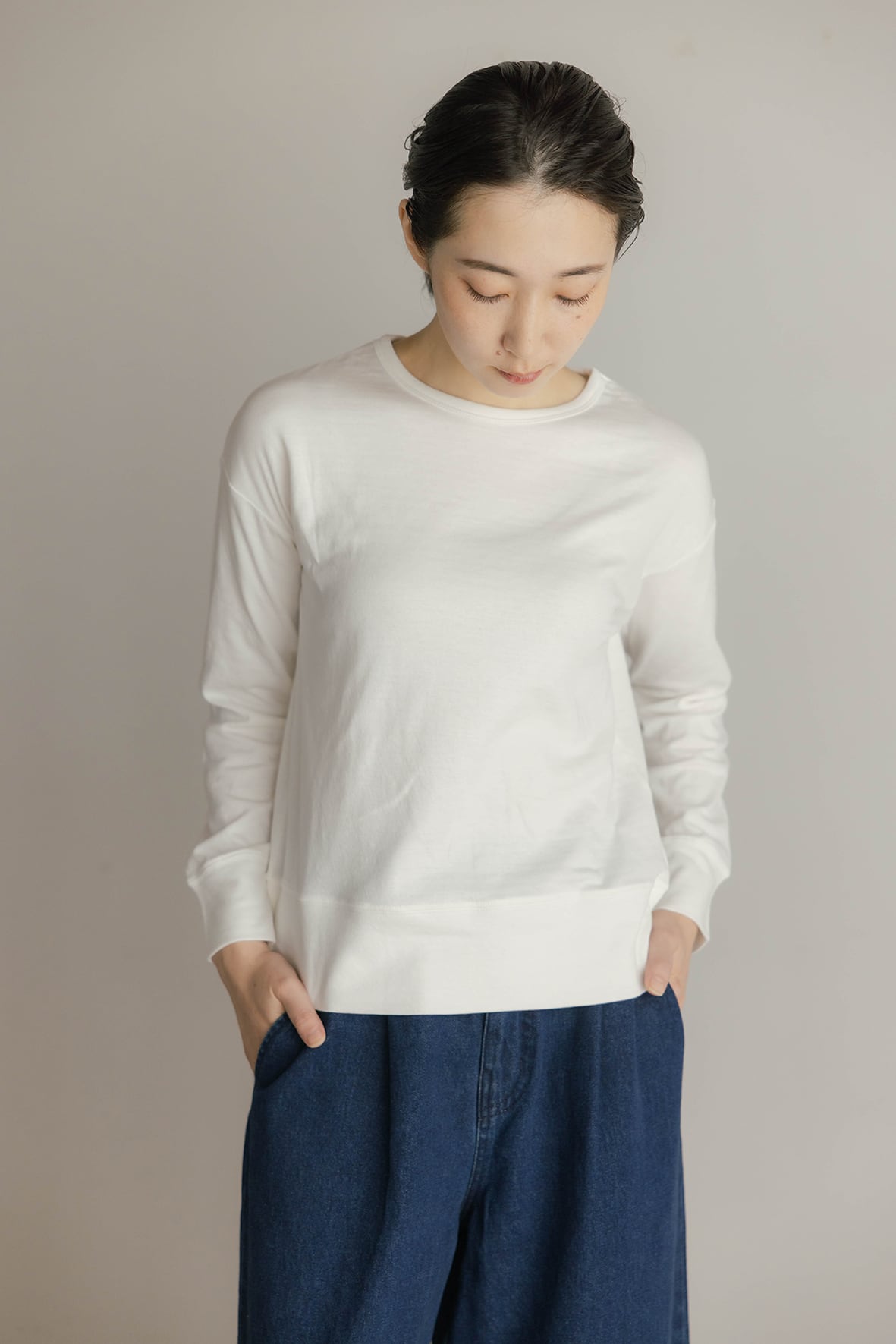 毎回好評のコットン接結天竺素材のクルーネックプルオーバーです。ドロップショルダーの身体に沿わない程よくゆとりのあるサイズ感で、袖口や裾のダブル巾が広めでしっかりしているので、1枚でも着用しやすいデザインです。ニットやベストのインナーに着るなど、春の重ね着に活躍する1枚です。
