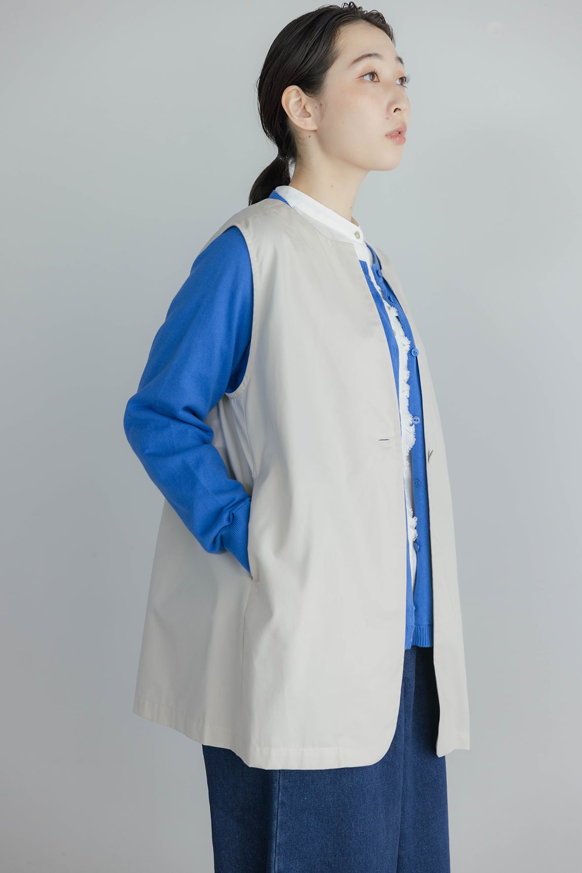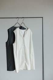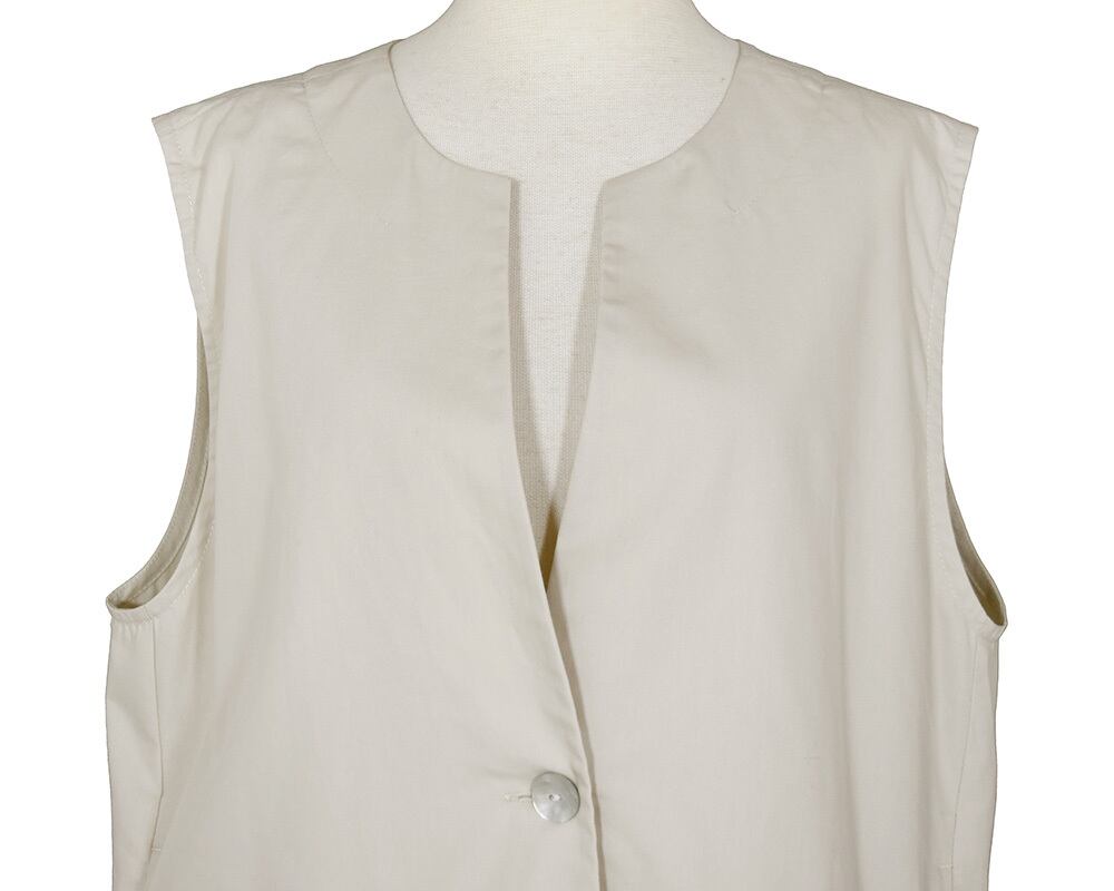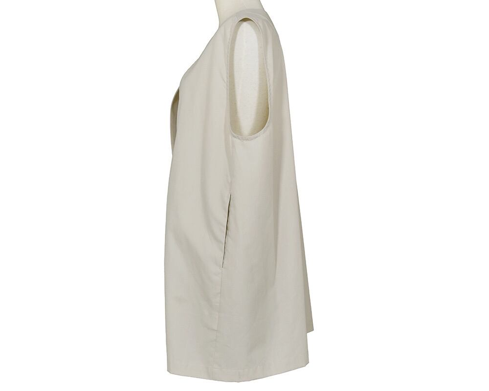 ノーカラーで上品な雰囲気に仕上げたジレです。すっきりとしたラインが気になる腰まわりを隠してくれます。着回しやすく、気温に合わせてインナーのトップスを変えることでロングシーズン活躍します。