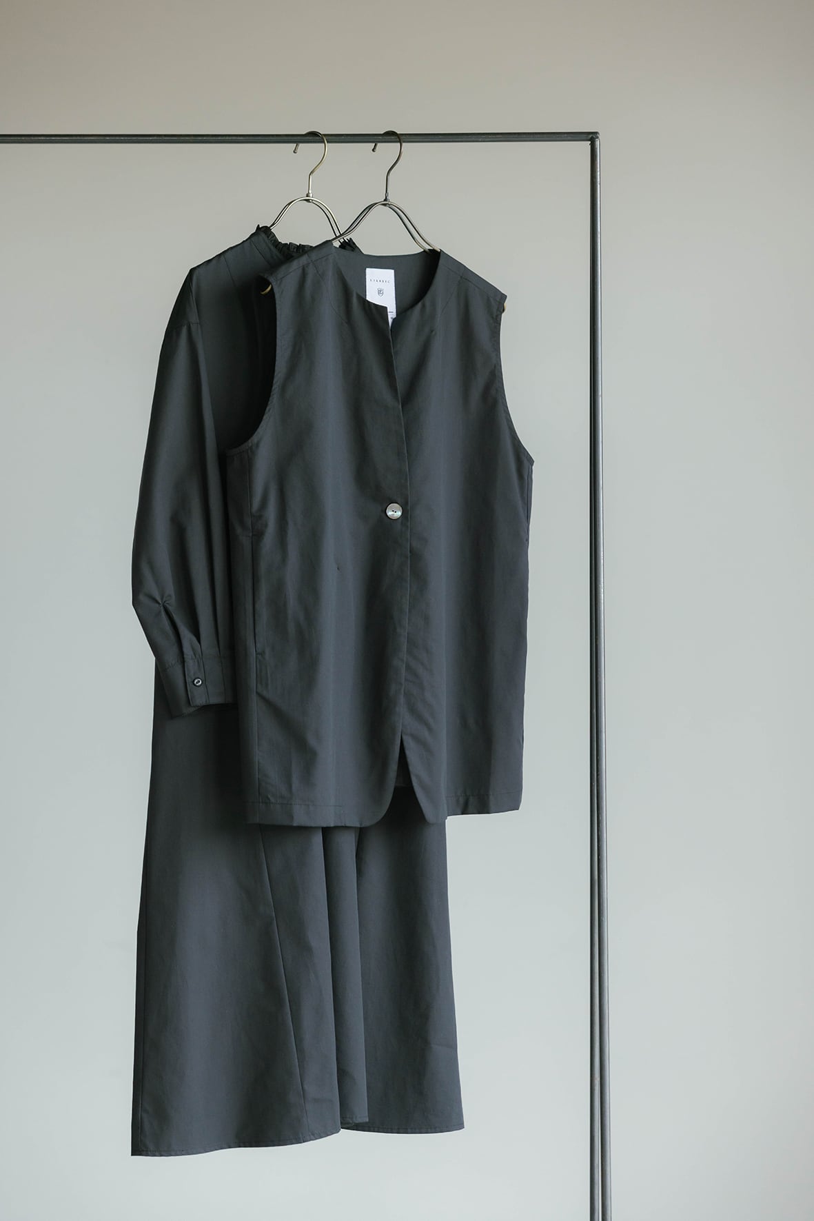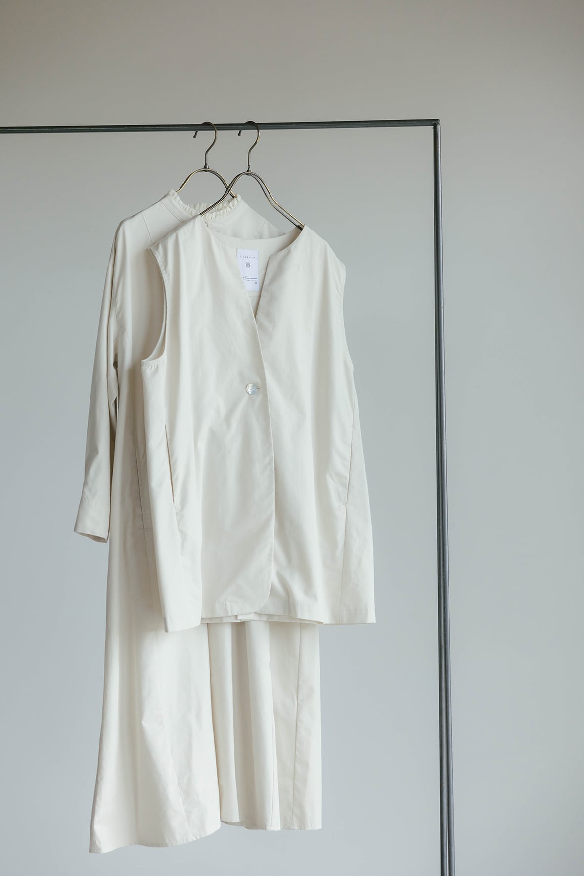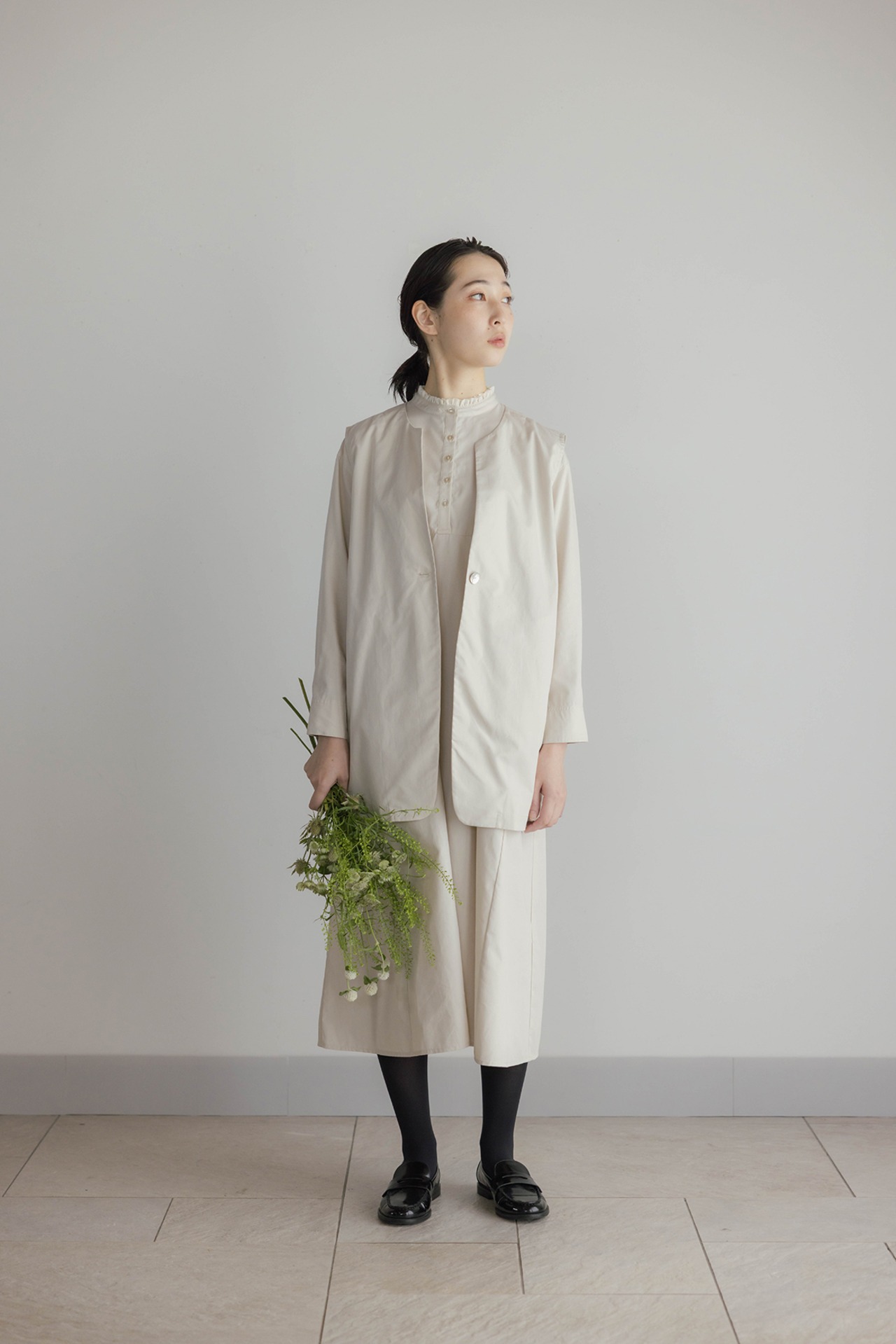 ノーカラーで上品な雰囲気に仕上げたジレです。すっきりとしたラインが気になる腰まわりを隠してくれます。着回しやすく、気温に合わせてインナーのトップスを変えることでロングシーズン活躍します。