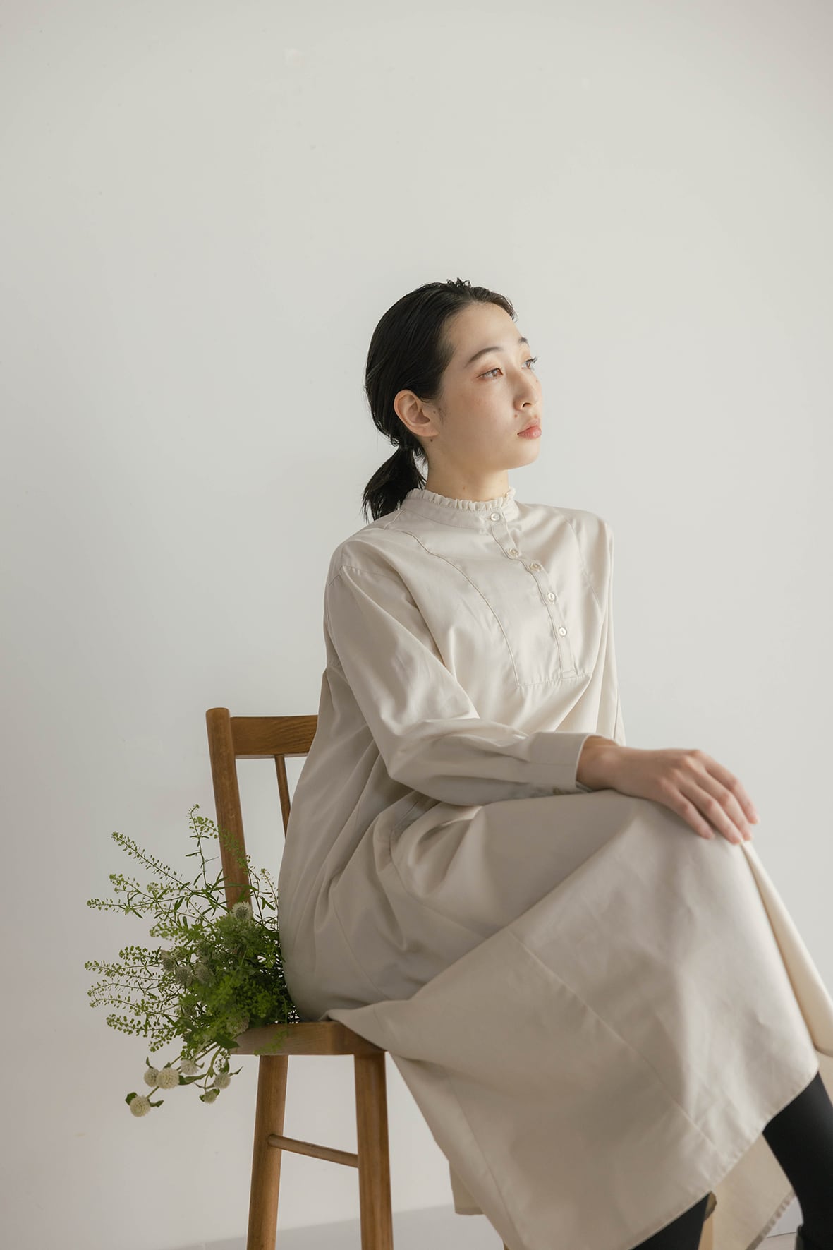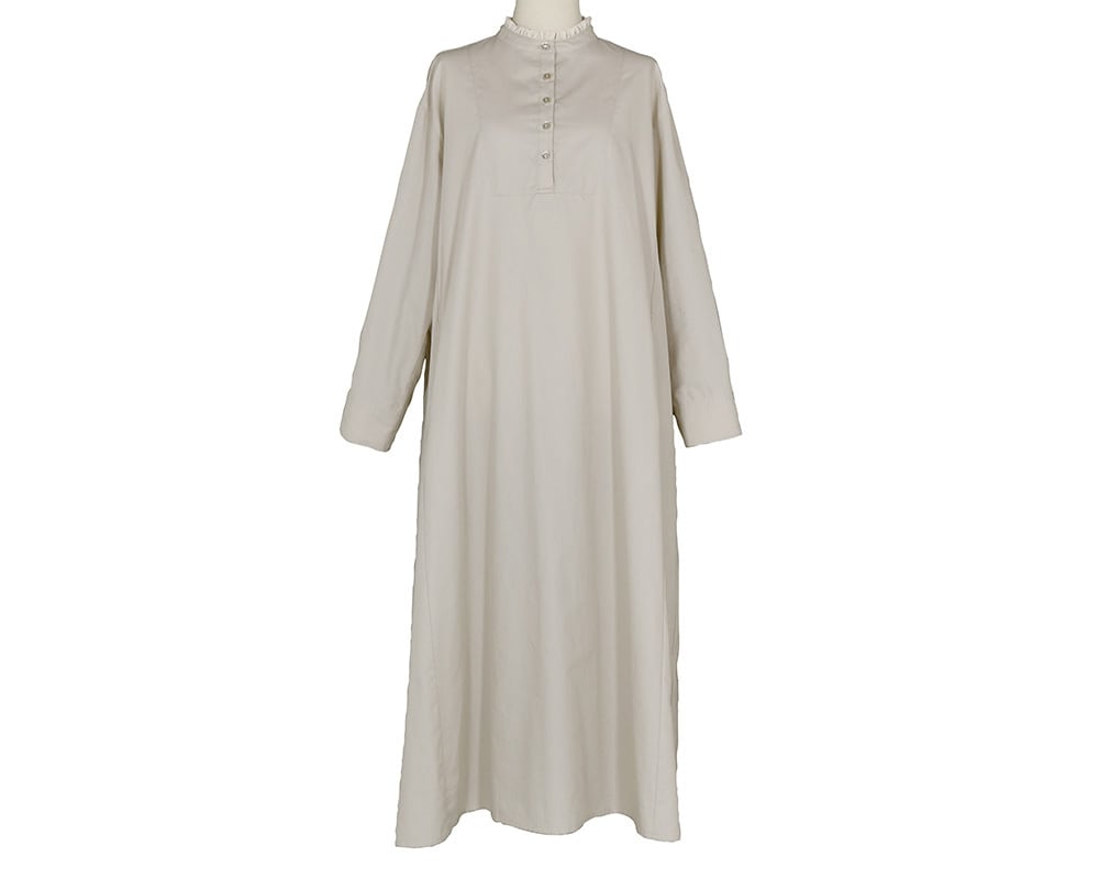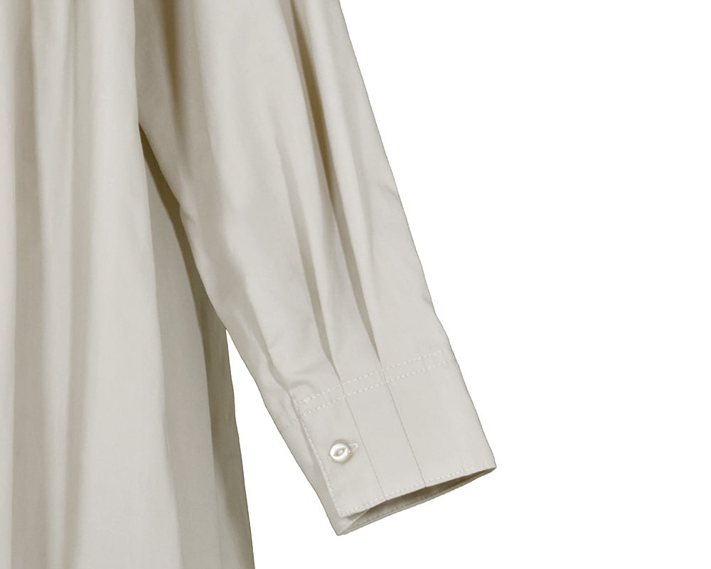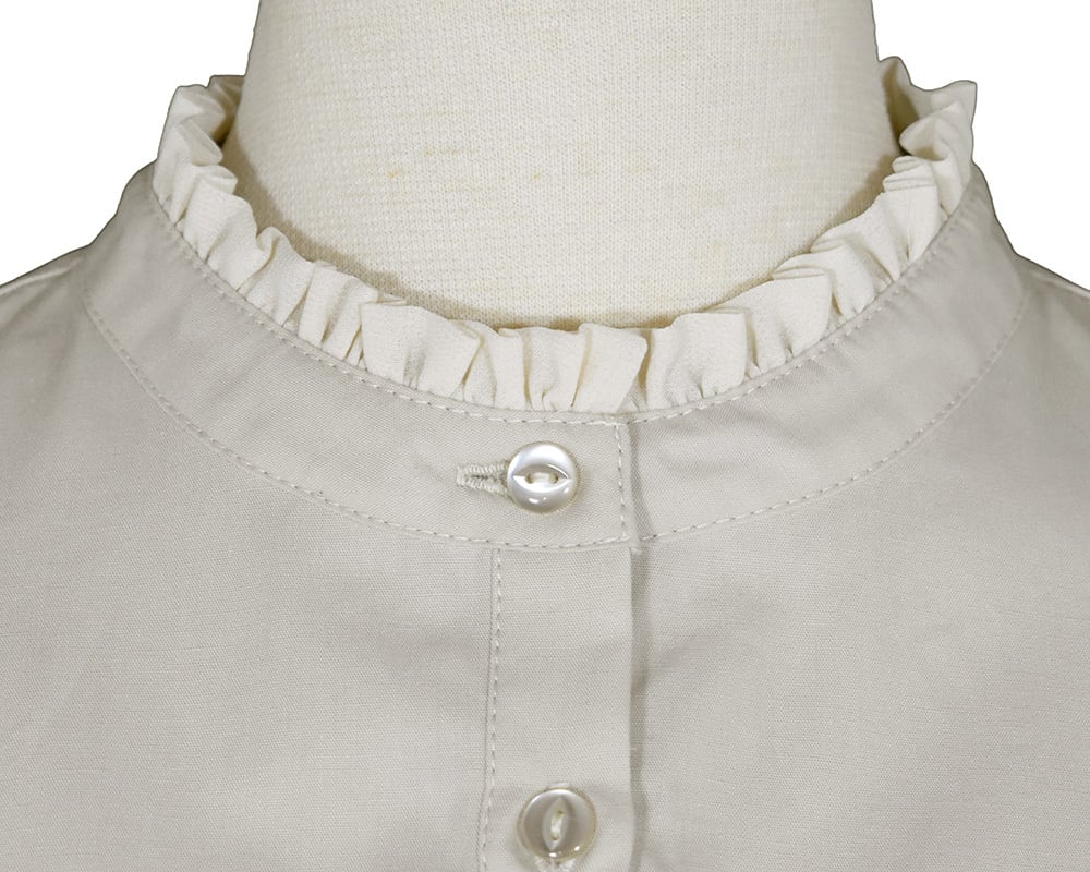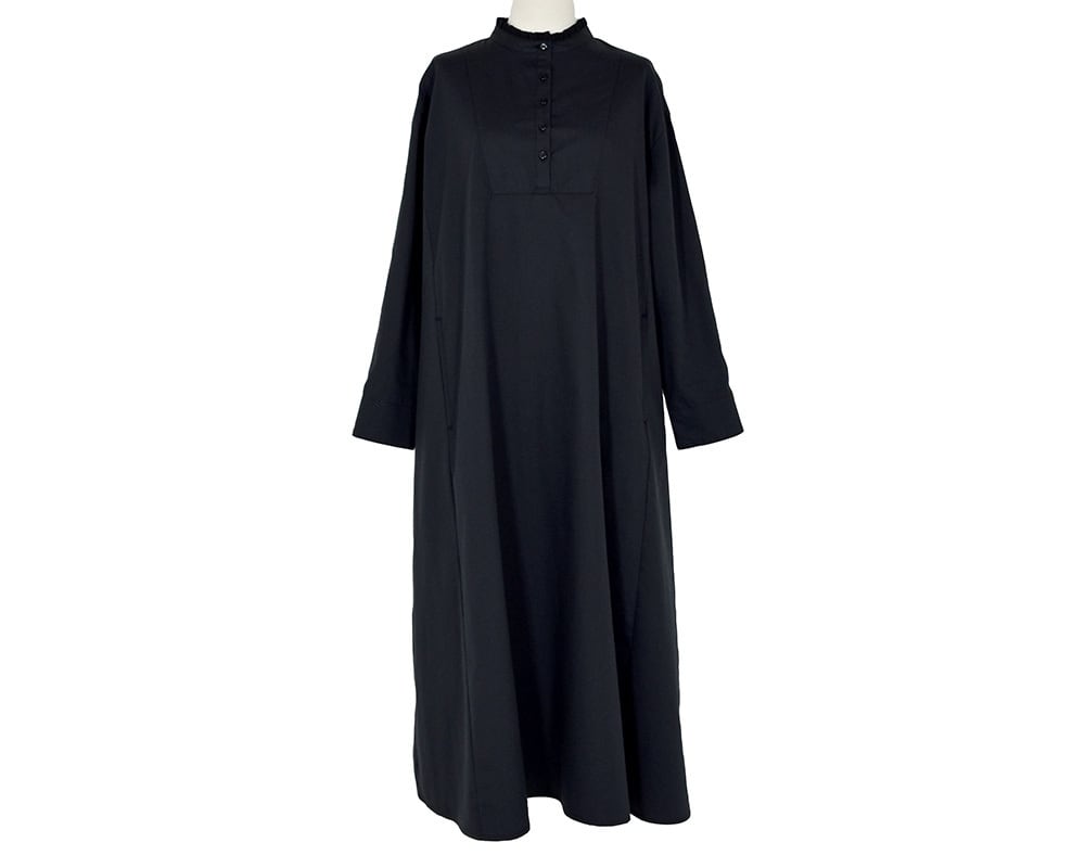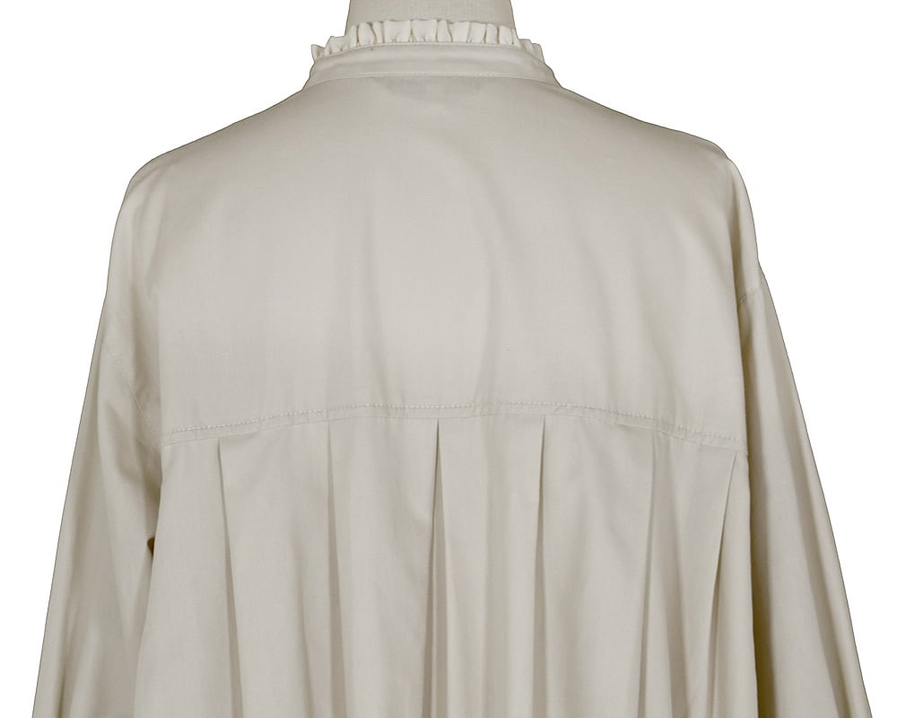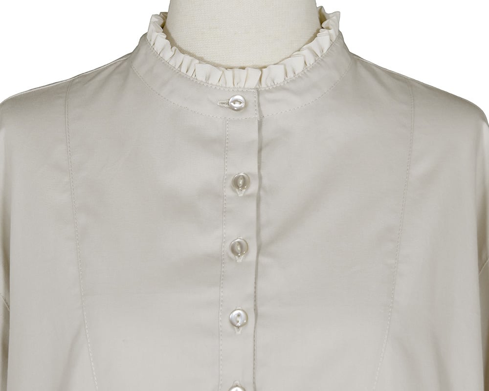 生地の分量感はありながらもスッキリと広がり過ぎないように仕上げています。衿のフリルがクラシカルな雰囲気を感じさせオケージョンのシーンでも着用できるアイテムです。