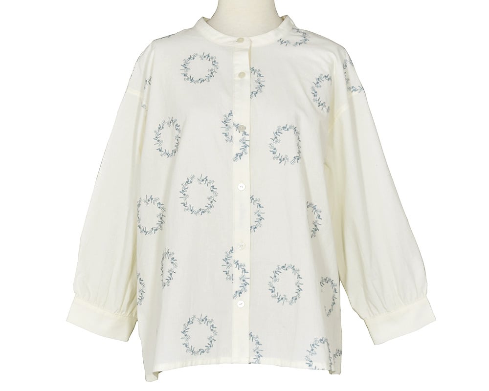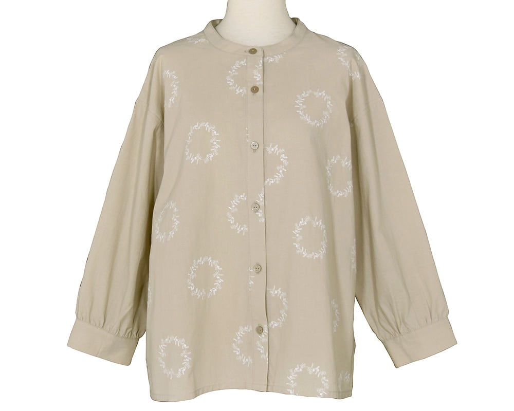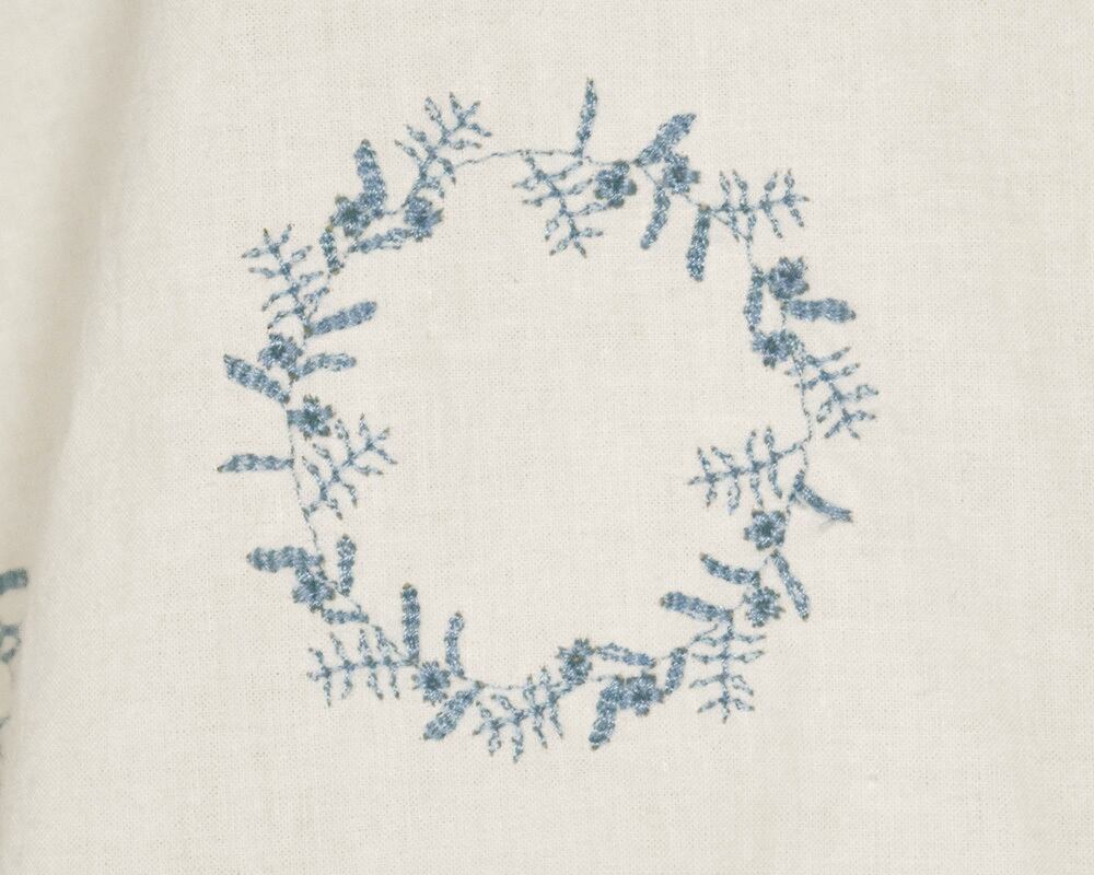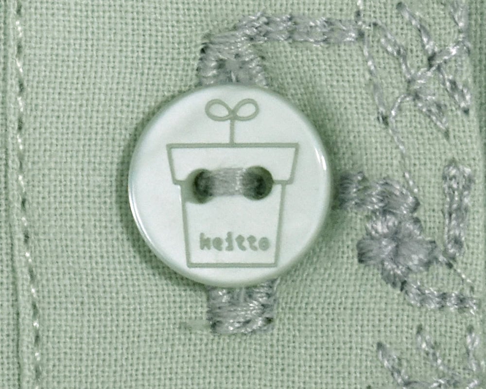 やわらかな綿素材に、庭に植えたローズマリーの刺繍をあしらいました。UVカット機能も備え、春夏の日差しの下(もと)でも安心して着られます。植木鉢をモチーフにした彫り柄ボタンを添え、家庭菜園のたのしさを感じられるワンポイントにしました。