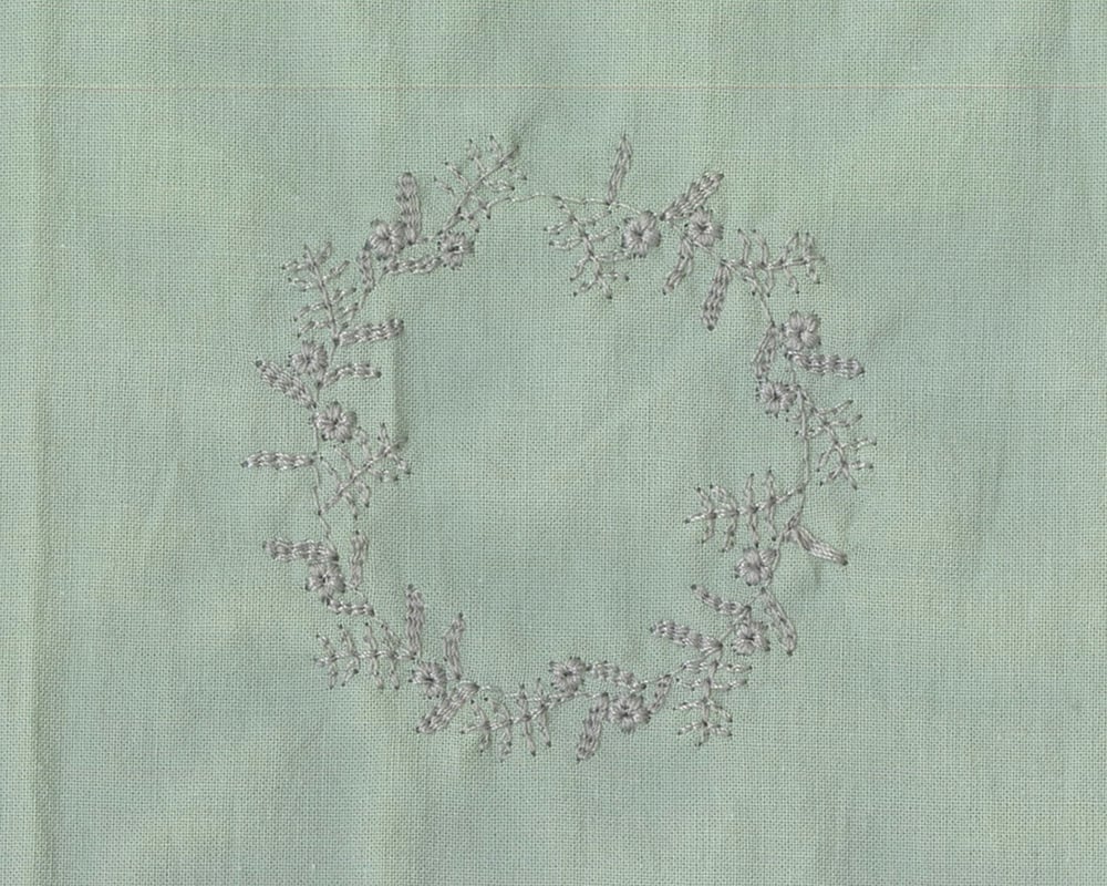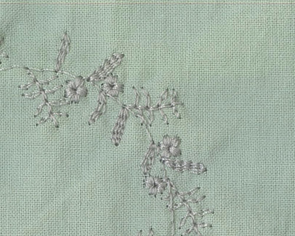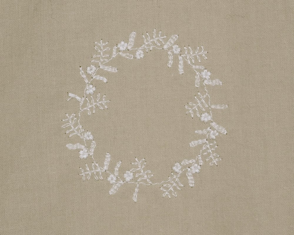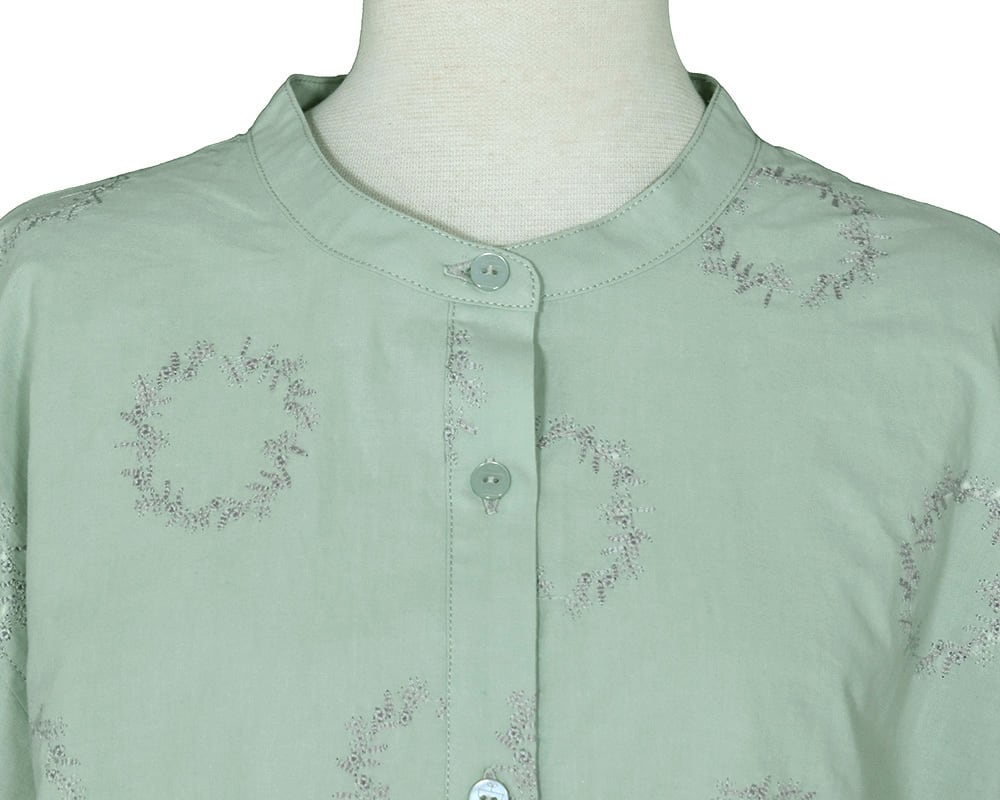やわらかな綿素材に、庭に植えたローズマリーの刺繍をあしらいました。UVカット機能も備え、春夏の日差しの下(もと)でも安心して着られます。植木鉢をモチーフにした彫り柄ボタンを添え、家庭菜園のたのしさを感じられるワンポイントにしました。