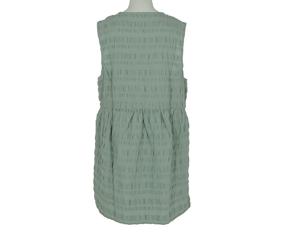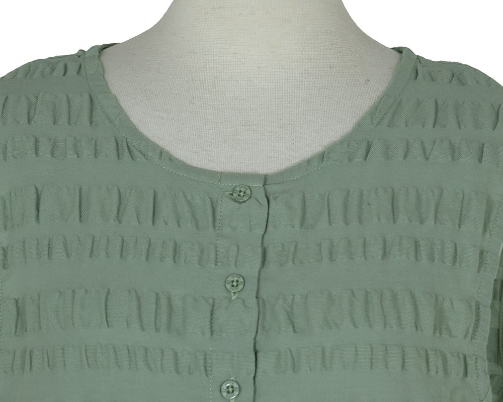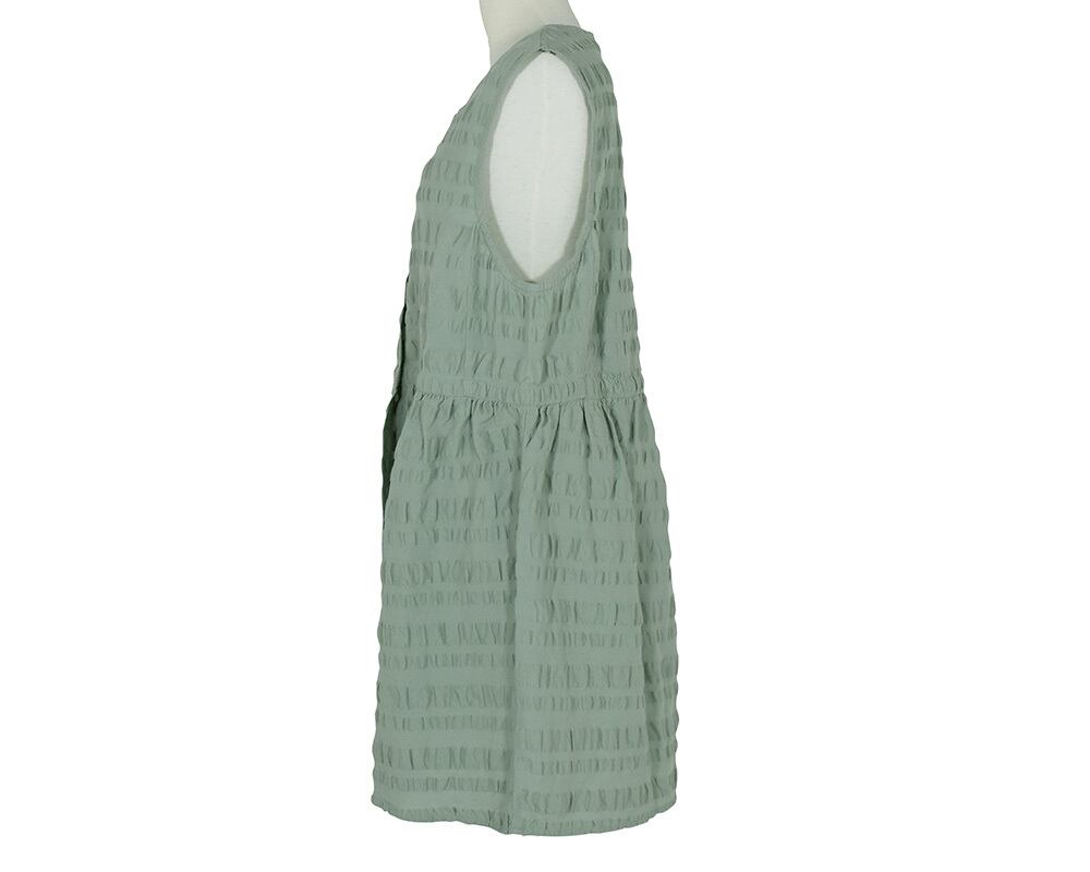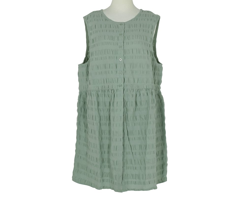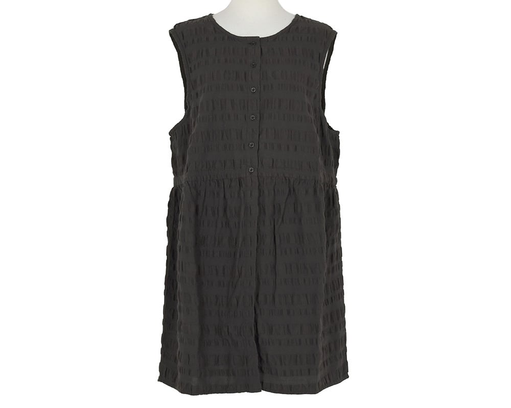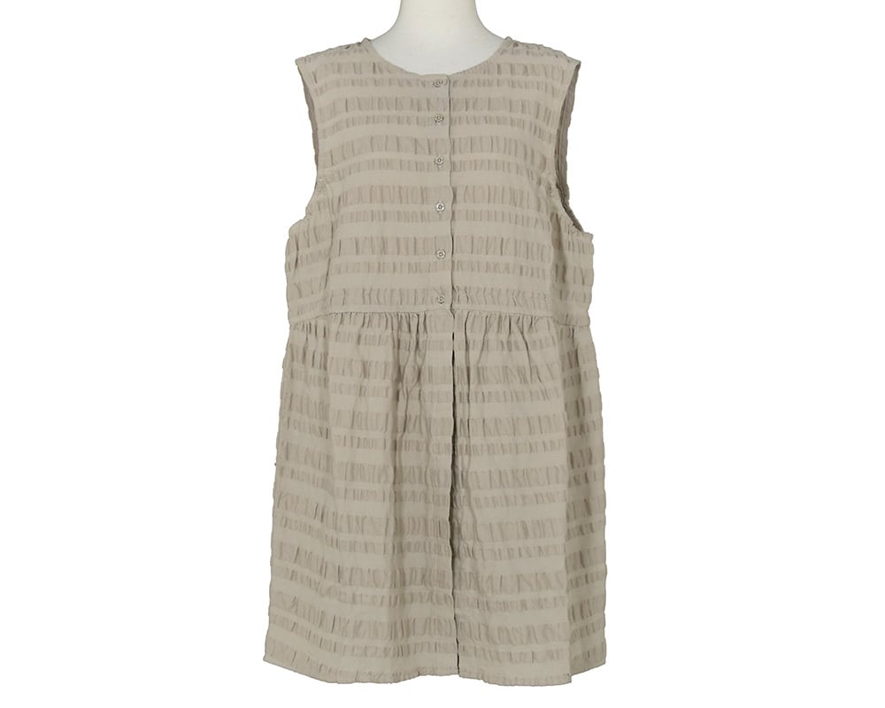 重ね着で長い季節楽しめるノースリーブチュニックです。ほどよいハリとやさしい凸凹感のある生地で、軽く着ていただける着心地です。フロントには、バースデーケーキをイメージした彫柄ボタンをつけました。