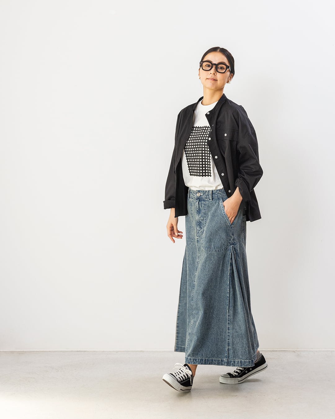 ほどよいハリのある生地なので、シャツとしてもライトアウターとしても使える一枚です。