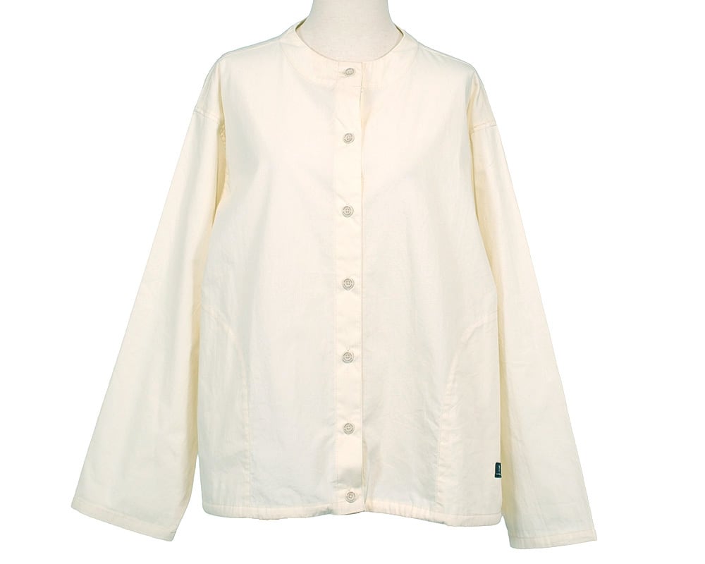 綿素材を使用し、一枚着としても羽織としても活躍するシャツ。 裾のドローストリングでシルエットを調整でき、ふんわりとした丸みのあるフォルムにも、すっきりとしたストレートラインにもアレンジ可能です。 衿ぐりは低めのボトルネックに仕立て、首元をさりげなくカバー。 刻印入りのボタンや大きめのポケットがアクセントとなり、実用性も兼ね備えています。 デニムやワイドパンツとの相性も良く、季節の変わり目便利な一枚です。