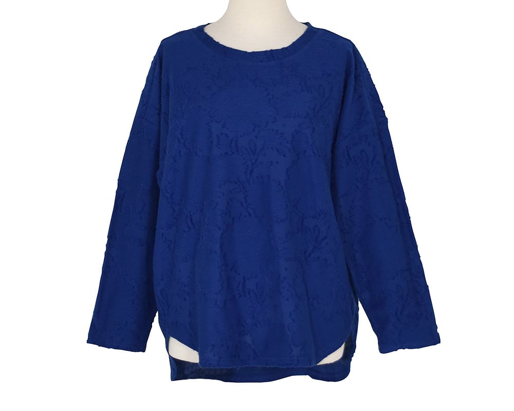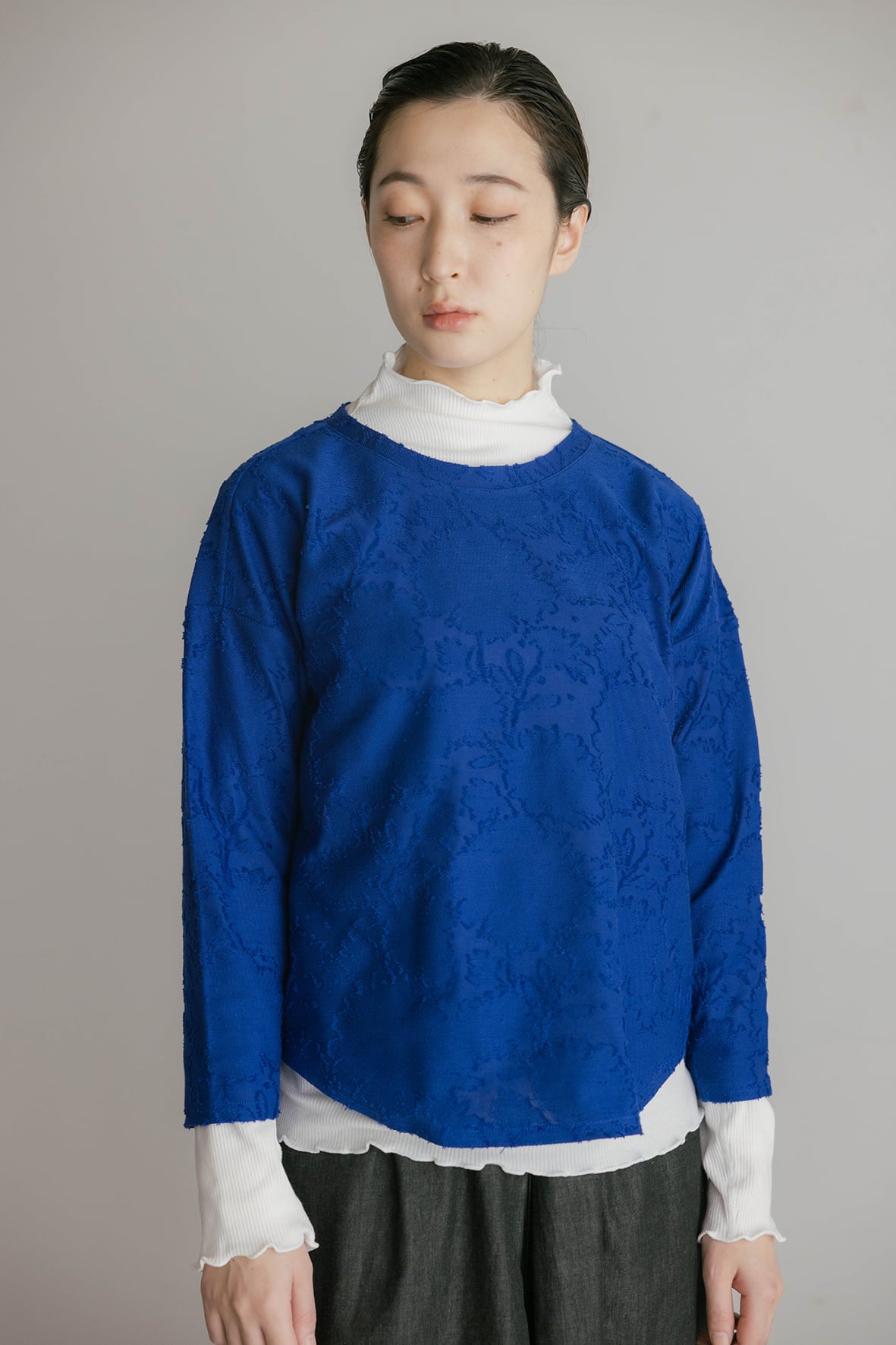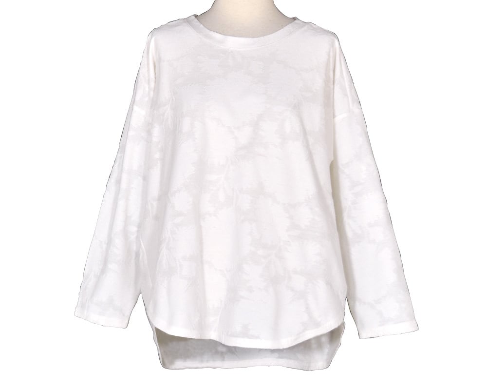 表情のある印象に仕上げたジャカードのロングTシャツです。ラインを拾いにくい程よいゆるさと、ラウンドヘムにより、一枚でも自然に着こなせるバランスに仕上げました。カジュアルからきれいめまで幅広いスタイリングに対応するアイテムです。透け感とコットンのマットな質感が特徴の、立体的なガーベラモチーフのカットジャカード素材です。