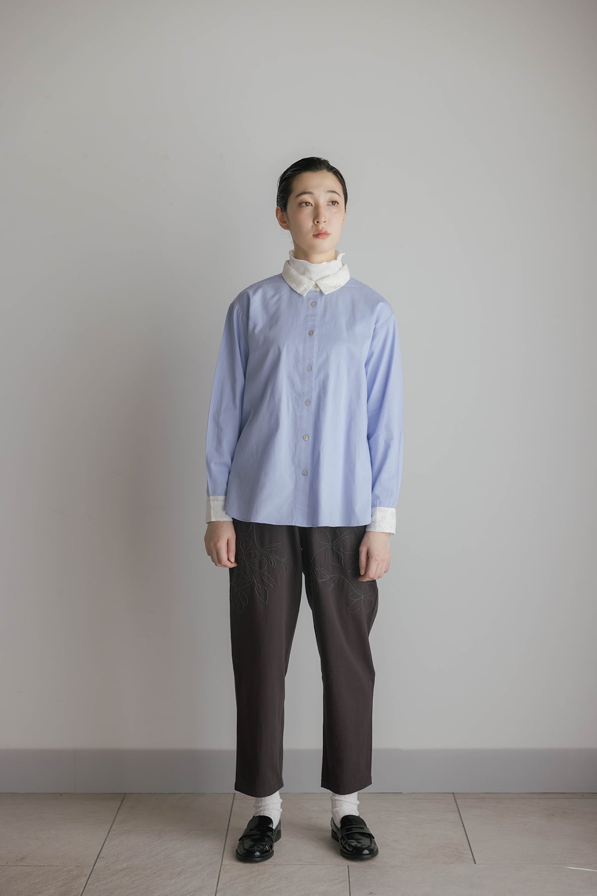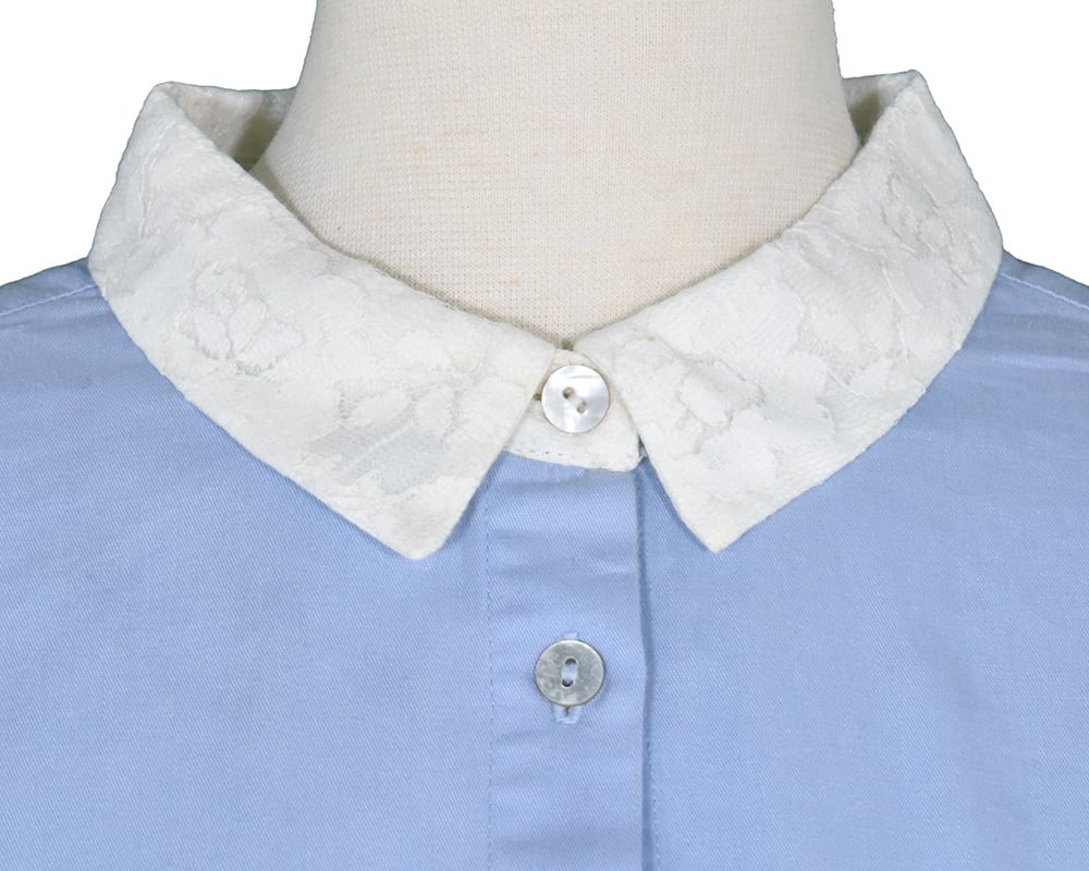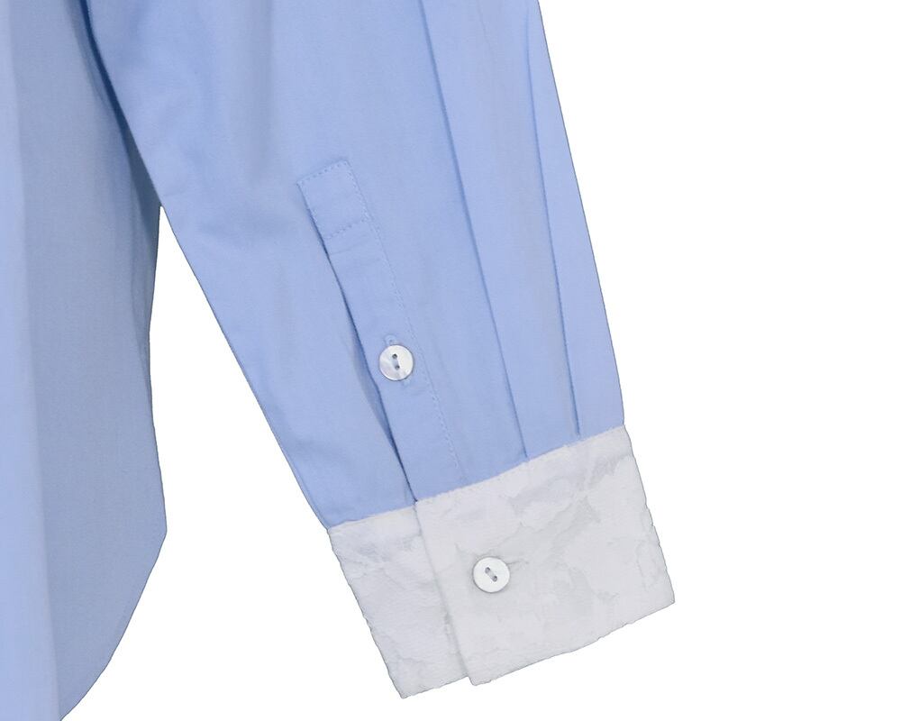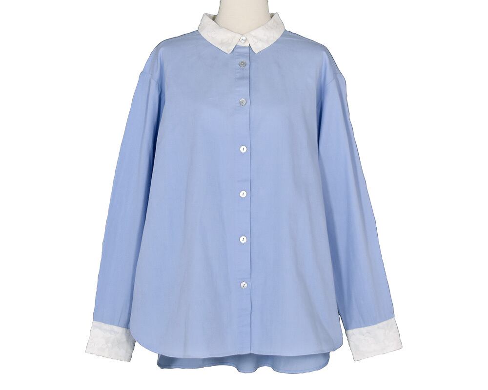 襟とカフスのレースがポイントのブラウスです。甘さ控えめなレースが上品な印象にしてくれます。#グレーと#ライトブルーはクレリック配色で、スタイリングにさりげなくアクセントをつけてくれるアイテムです。洗いざらしのナチュラルな風合いのコットンツイル素材に、衿とカフスにはコットンミックスのレース素材を重ねています。