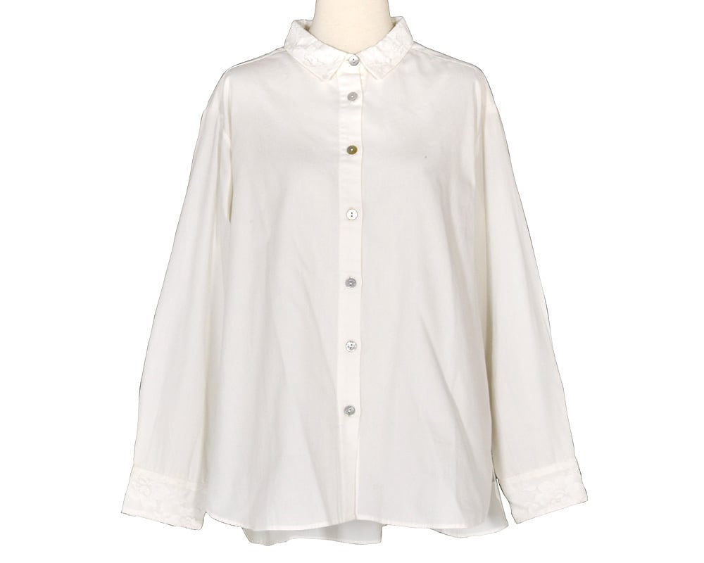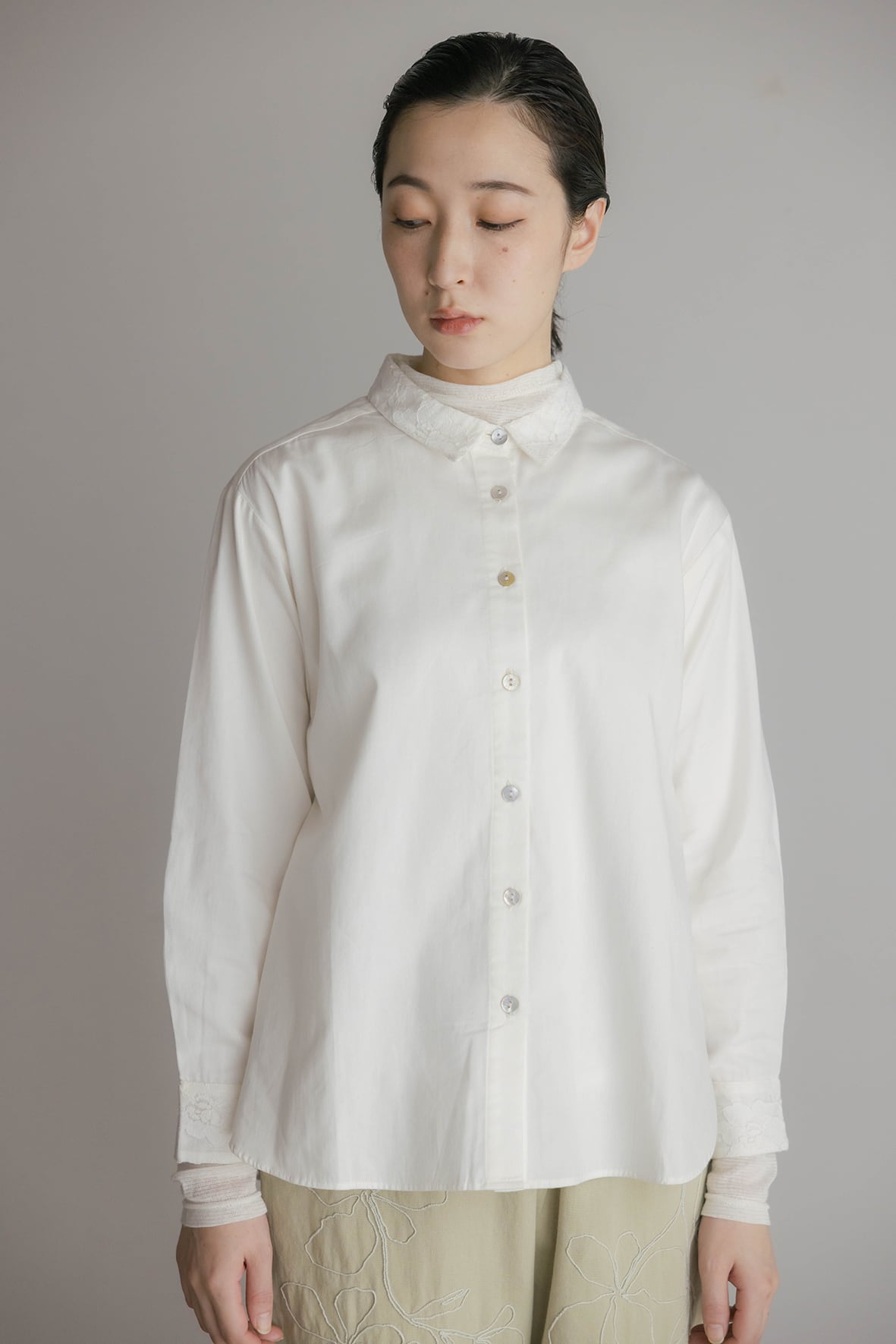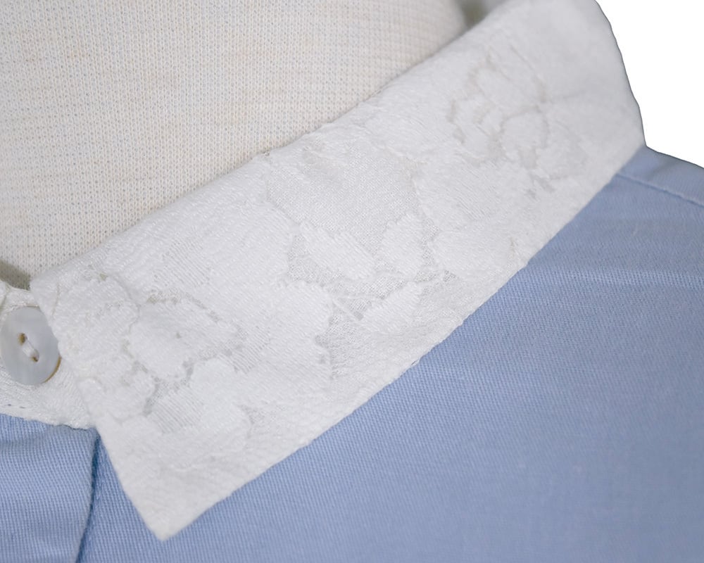 襟とカフスのレースがポイントのブラウスです。甘さ控えめなレースが上品な印象にしてくれます。#グレーと#ライトブルーはクレリック配色で、スタイリングにさりげなくアクセントをつけてくれるアイテムです。洗いざらしのナチュラルな風合いのコットンツイル素材に、衿とカフスにはコットンミックスのレース素材を重ねています。