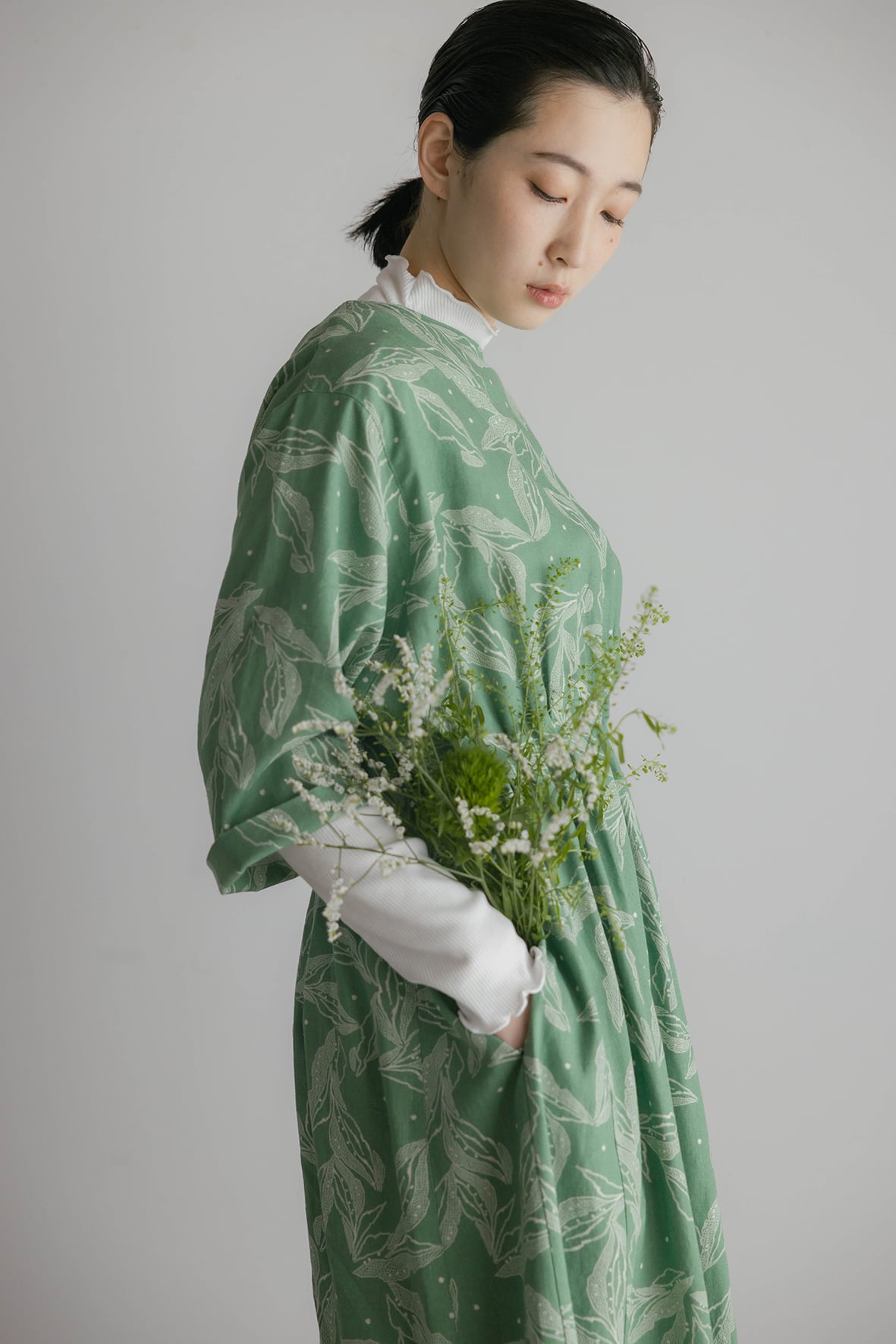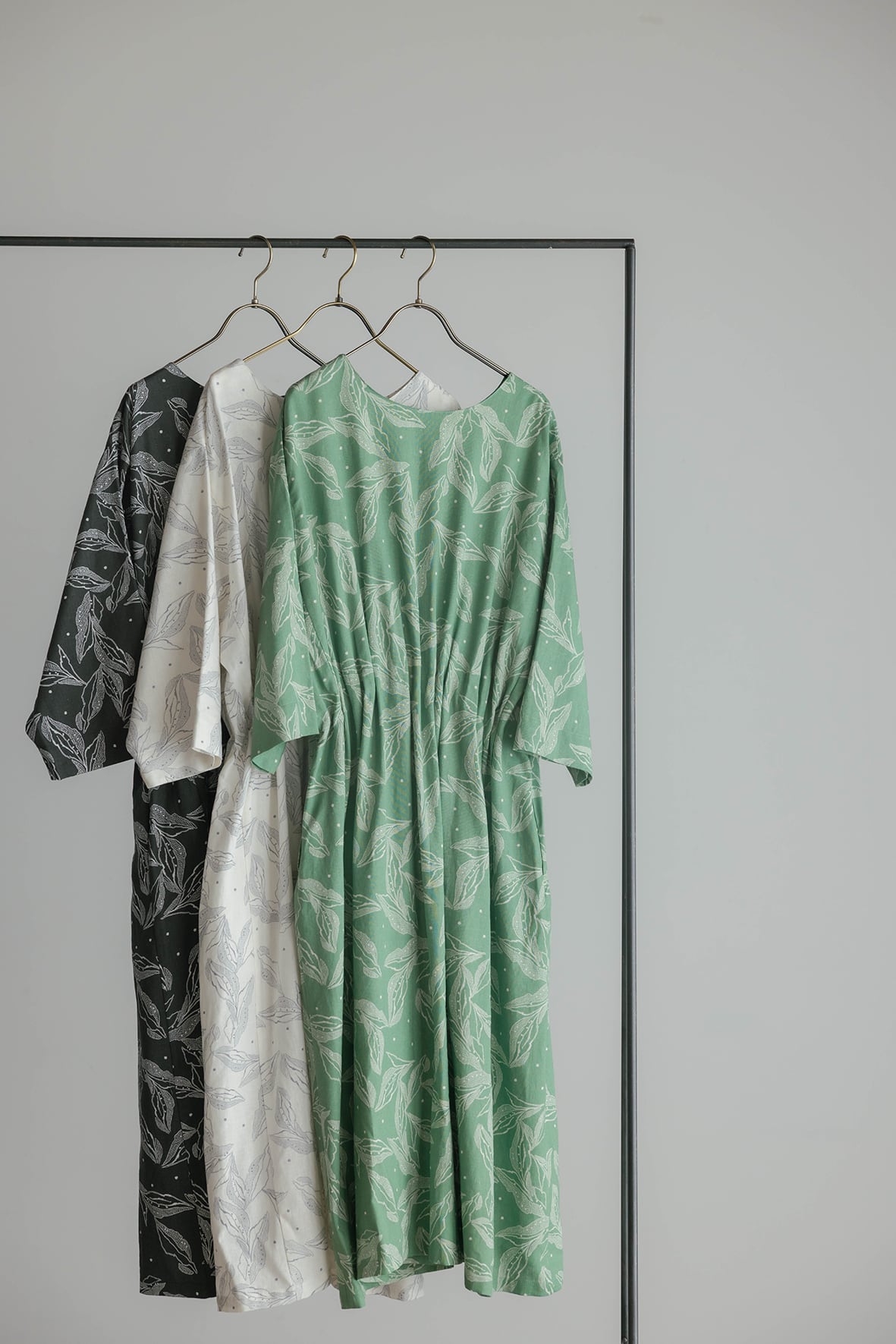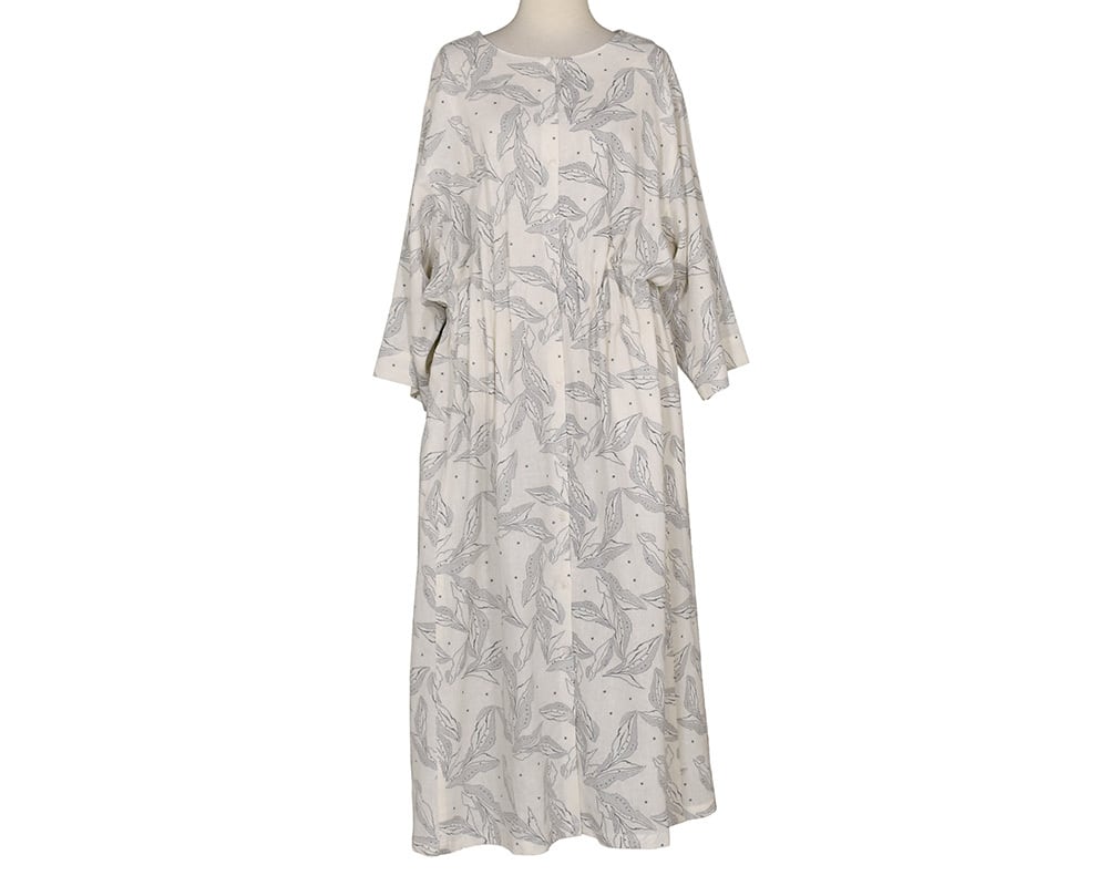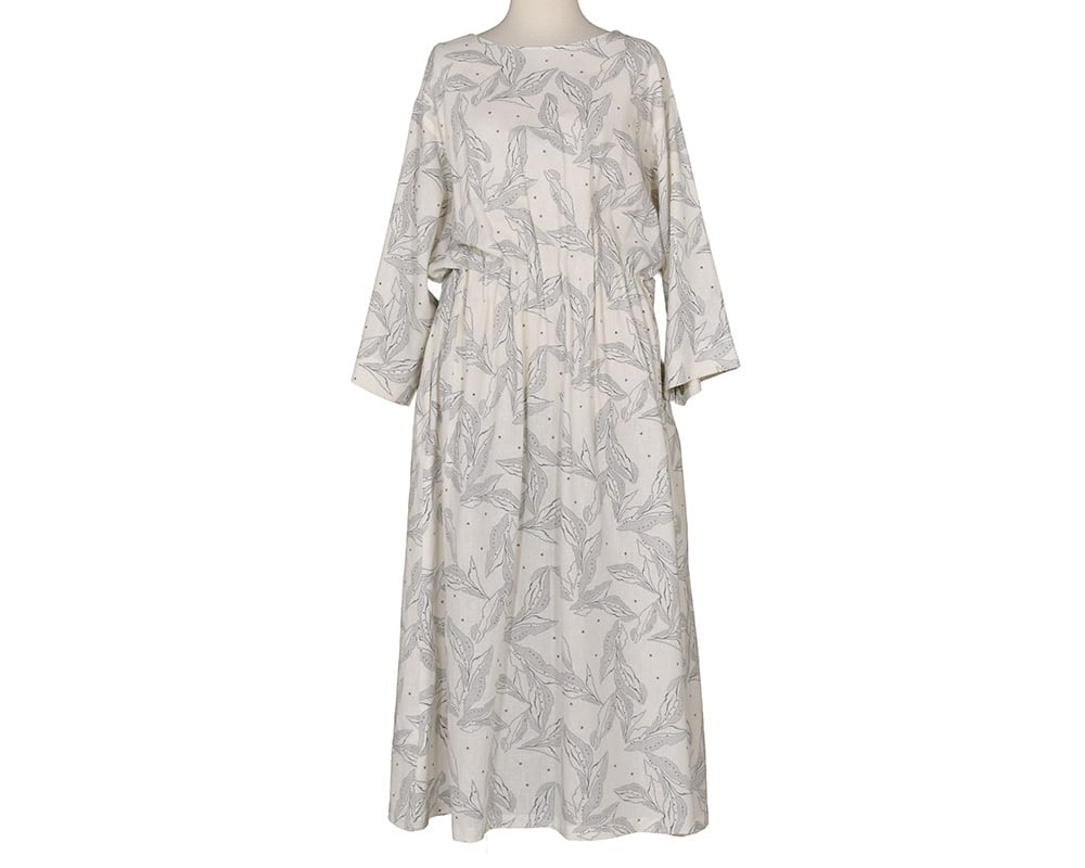 レーヨンリネンに繊細なリーフ柄をプリントしたワンピースです。前後どちらでも着用でき、羽織りとしても活躍します。ウエストはゴムタック仕様で締め付け感がなく、快適な着心地です。両脇ポケット付き。リーフモチーフを刺繍タッチで描いたプリントで、とろみのある柔らかな風合いが特徴のレーヨンリネン素材です。