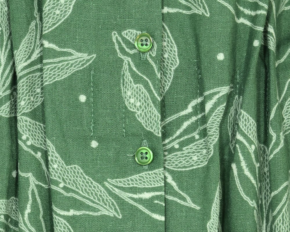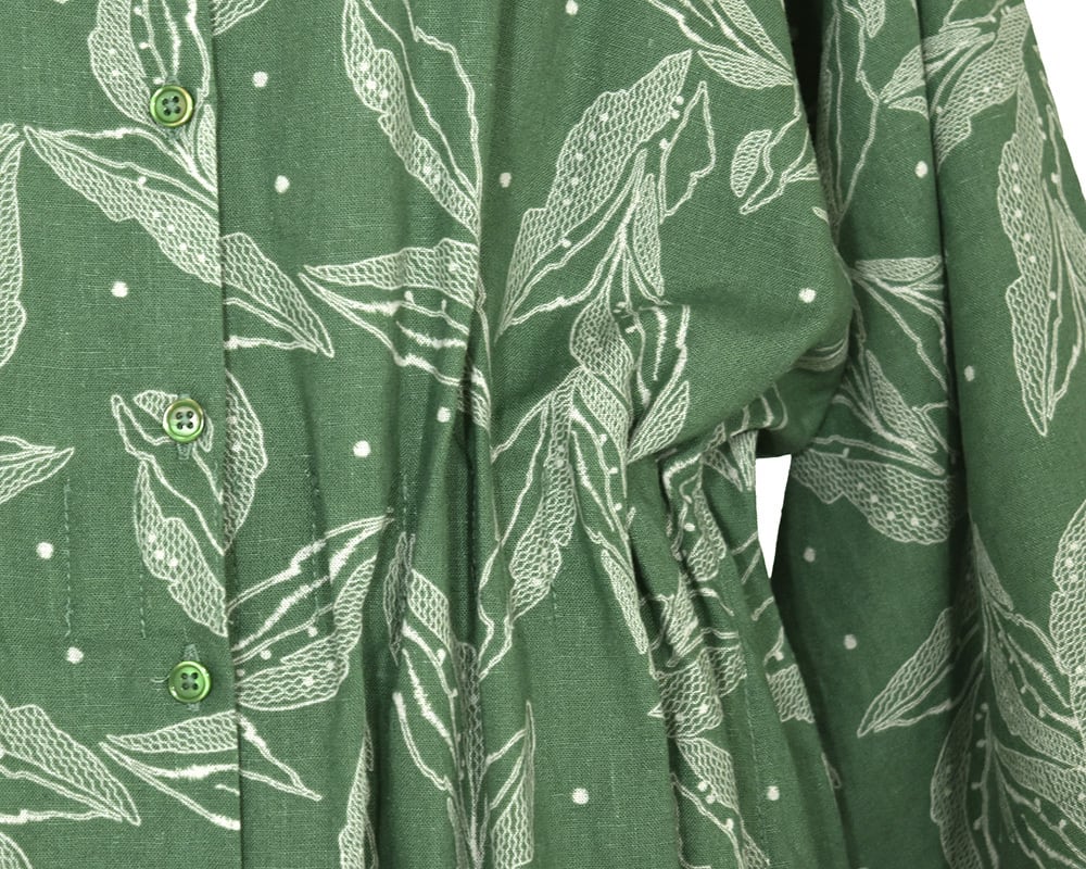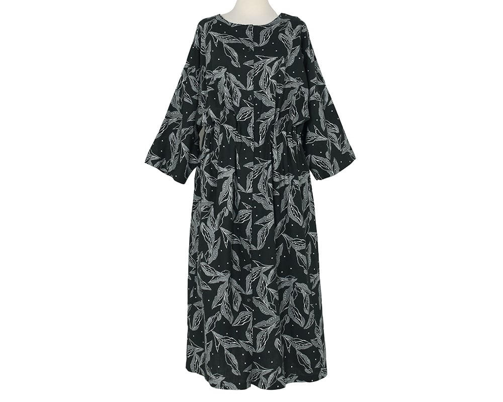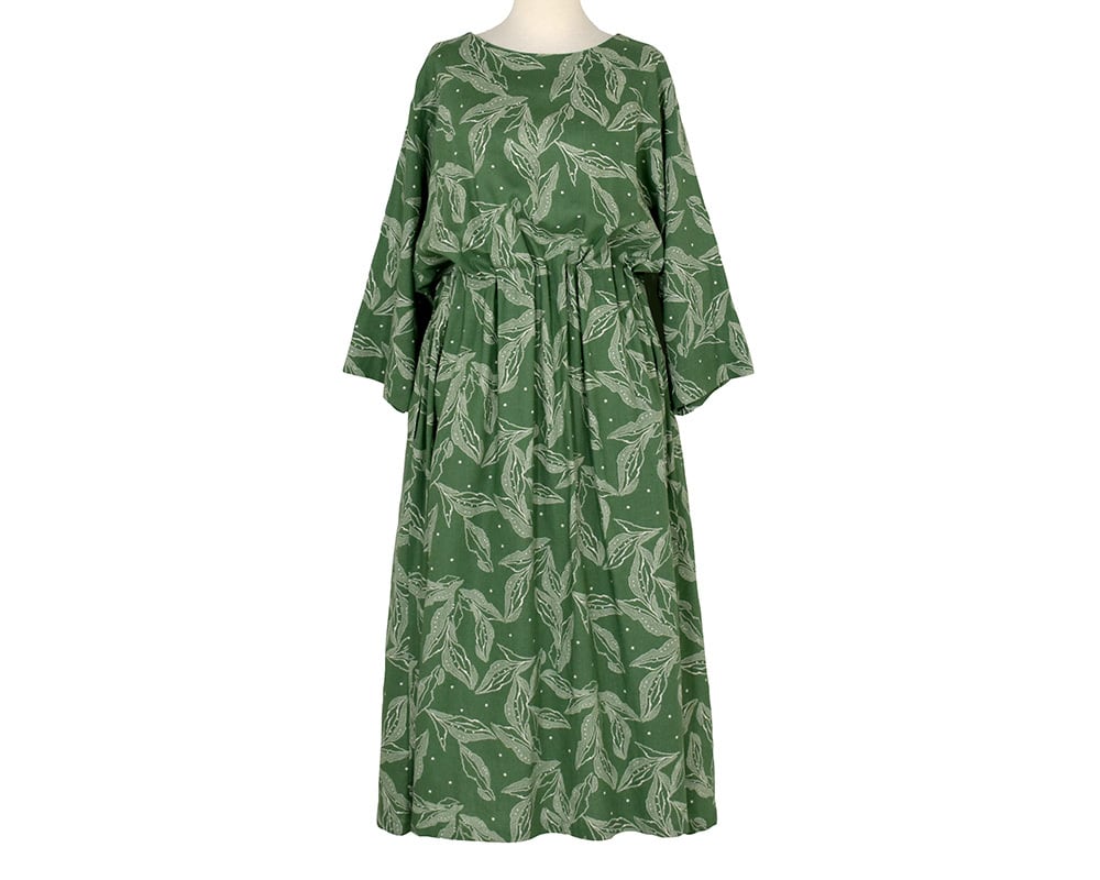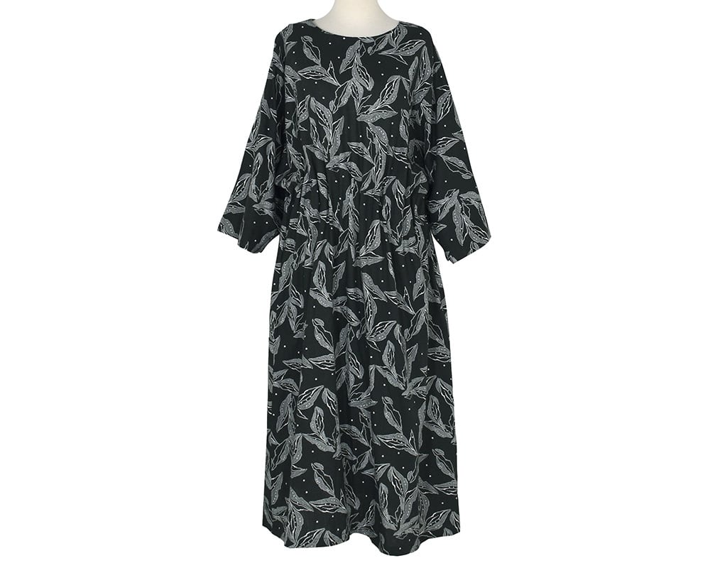レーヨンリネンに繊細なリーフ柄をプリントしたワンピースです。前後どちらでも着用でき、羽織りとしても活躍します。ウエストはゴムタック仕様で締め付け感がなく、快適な着心地です。両脇ポケット付き。リーフモチーフを刺繍タッチで描いたプリントで、とろみのある柔らかな風合いが特徴のレーヨンリネン素材です。