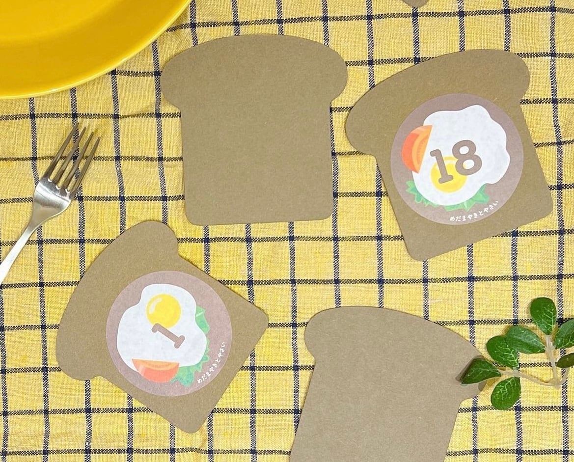 可愛い食パン型の台紙に1~31までの番号シールを貼って木の台座に置いたら日めくりカレンダーのできあがり。食パンメニューの絵柄で神経衰弱としても遊べます。