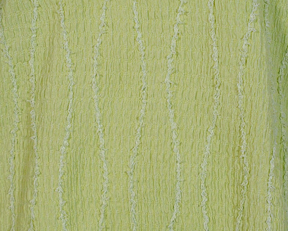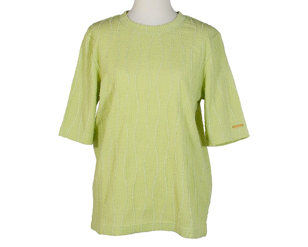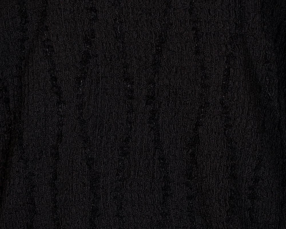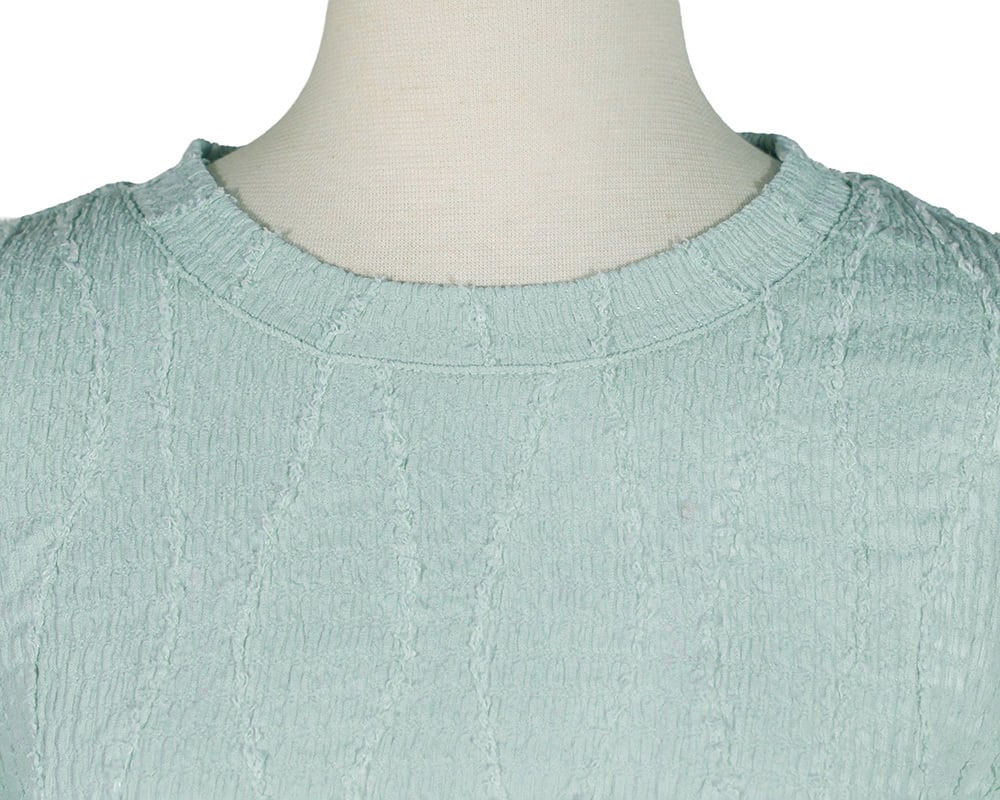 インナーにもおすすめのコンパクトなシルエットのカットプルオーバーです。白樺の並木のような、樹皮のような、表情のあるシャーリング生地を使用しています。身頃の模様に合わせて、白樺の葉をモチーフにしたプレートをつけました。