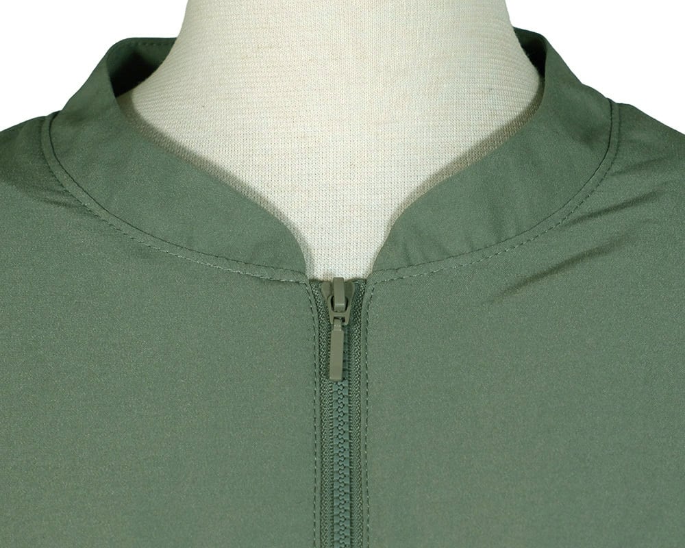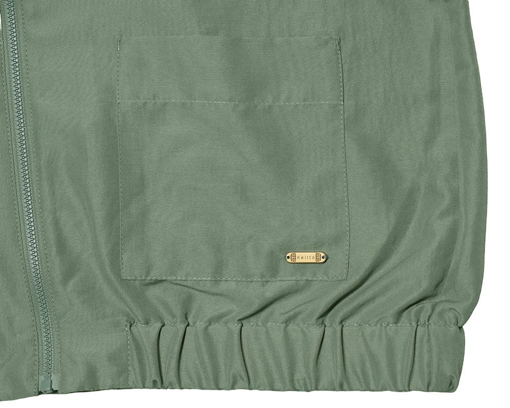 普段使いからフォーマルまで、幅広く活躍するジップあきブルゾンです。軽やかなポリエステル素材で、自然な風合いに仕上げています。新緑の季節の葉っぱのモチーフをあしらったプレートをつけました。